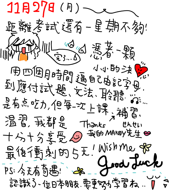 這幾個月真的去過不同的咖啡室溫習… Mc Cafe, Starbucks, Snoopy Cafe… 等等… 可能某天在Cafe 見到有個在溫習日文的四眼女孩子.. 會是我呢! xDD 嘿!!