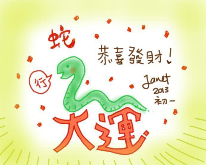 10 二月, 2013 我手畫我心 出門拜年前畫一張 Posted by Janet* 大年初一,送條可愛的蛇給各位!恭喜發財!心想事成! 分享此文:共享 按一下以分享至 Facebook(在新視窗中開啟) Facebook 按一下即可分享至 X(在新視窗中開啟) X 分享到 Pinterest(在新視窗中開啟) Pinterest 喜歡 正在載入... 相關
