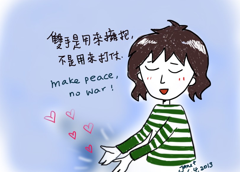 7 四月, 2013 我手畫我心 雙手擁抱 Posted by Janet* 好久沒用畫板畫畫。 昨晚睡前,趁黄老公在看 DVD,便畫了一張。 希望大家都喜歡這幅畫的訊息。 MAKE PEACE, NO WAR! http://www.facebook.com/fantasimoon 分享此文:共享 按一下以分享至 Facebook(在新視窗中開啟) Facebook 按一下即可分享至 X(在新視窗中開啟) X 分享到 Pinterest(在新視窗中開啟) Pinterest 喜歡 正在載入... 相關