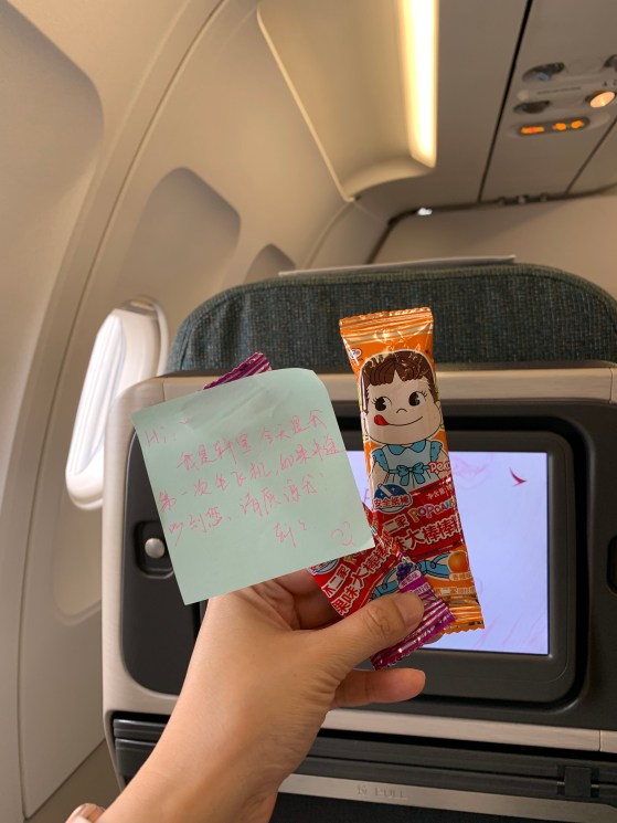 (在航班上遇上第一次坐飛機的嬰兒,BB 的媽媽為同艙的乘客送上小禮物和紙條希望大家能體諒。最後,那BB 是幾乎沒哭過!!)