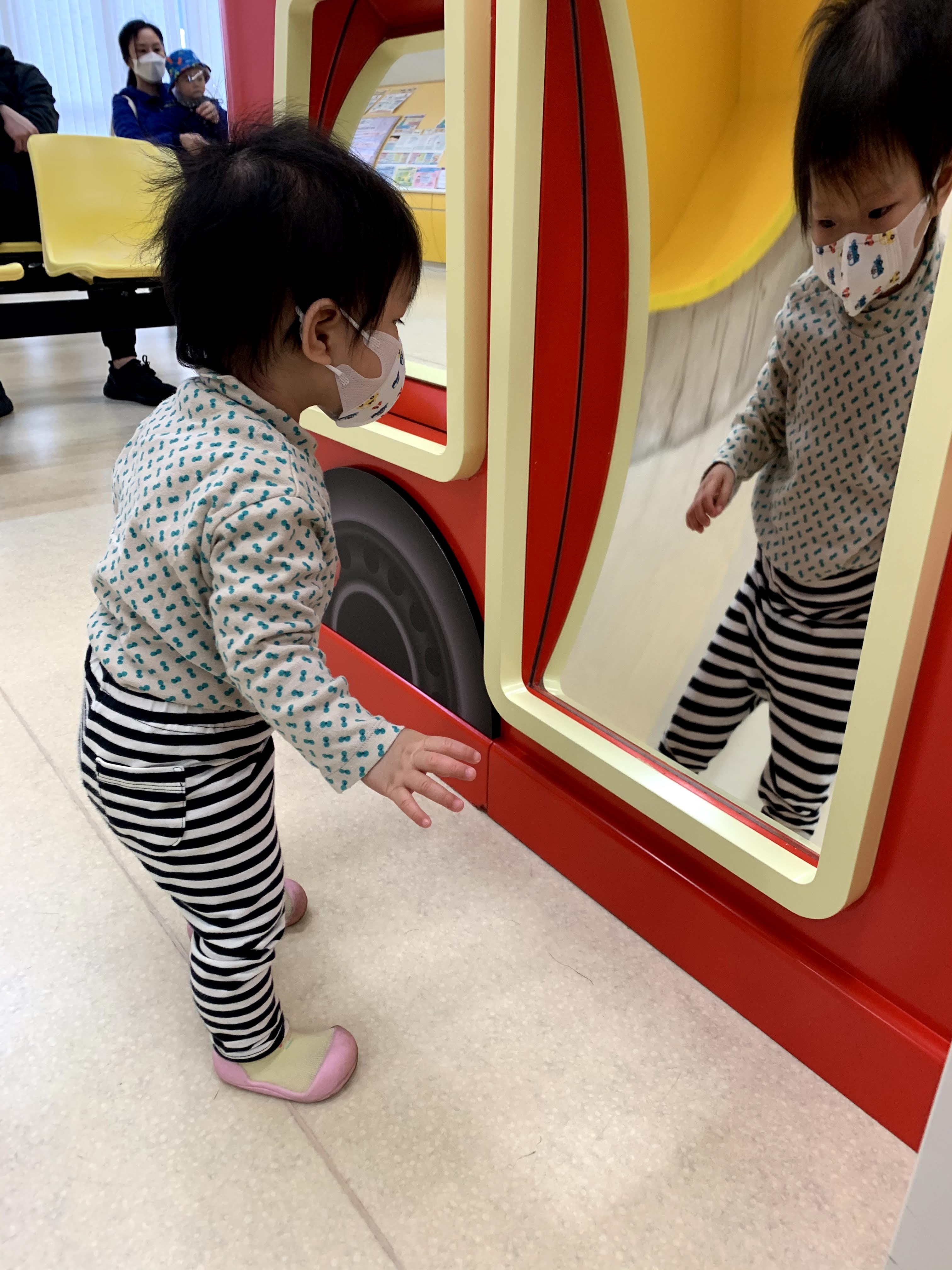 今次一歲,帶她輕鬆好多呢!因為她已經很想走路,拖著手時她是走得不錯。啦啦也對別的小朋友很好奇,好想玩。而且她算晚起床,9:35am 我才叫她起床(預約了 10:15am,不得不起床喇啦小朋友)。睡夠,心情好,定律。