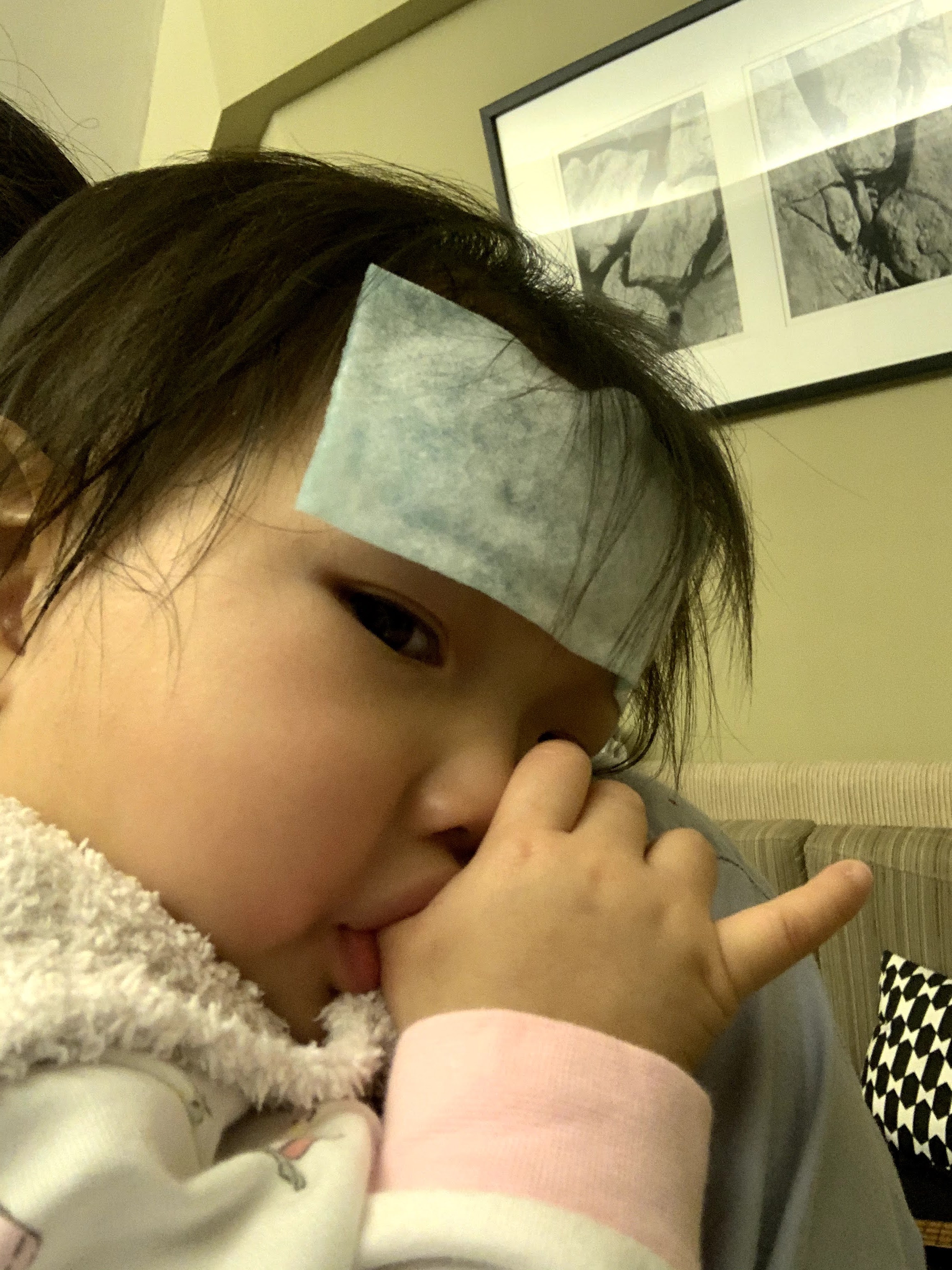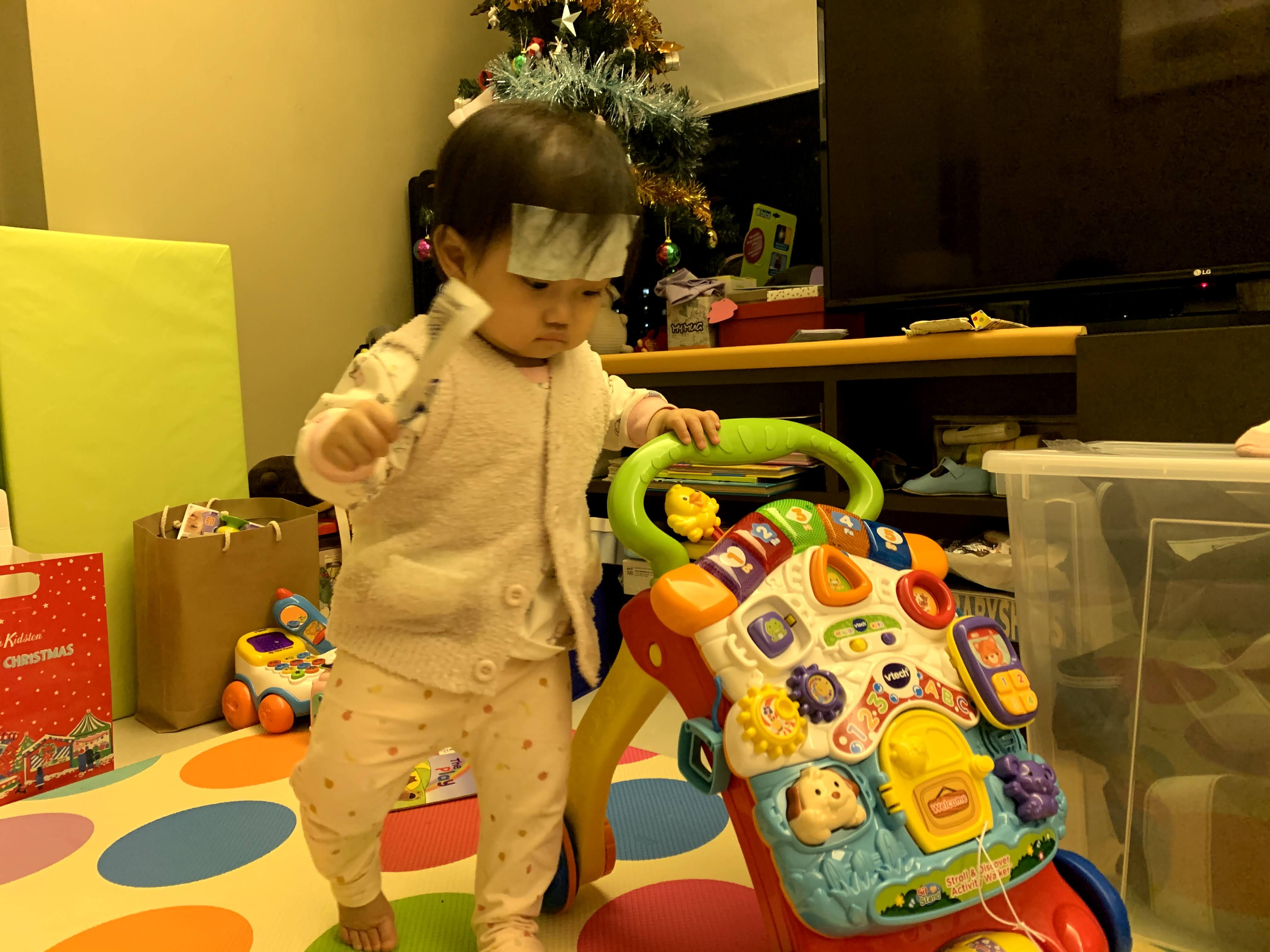 可是晚上回家的時候,她便有點狀態了。如平日一樣,我和黃老公下班回到家,啦啦都會激動,要我們抱她。但今晚不是平日的要抱那麼簡單,就是跟她玩,她仍會哭鬧… 摸摸她的額頭和身,燙啊!檢查過她有點發燒,不是嚴重,但還是快給她吃退燒藥。發燒是接受疫苗後正常會出現的反應。