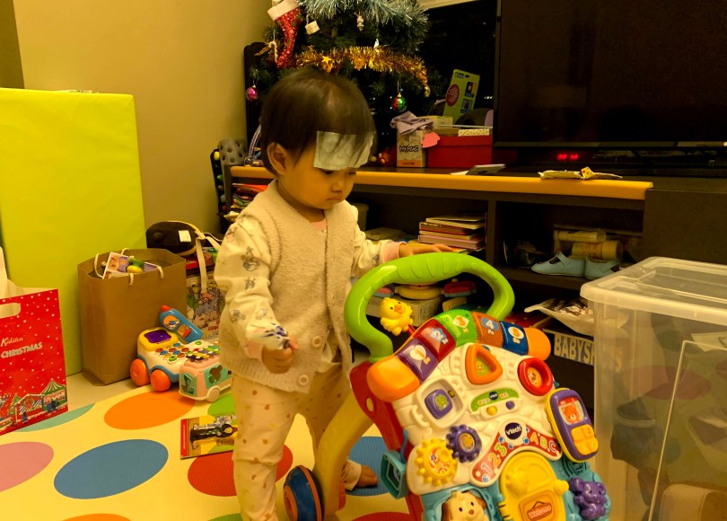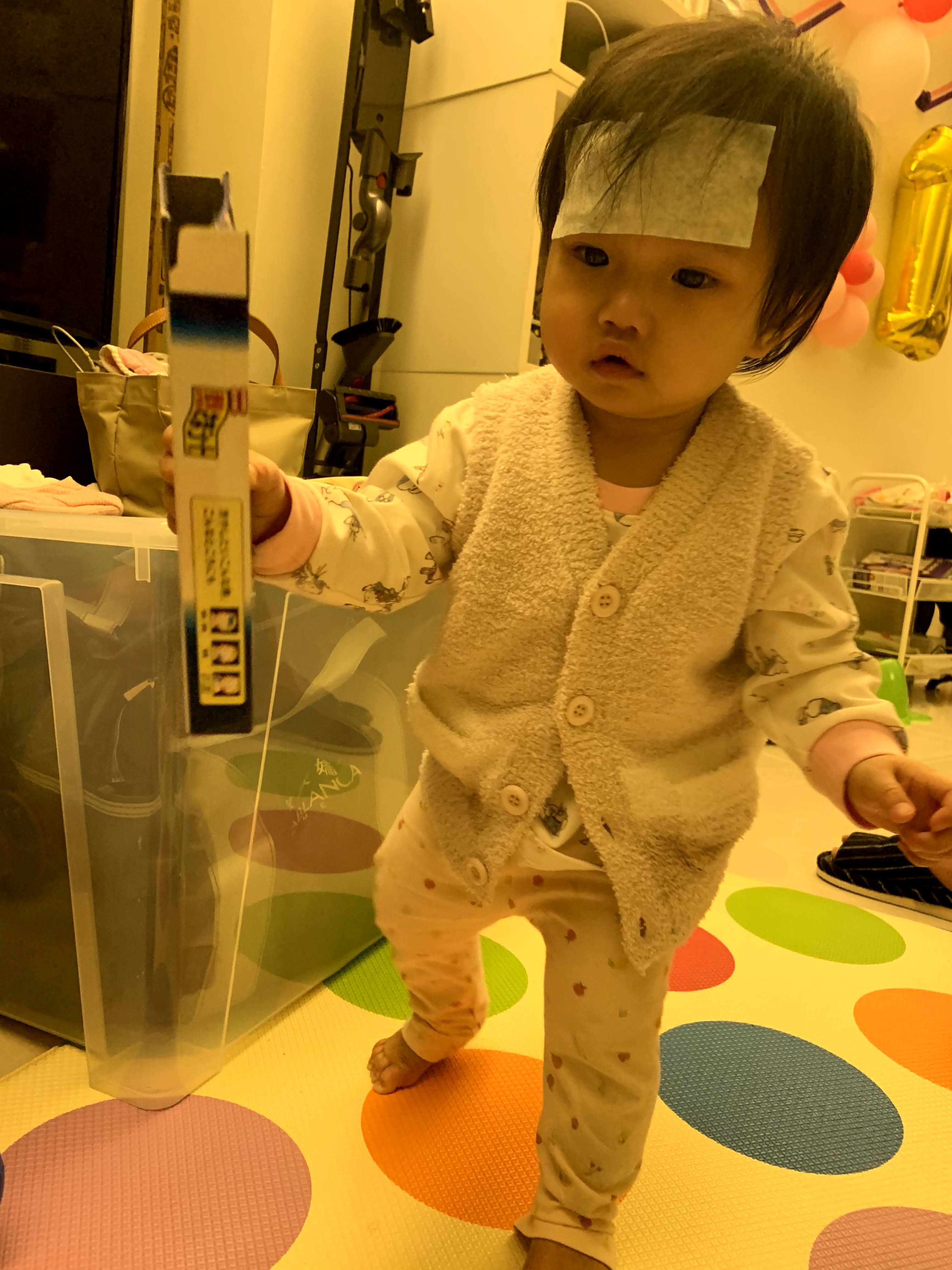 啦啦喝藥很合作,之後讓她貼了「小林退熱貼」,她感覺到有東西黏在額頭,摸了一下就沒有把它撕下,一直貼著繼續玩玩具。希望啦啦快點退燒吧!一定會的!