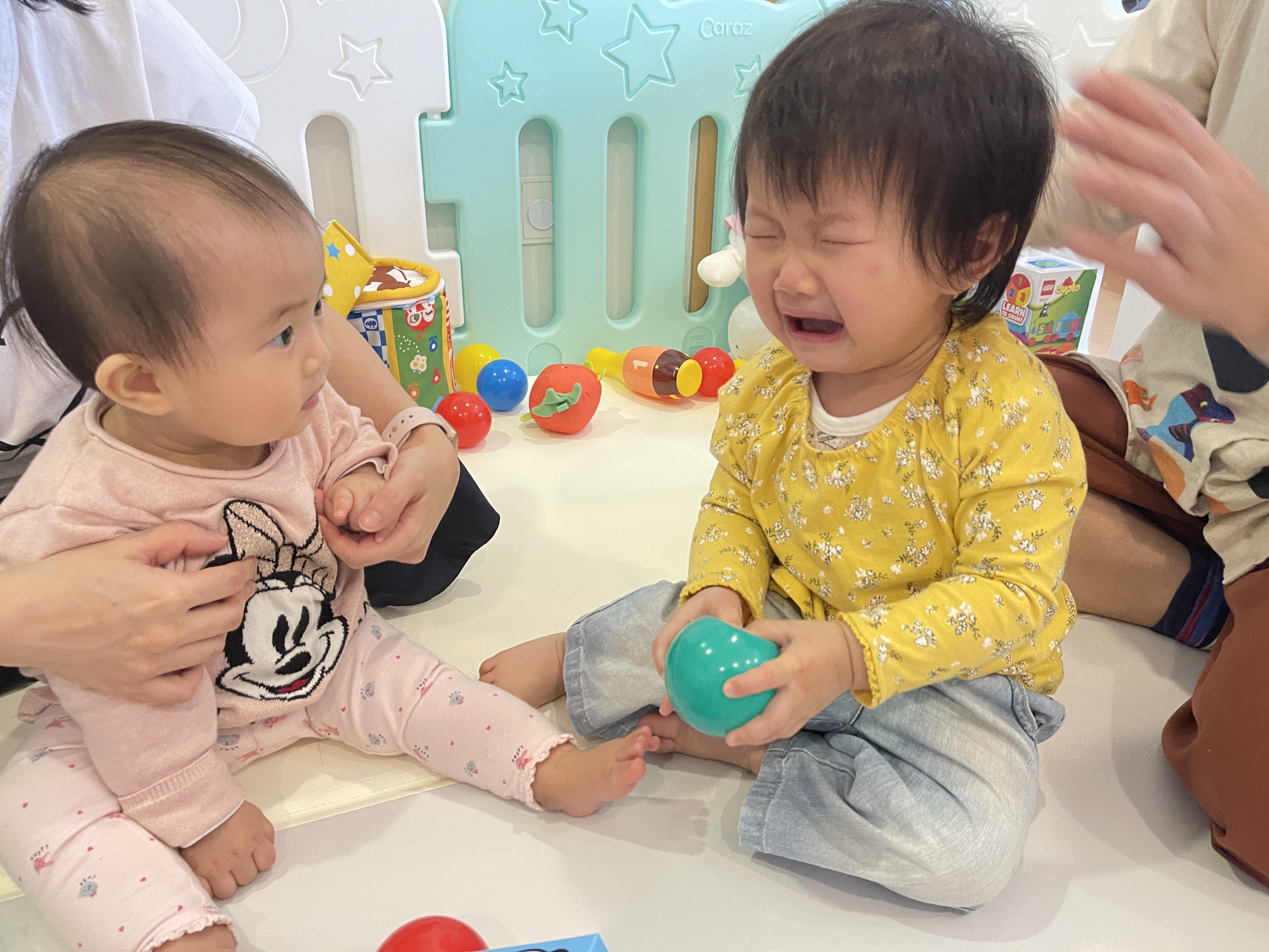 今次啦啦玩了甚麼?我發現她還不是很會和天晴玩呢,很專注玩人家的玩具哈哈!天晴的玩具都好可愛呢!(最愛波波池的波波)反而天晴BB 很想得到啦啦的注意!她抓了幾次啦啦的衣服,向著啦啦叫了幾聲… 啦啦竟然突然大哭!她有時會把別人對她的熱情誤會為「責罵」…(曾試過在街上有朋友遇見我們一家三口,興奮地過來跟我們打招呼談話,啦啦便馬上大哭,朋友完全沒摸她啊)