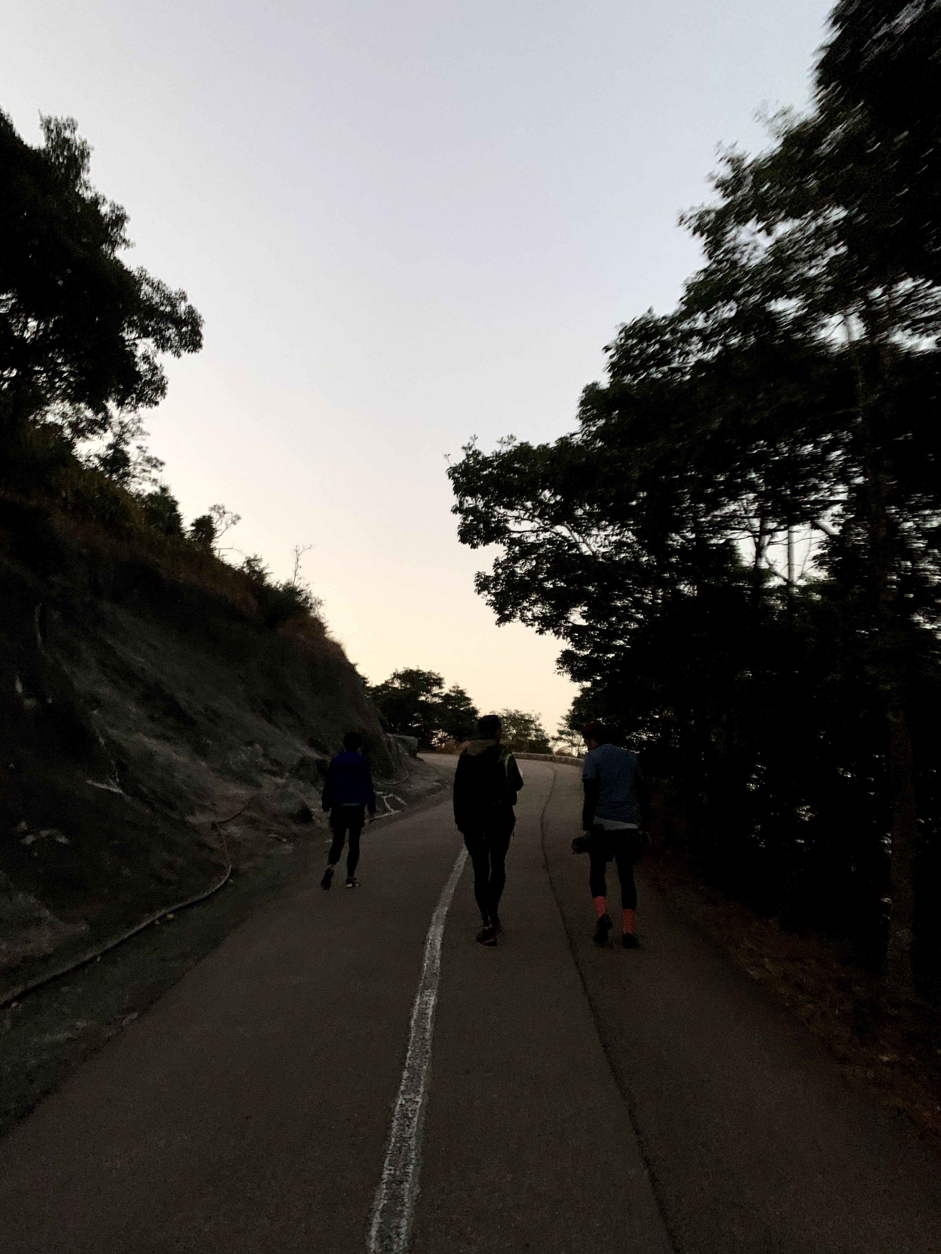 我已經很久沒有看過日出了。今天有前輩邀請,一定要去吧!開車到達山仍是天黑,看得很清楚月光。我們要往上再走一段路,走 45 分鐘左右(我走得慢…)。一直也是上斜,對於缺乏運動的我也不是容易… 會氣喘… 而且,好睏… 不習慣這麼早起床啊!(現在啦啦早起,也是八點前,根本不能相比哈哈)