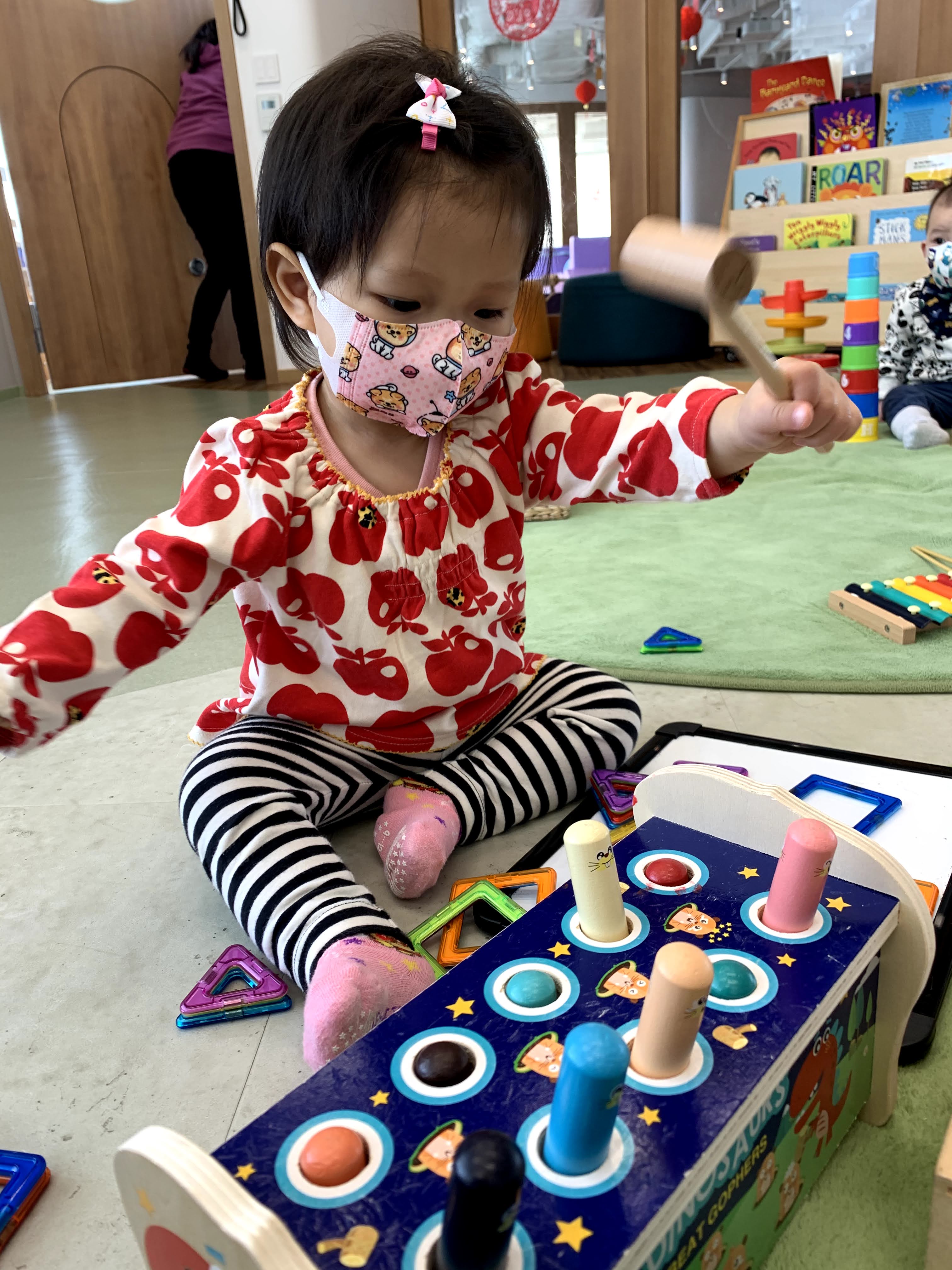 啦啦很喜歡玩扑扑扑的玩具,或很喜歡用手按掣,玩可以按下去的玩具。