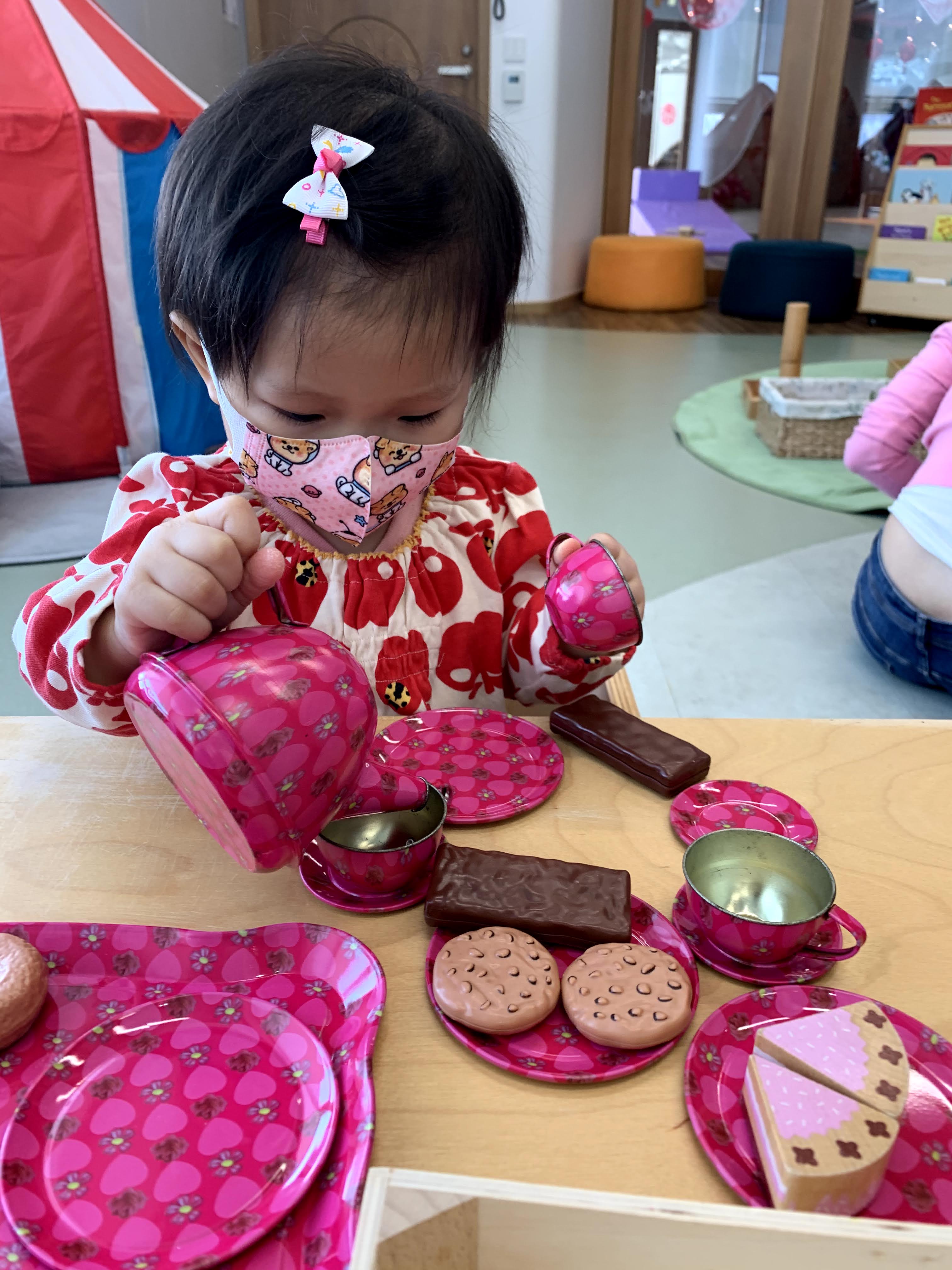 來第二次 Dibber,課前 play time 的玩具組合有不同。第一次看到茶具玩具(我家暫時沒有「煮飯仔」或類似的玩具),我做了兩次倒茶的動作給啦啦看,她就會模仿,似模似樣的!茶具也真的很可愛,大小剛剛好適合十三個月的啦啦玩。