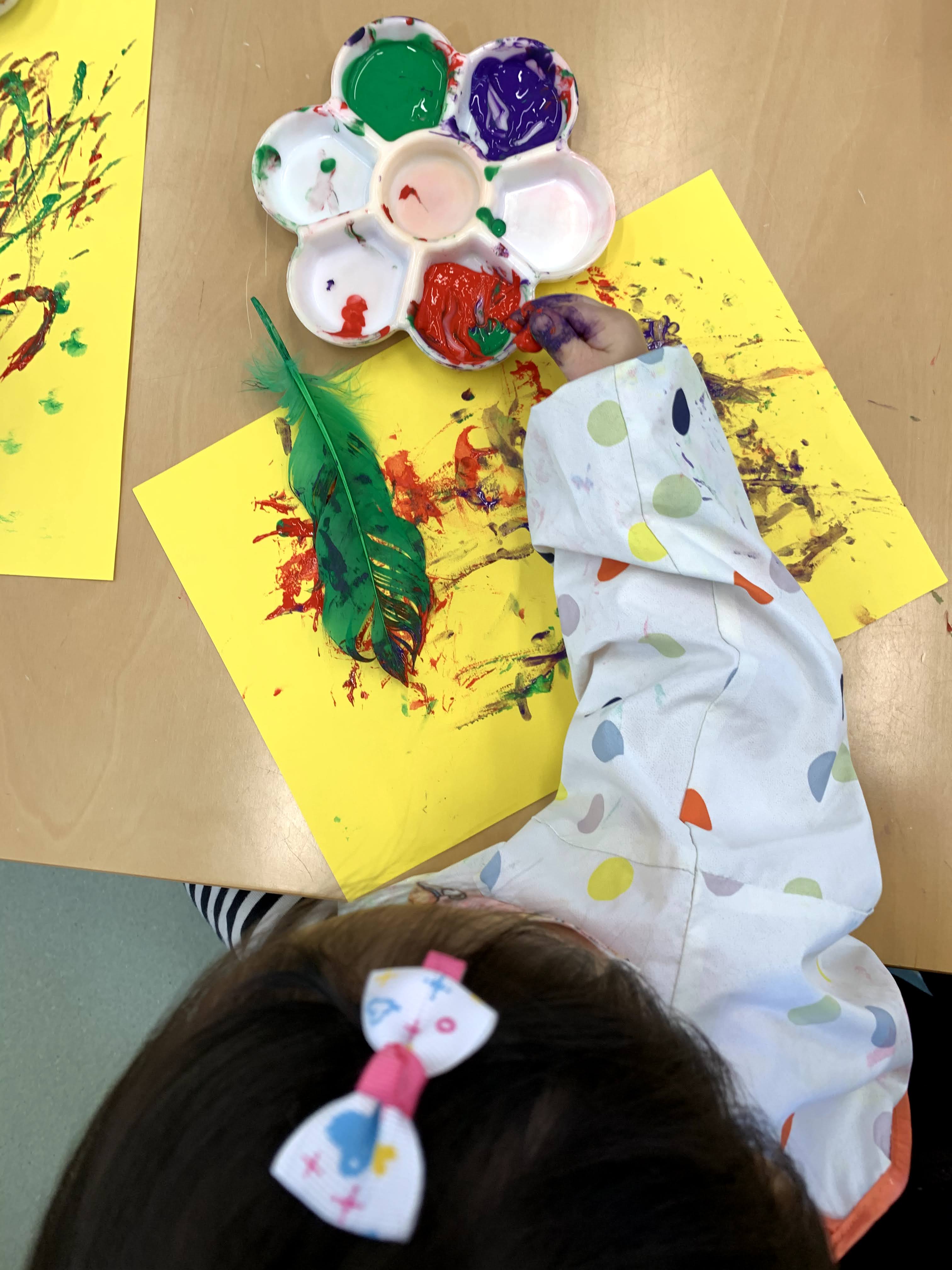 今天 free play 和上課時間也有 messy play。啦啦很喜歡玩水,但還未算有耐性畫畫。今天的課題是要用老師派發的羽毛沾顏料,然後在畫紙上 tap tap tap。她不太喜歡用羽毛,偏要用手一把伸入調色盤。MESSY play 對小朋友發展是真的很好!