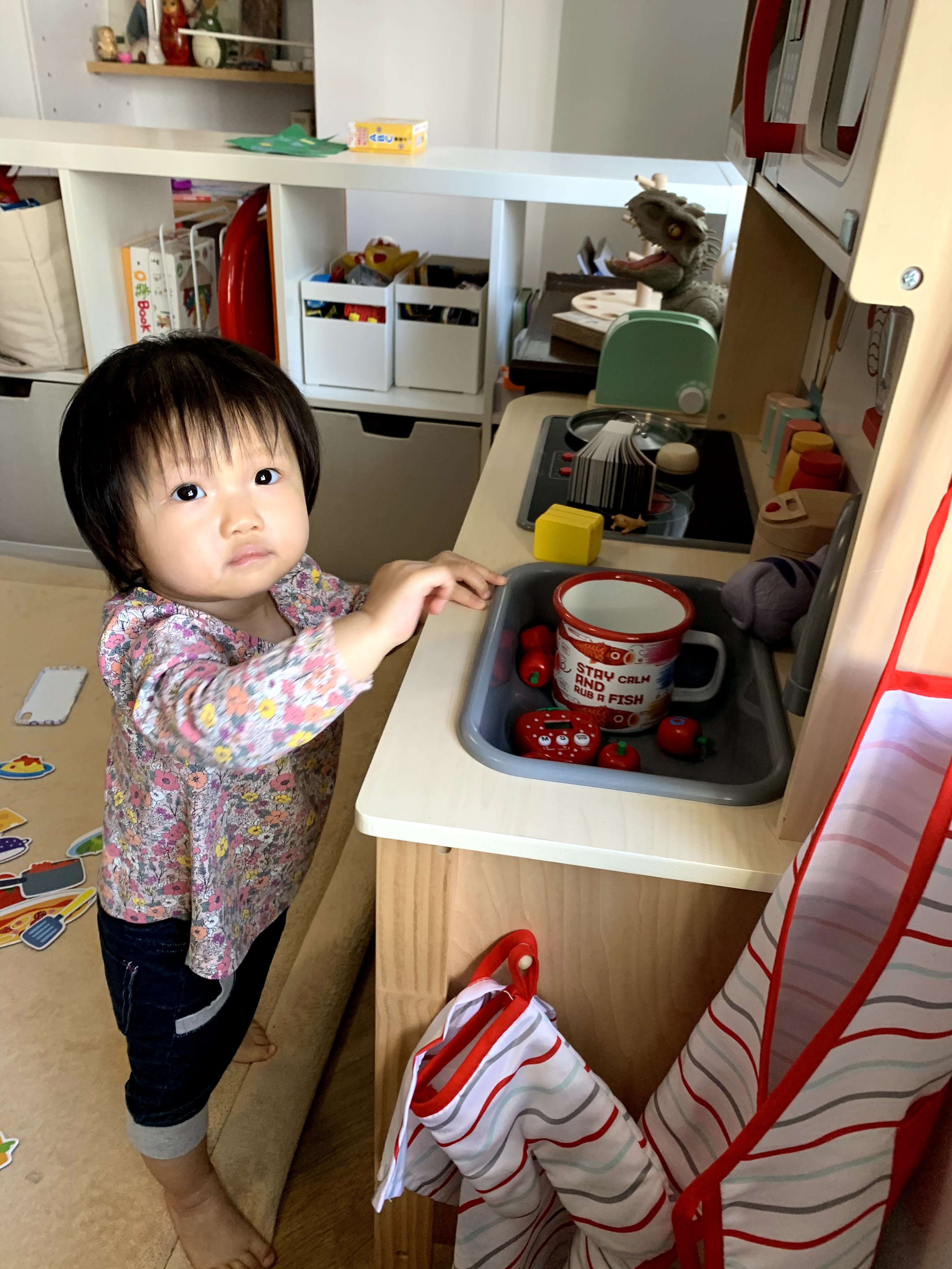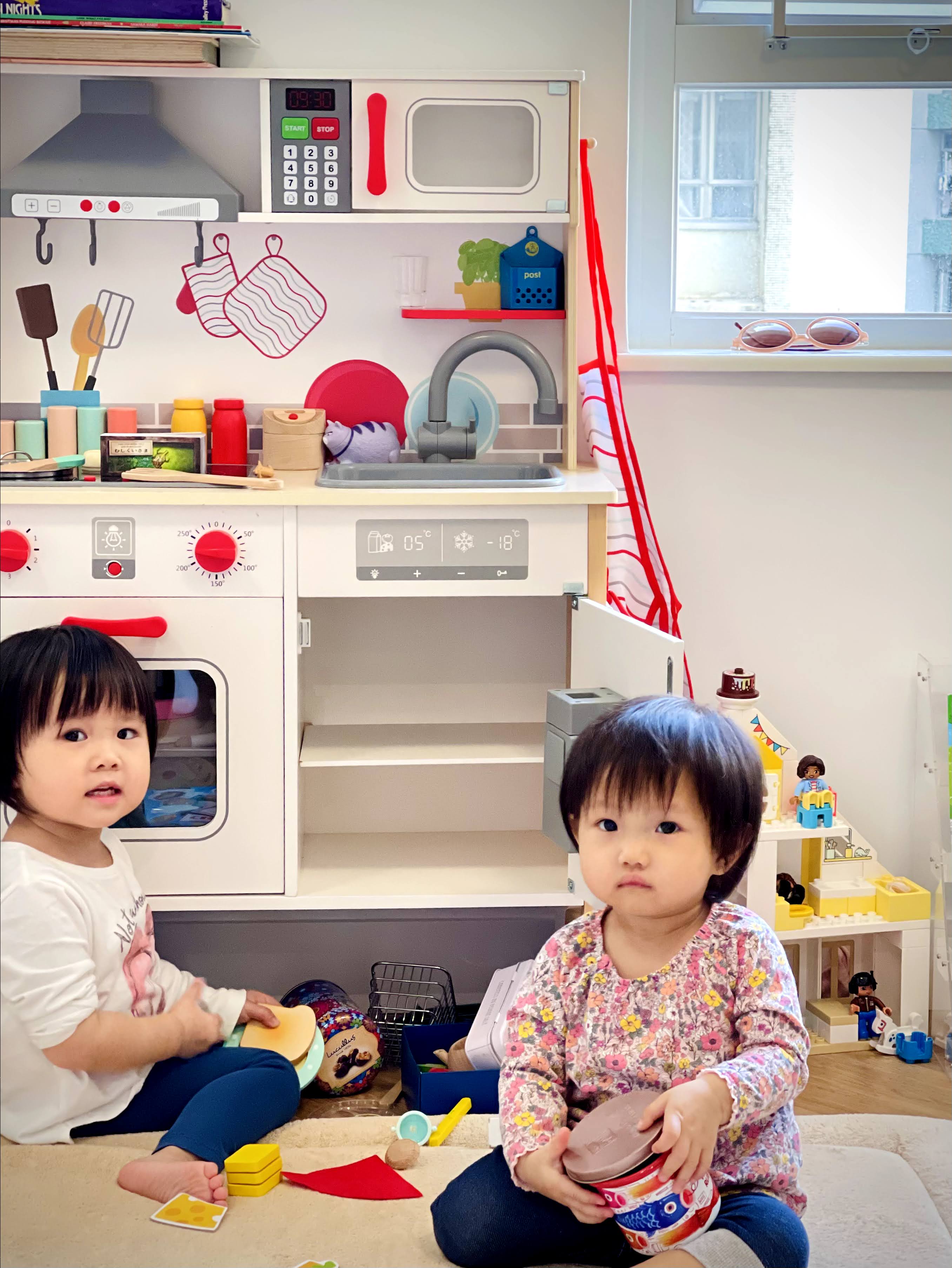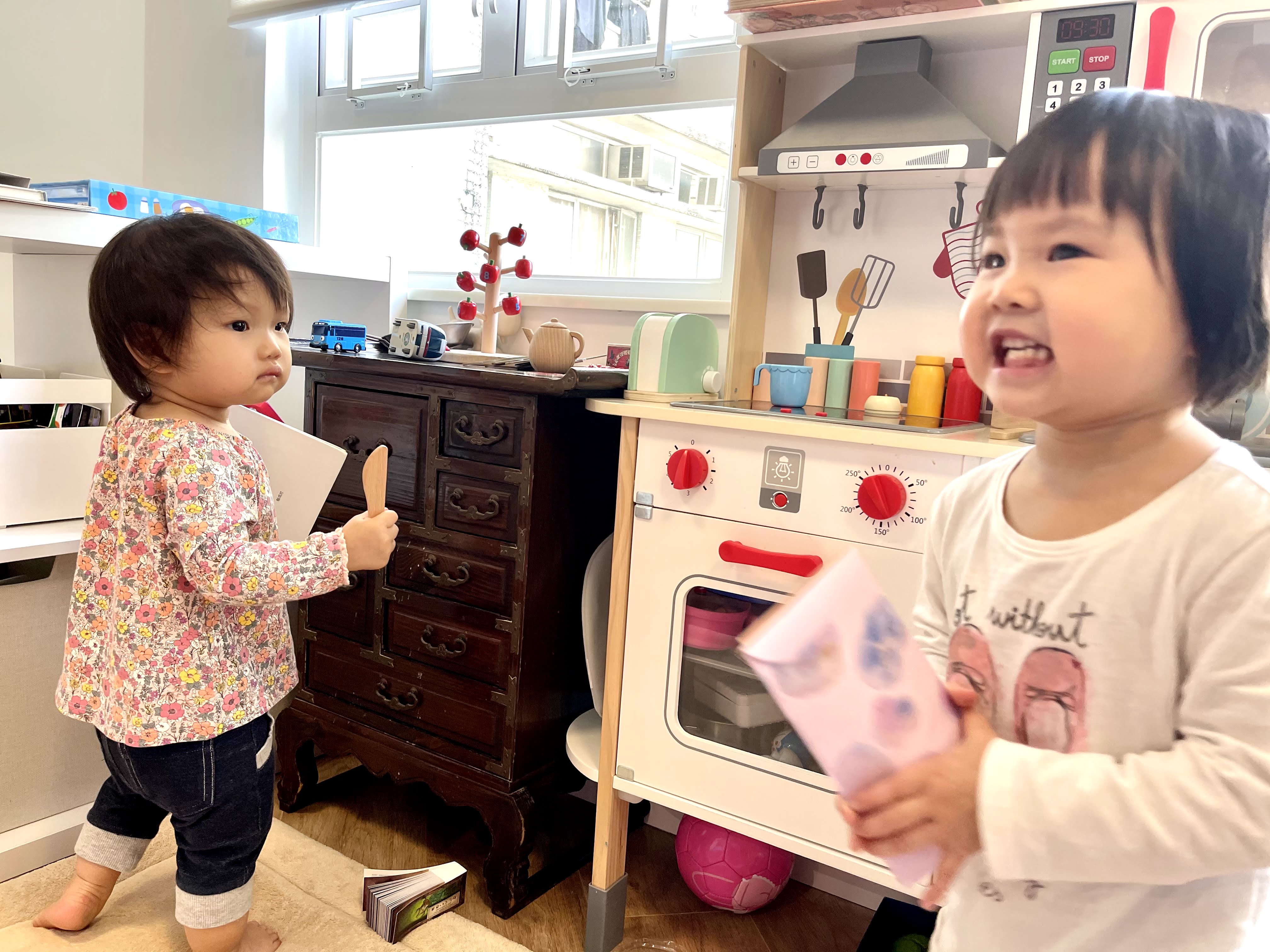 另外,一直也想讓啦啦玩玩具廚房。以前在玩具店讓她看過,但那時還未可以走路,當然也不夠高。今次,可以好好的地了。(其實現在還是有一點點不夠高哈哈)她最喜歡把抽屜打開,取裡面的玩具食物出來,然後再把食物放回去。我妹妹的女兒也加入一起玩,三表姐妹很忙碌,情況就像是參加 playgroup 的 free play 時段。
