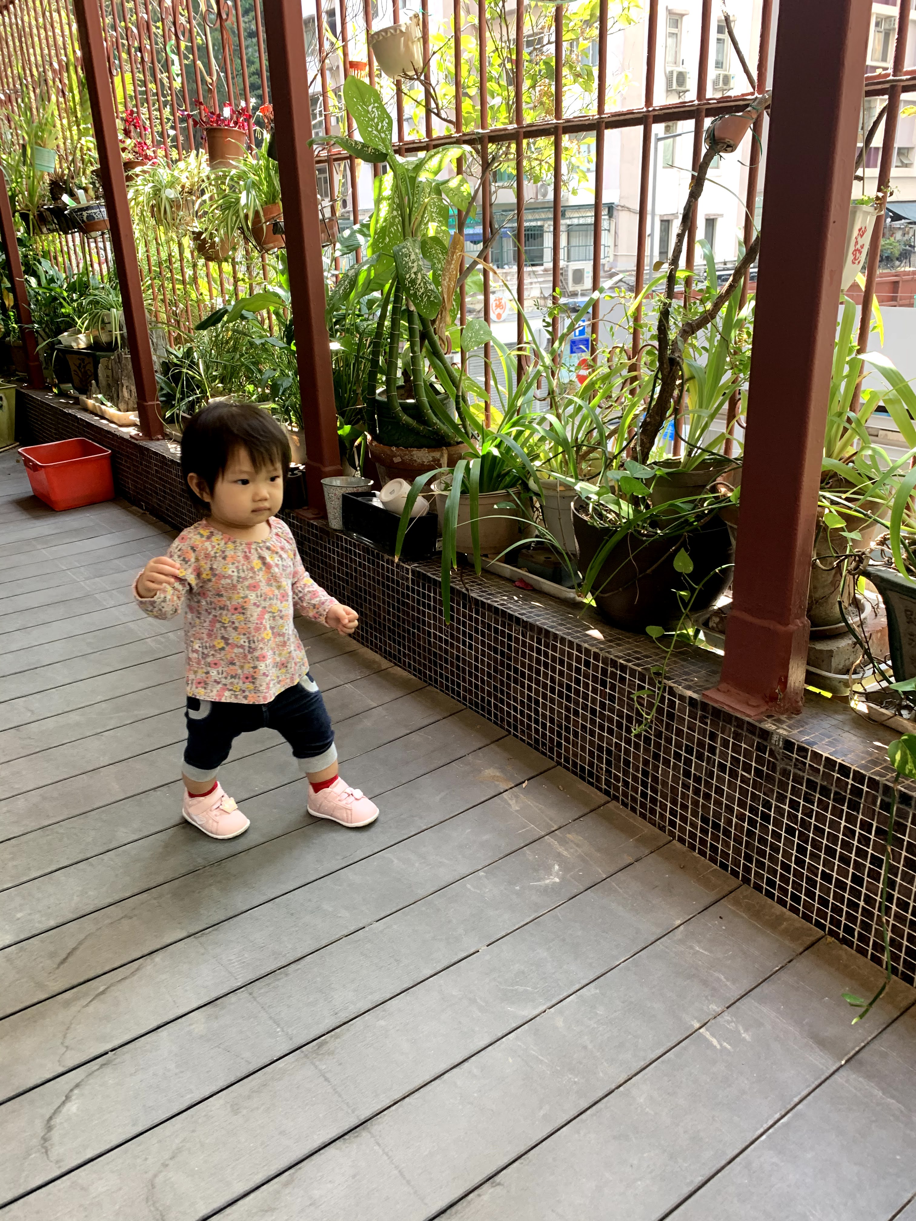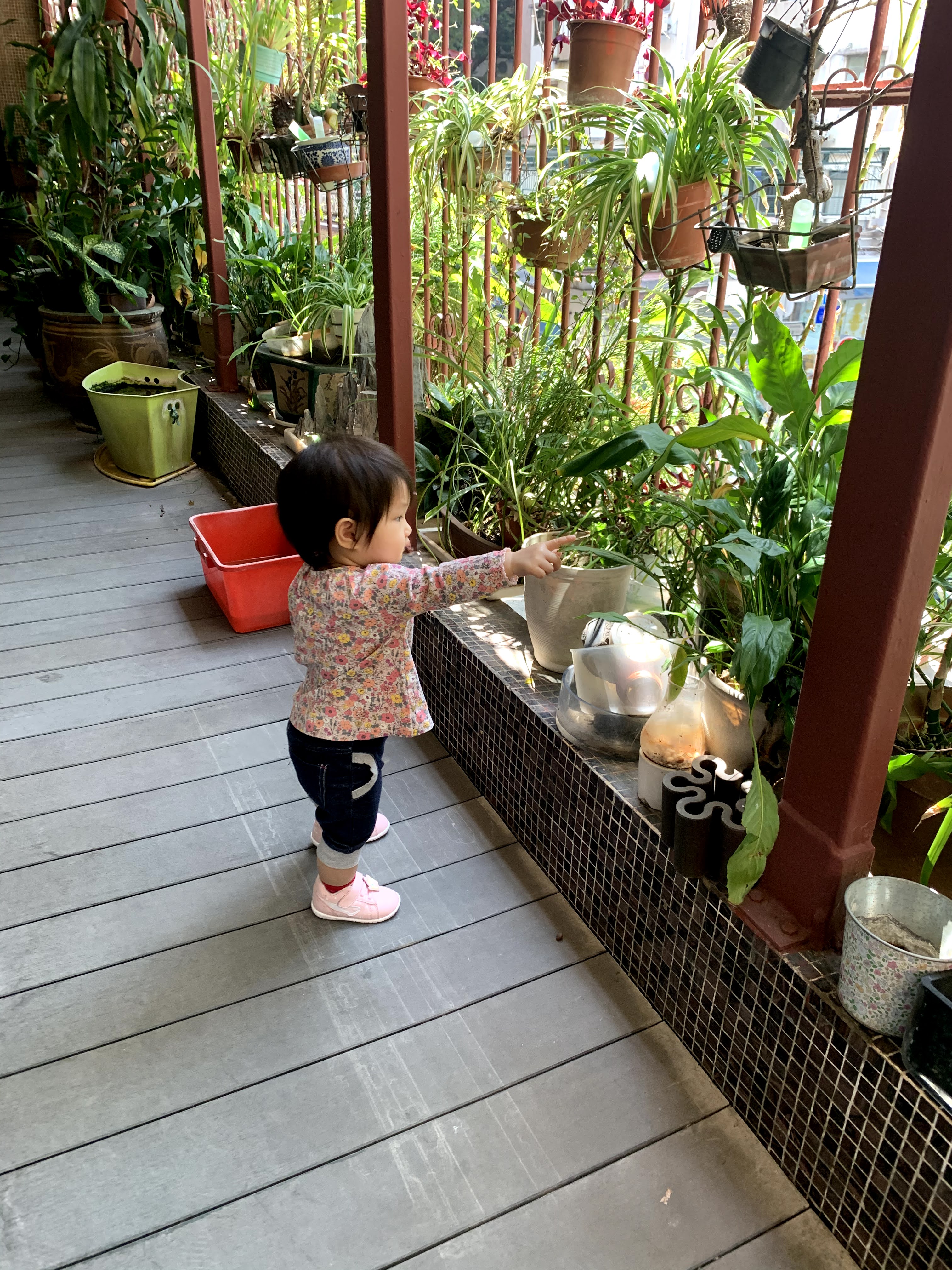 之後去了附近姨婆的家,她家有個平台,放滿了綠色的植物,還有龜和鯉魚。啦啦最近好喜歡花,葉,所以她在平台玩得很開心。多看一點綠色植物對寶寶的眼也是很好。