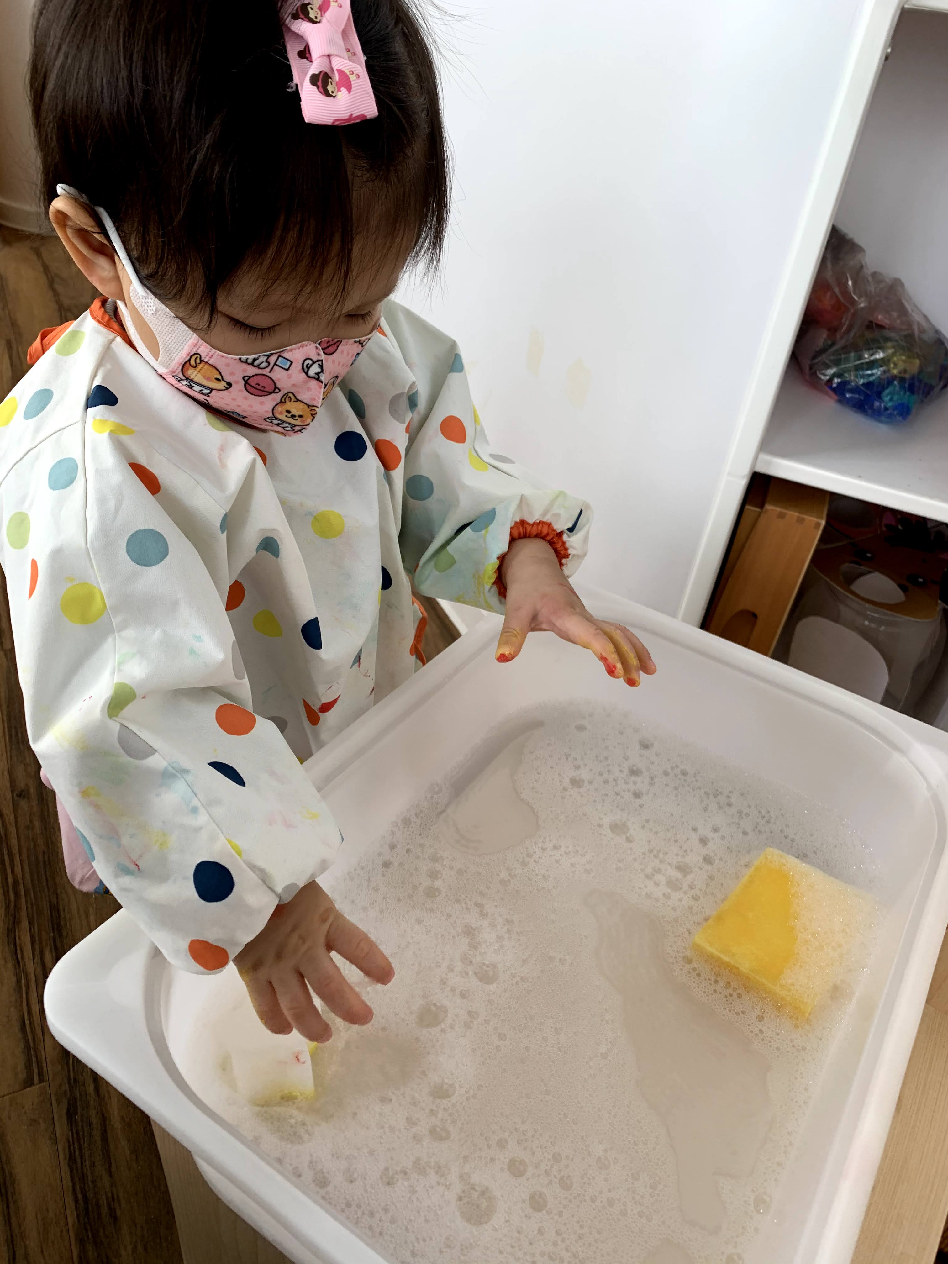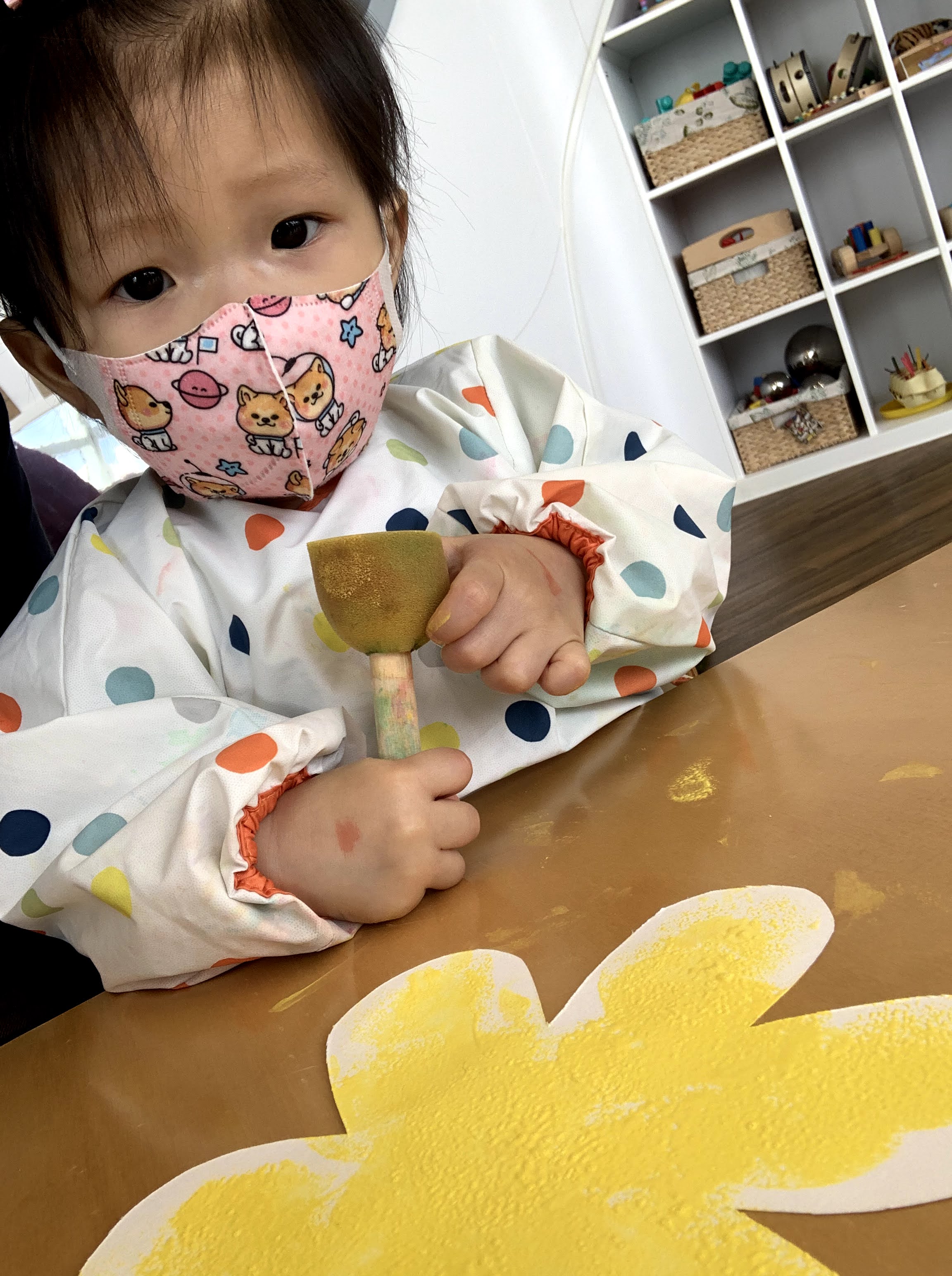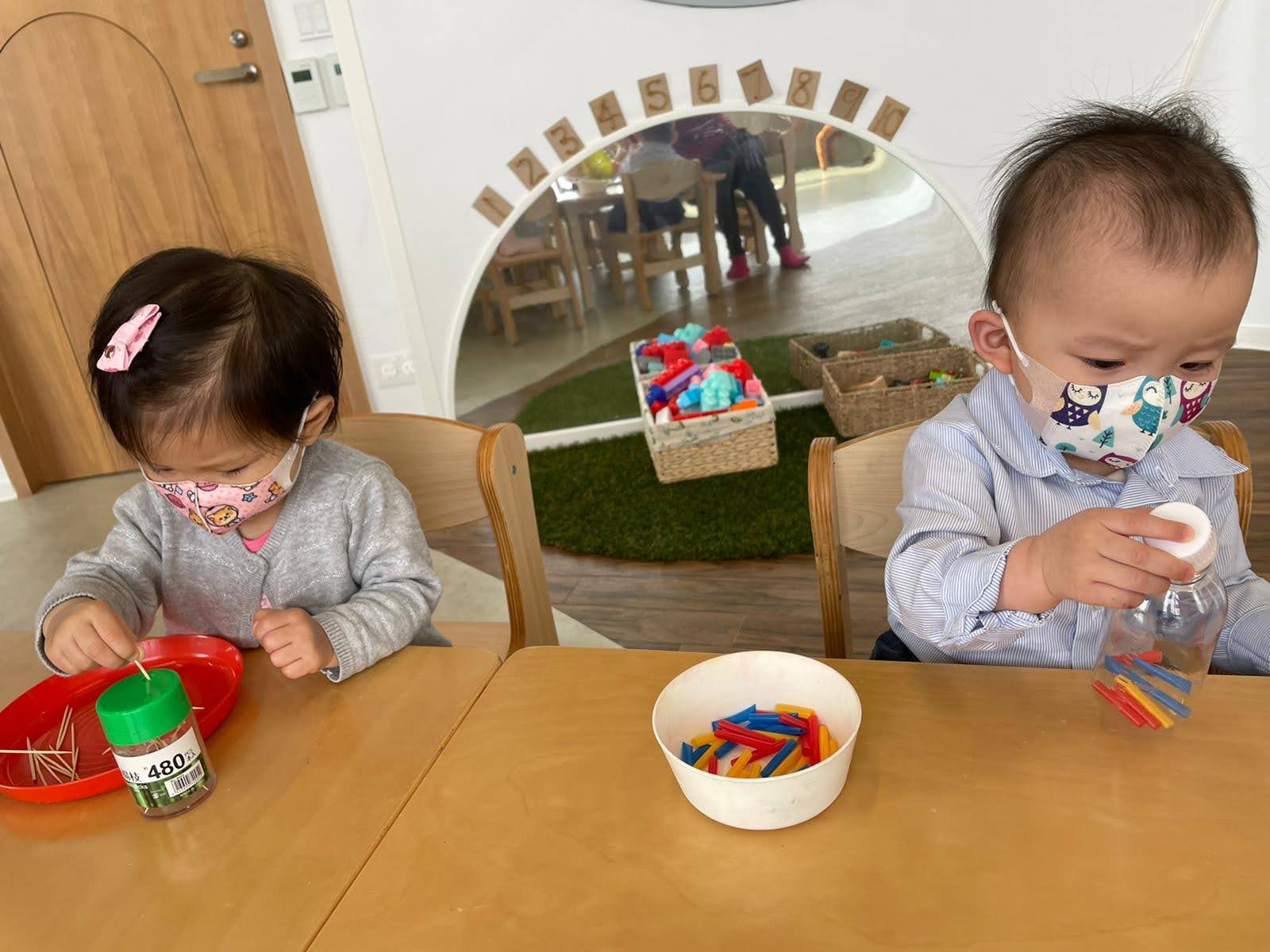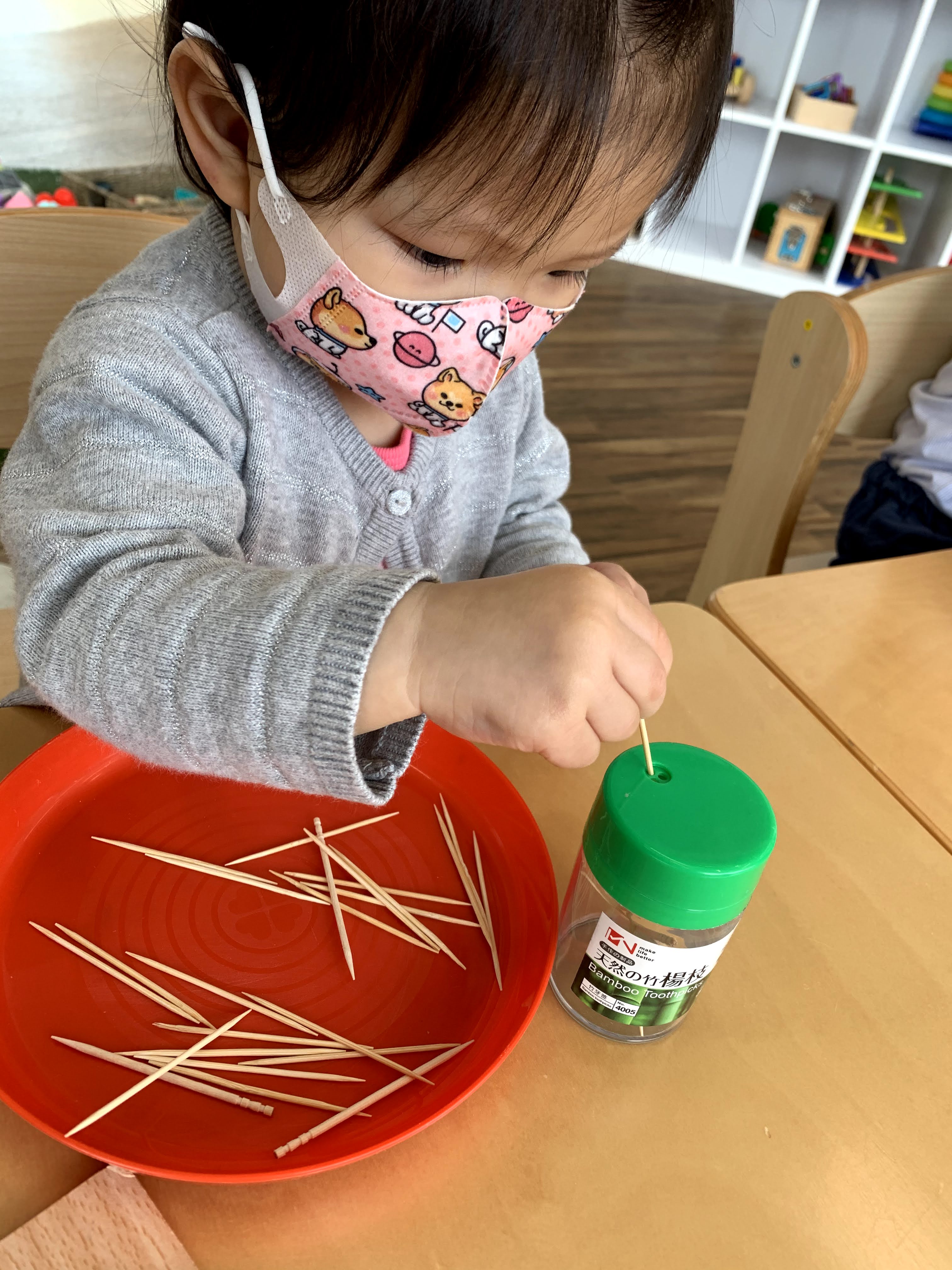 媽媽帶啦啦坐好後,便把牙簽推開,因為她太喜歡一枝枝的東西,牙簽這麼尖,真的怕她被刺到(很快想像到可怕的意外發生)….。怎料她坐好後,Miss Sonia 一手把牙簽和牙簽筒推到啦啦面前,我問老師,她真的可以玩嗎?老師肯定地說可以啊。她捉著啦啦的手做了一次,邊做邊講(老師說英語),然後就走開了。啦啦一手拿著牙簽一手慢慢地它們一枝枝放入筒裡。我看呆了。我沒教過她啊!真的不可小看小朋友模仿的能力!