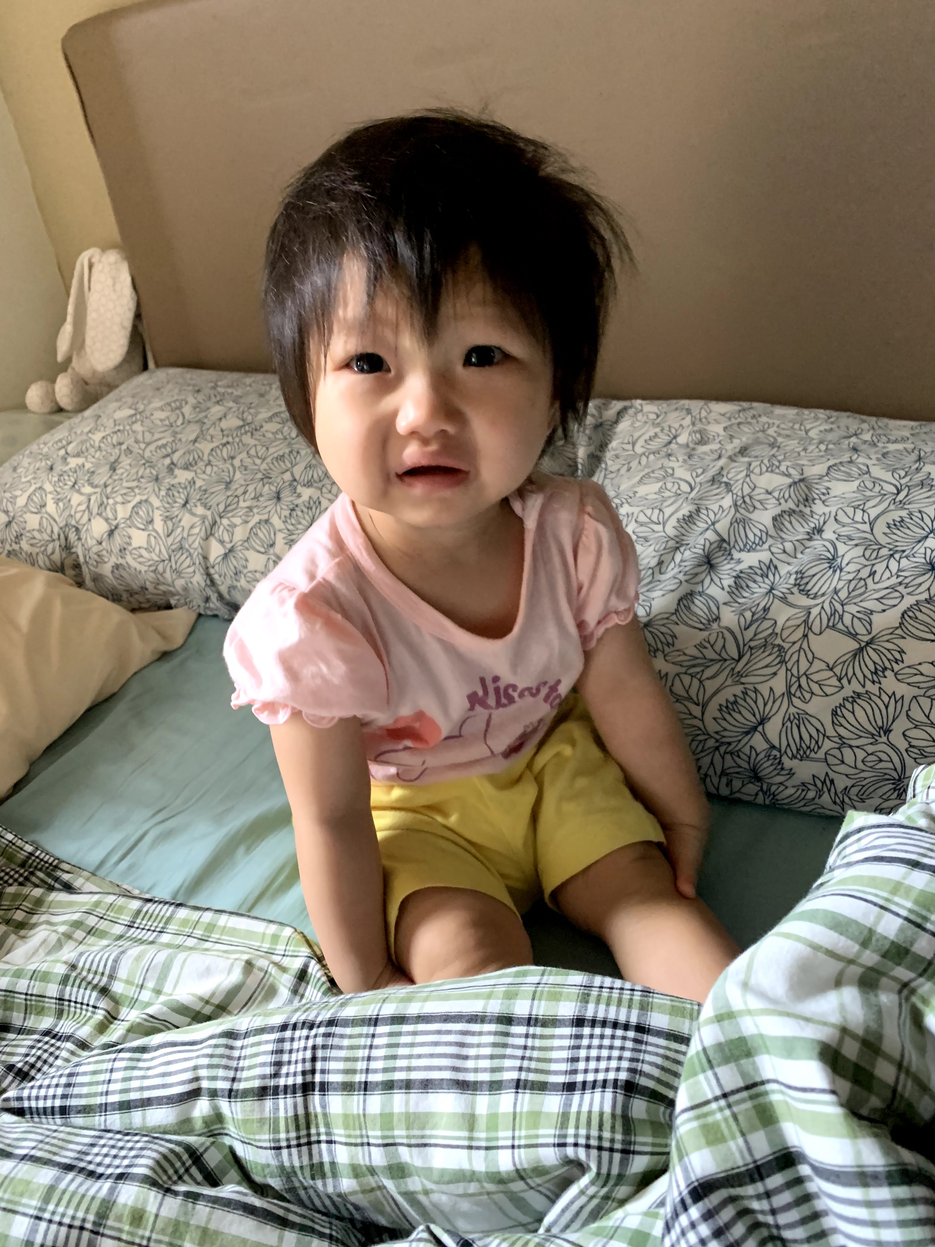 今天黃啦啦足十四個月大了!睡到九時還未起床,要叫醒她,因為 playgroup 在這個月開始有十時多的堂,不能睡到太晚啊!(被吵醒她開始是呆呆的,但很快便有點不滿的樣子… 可愛)