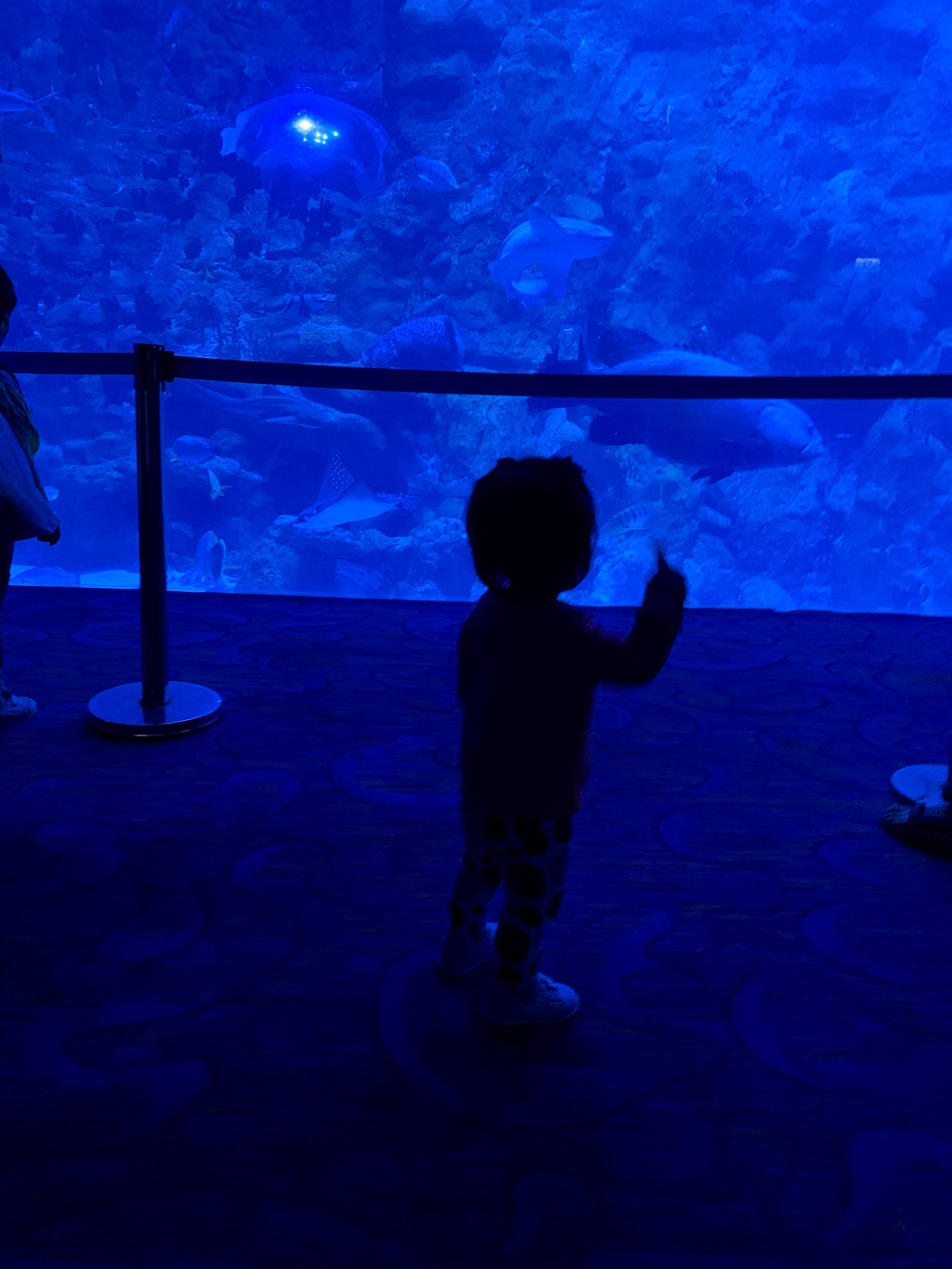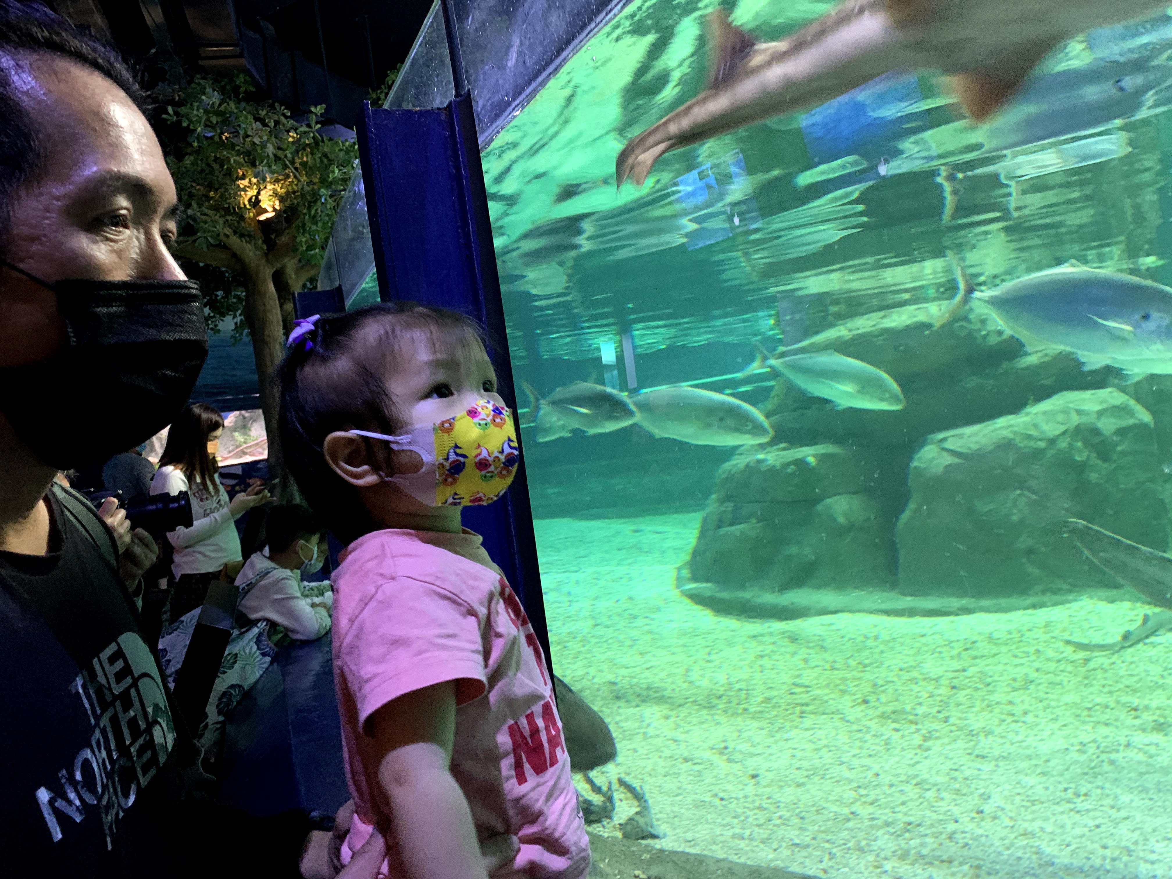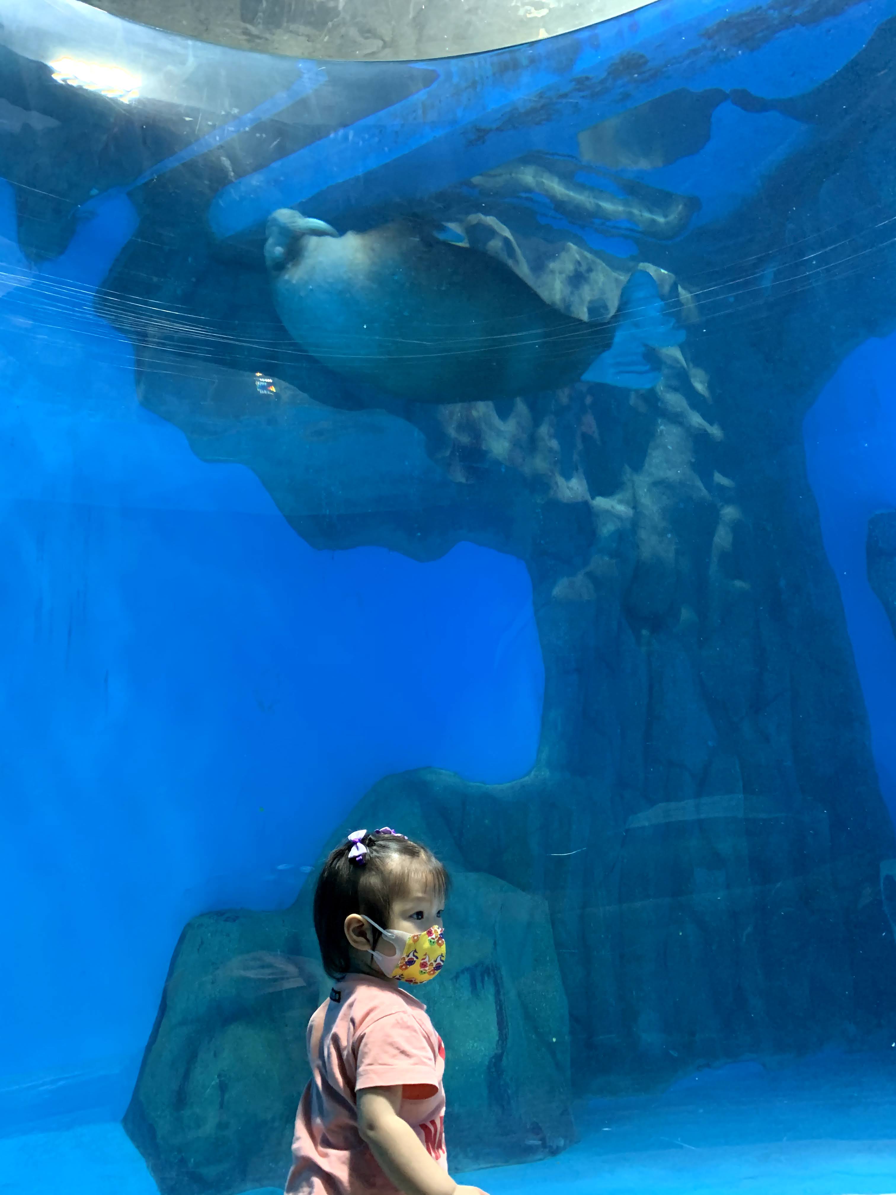 成功進入海洋公園後,便去了海洋館看魚!啦啦見到魚會跳 baby shark 的舞(就是雙手合在一起左右搖擺哈哈),她一定是很開心了!很多晚的睡前閱讀,都是看書本上的魚,第一次這麼近看到真實的魚呢!