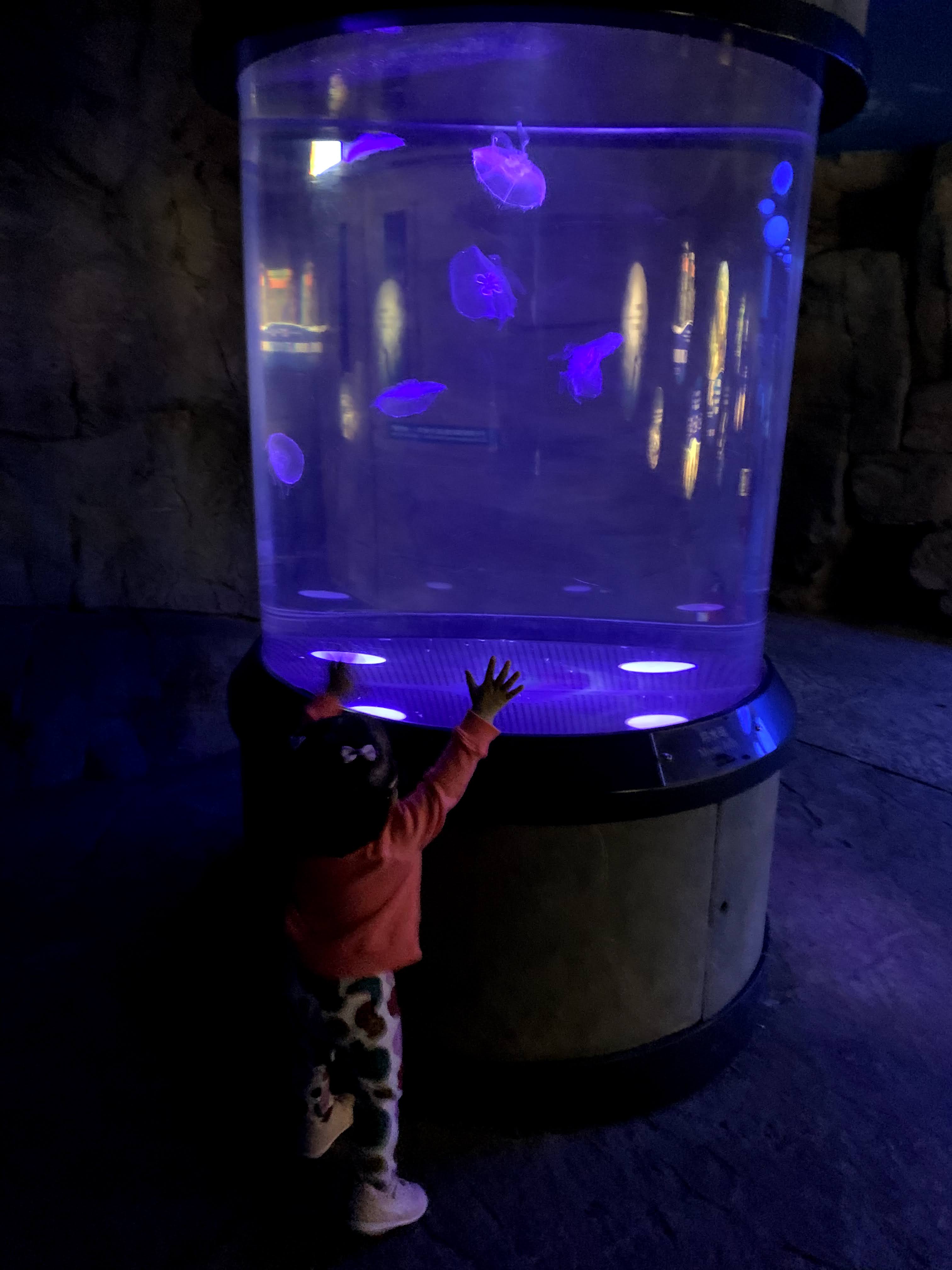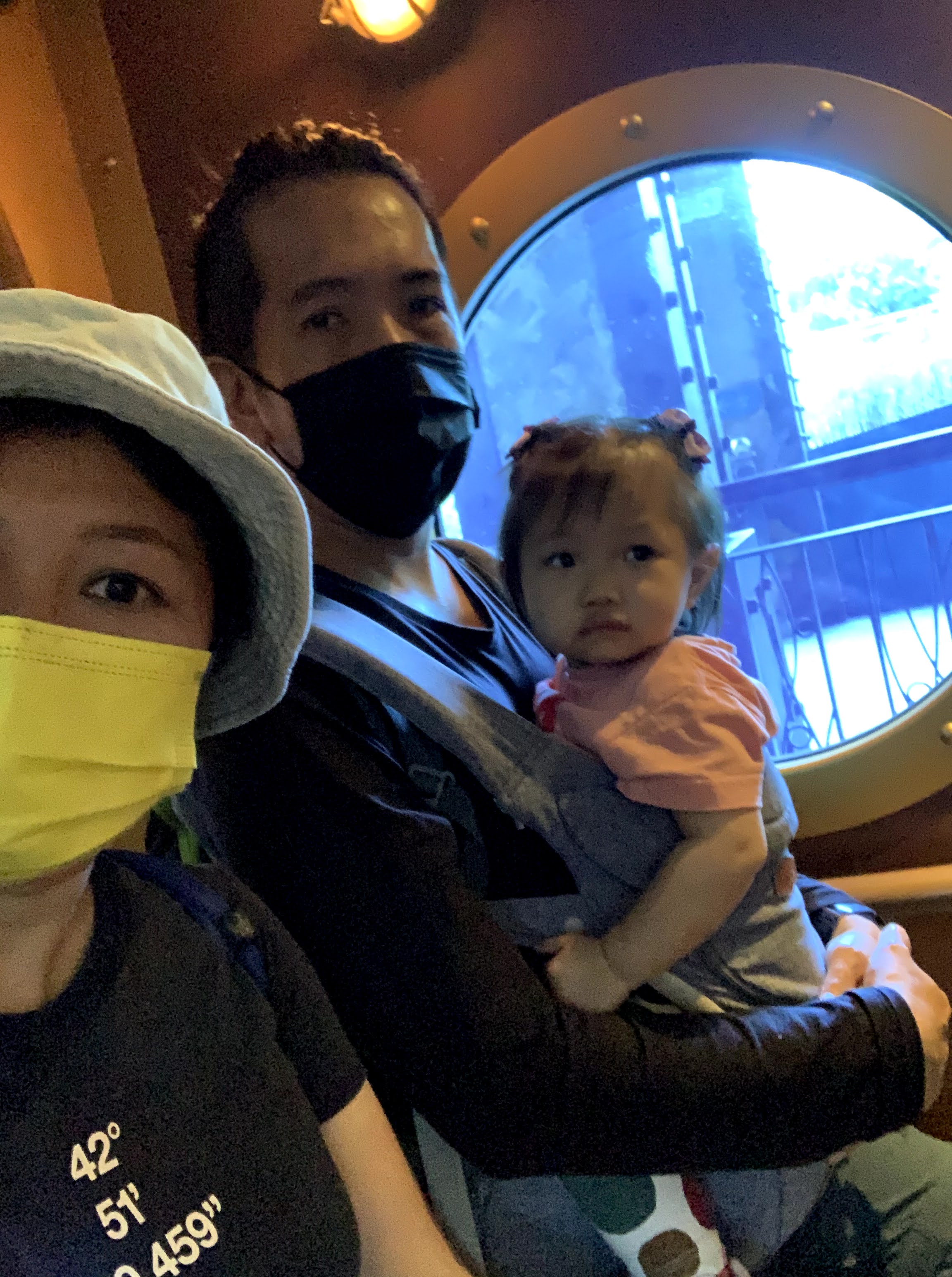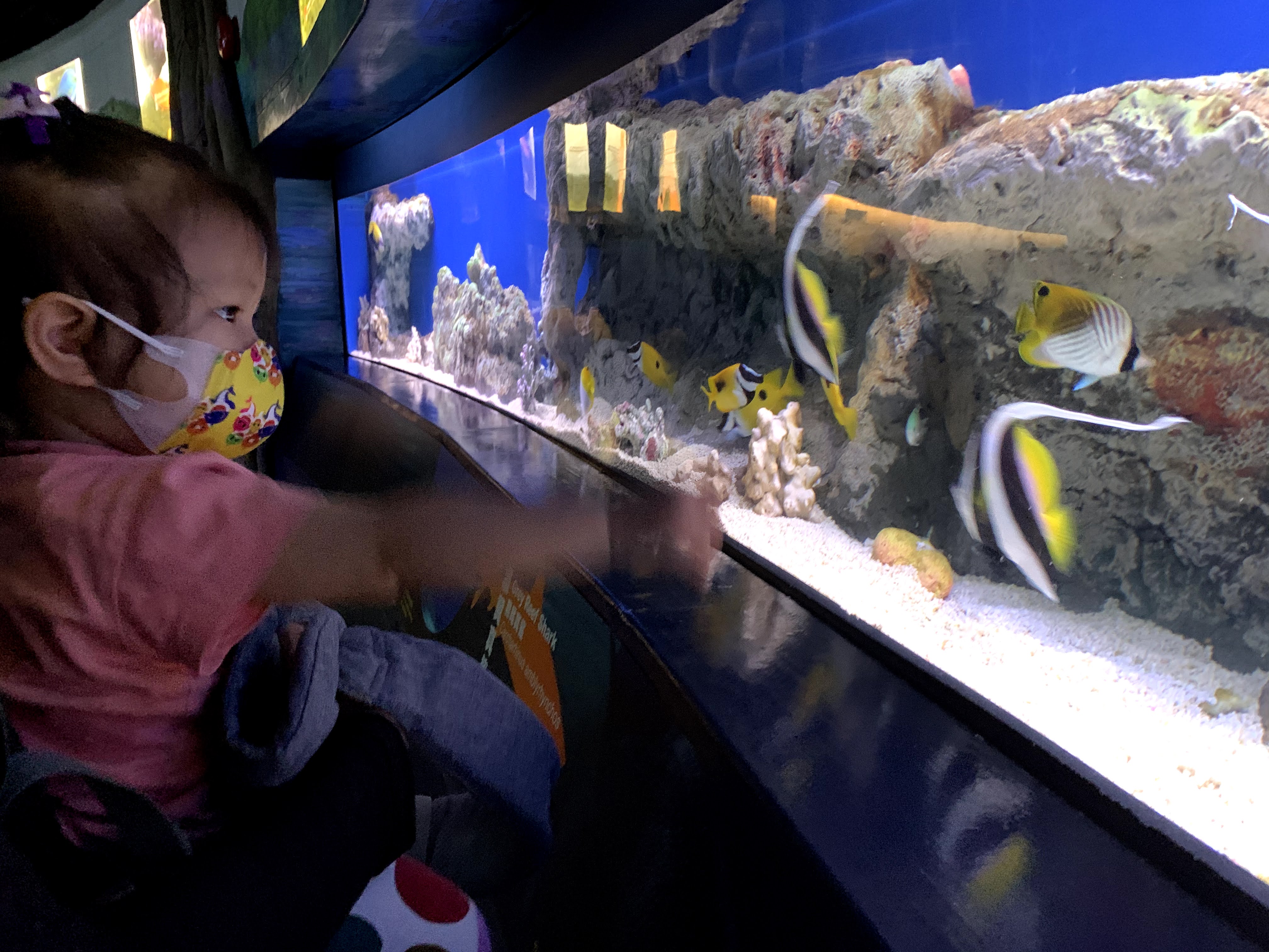 成功進入海洋公園後,便去了海洋館看魚!啦啦見到魚會跳 baby shark 的舞(就是雙手合在一起左右搖擺哈哈),她一定是很開心了!很多晚的睡前閱讀,都是看書本上的魚,第一次這麼近看到真實的魚呢!