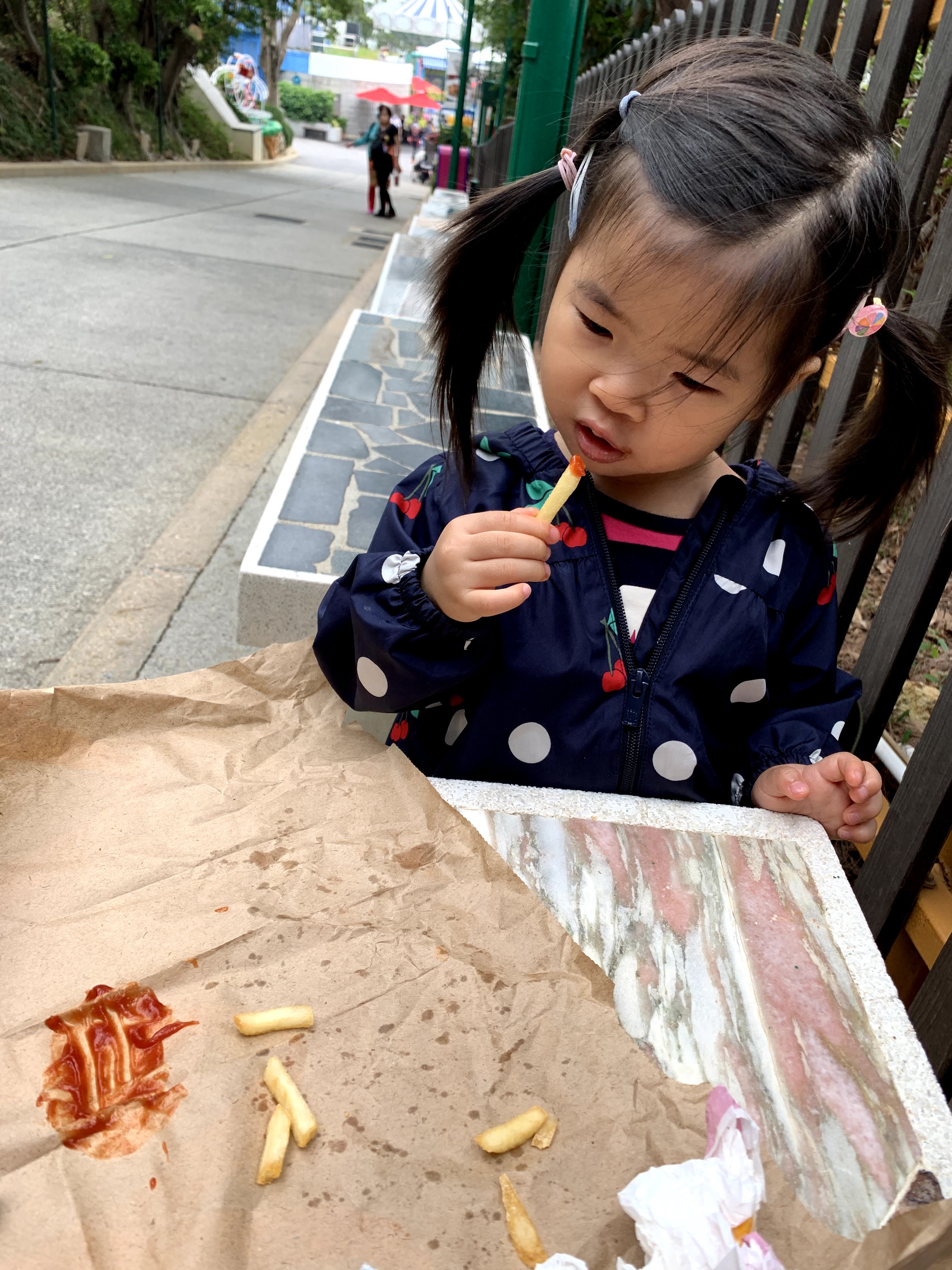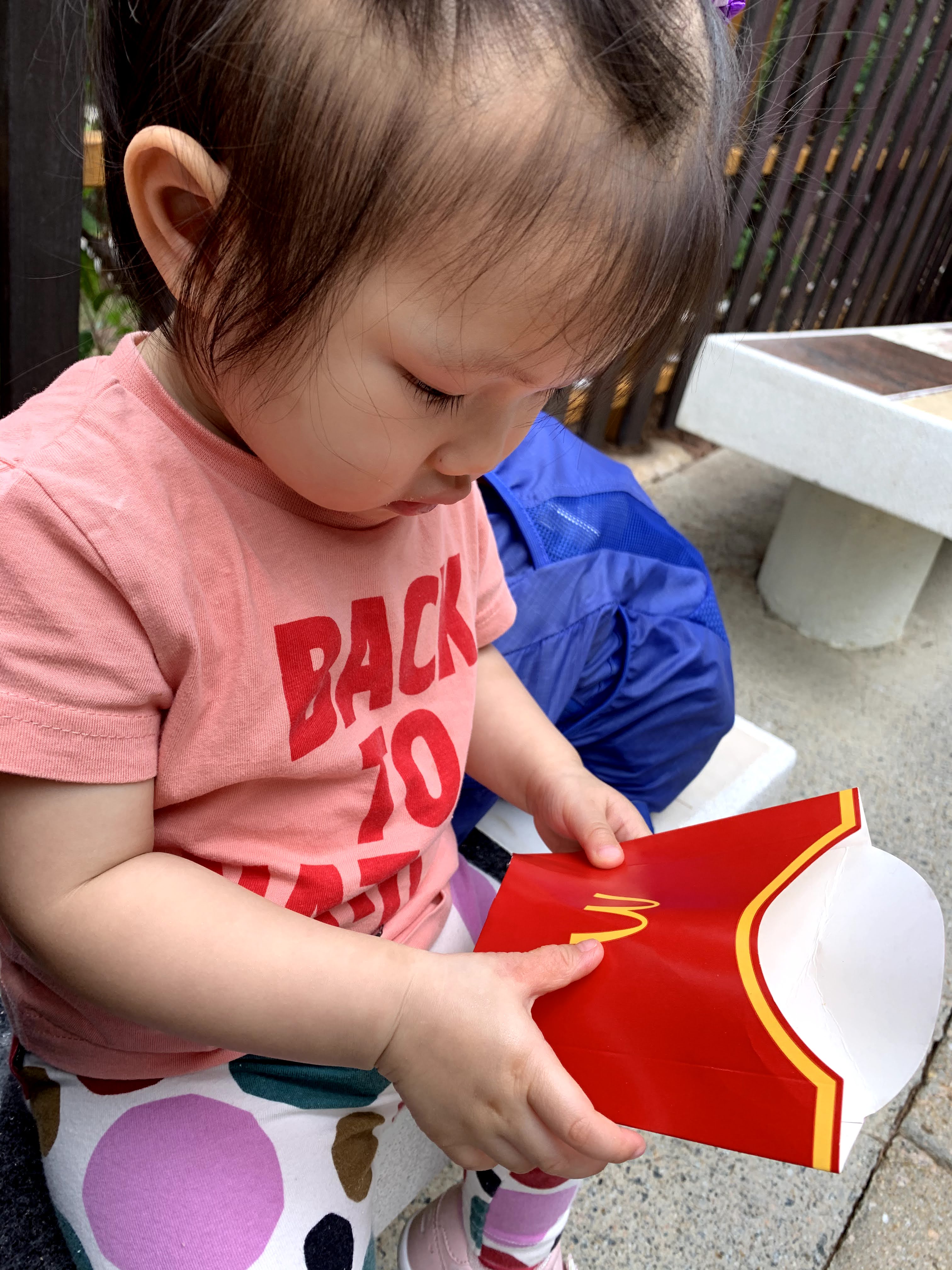 啦啦和 Gracelyn 表姐是吃從家裡帶出來的午飯:保溫壺飯和錫紙包好的蕃薯。我們大人就吃了麥噹噹(好久沒吃了),十四個月大的啦啦只可以玩載薯條的盒「有得睇無得食」,表姐就吃了一點點薯條,她第一次點茄汁。