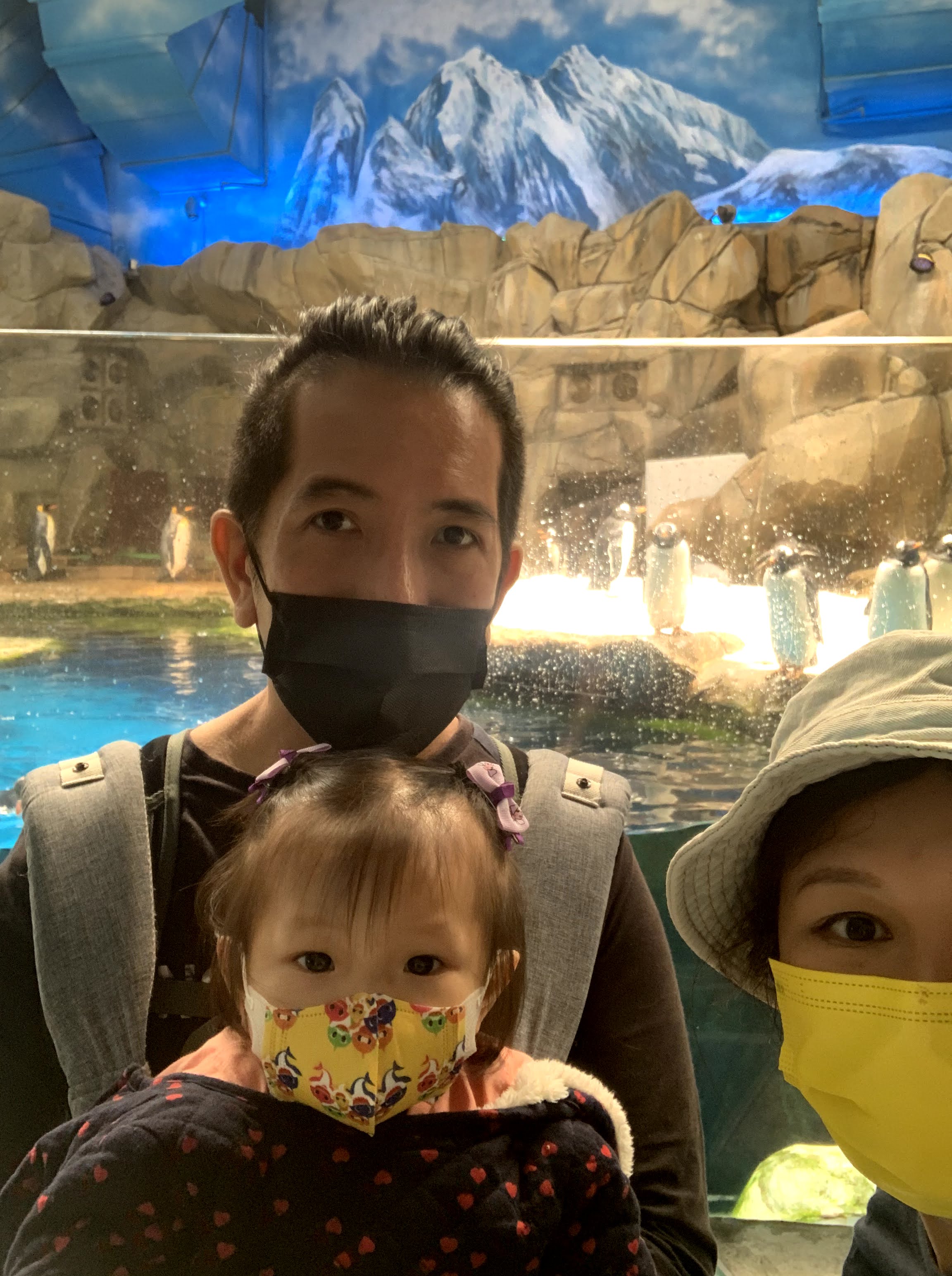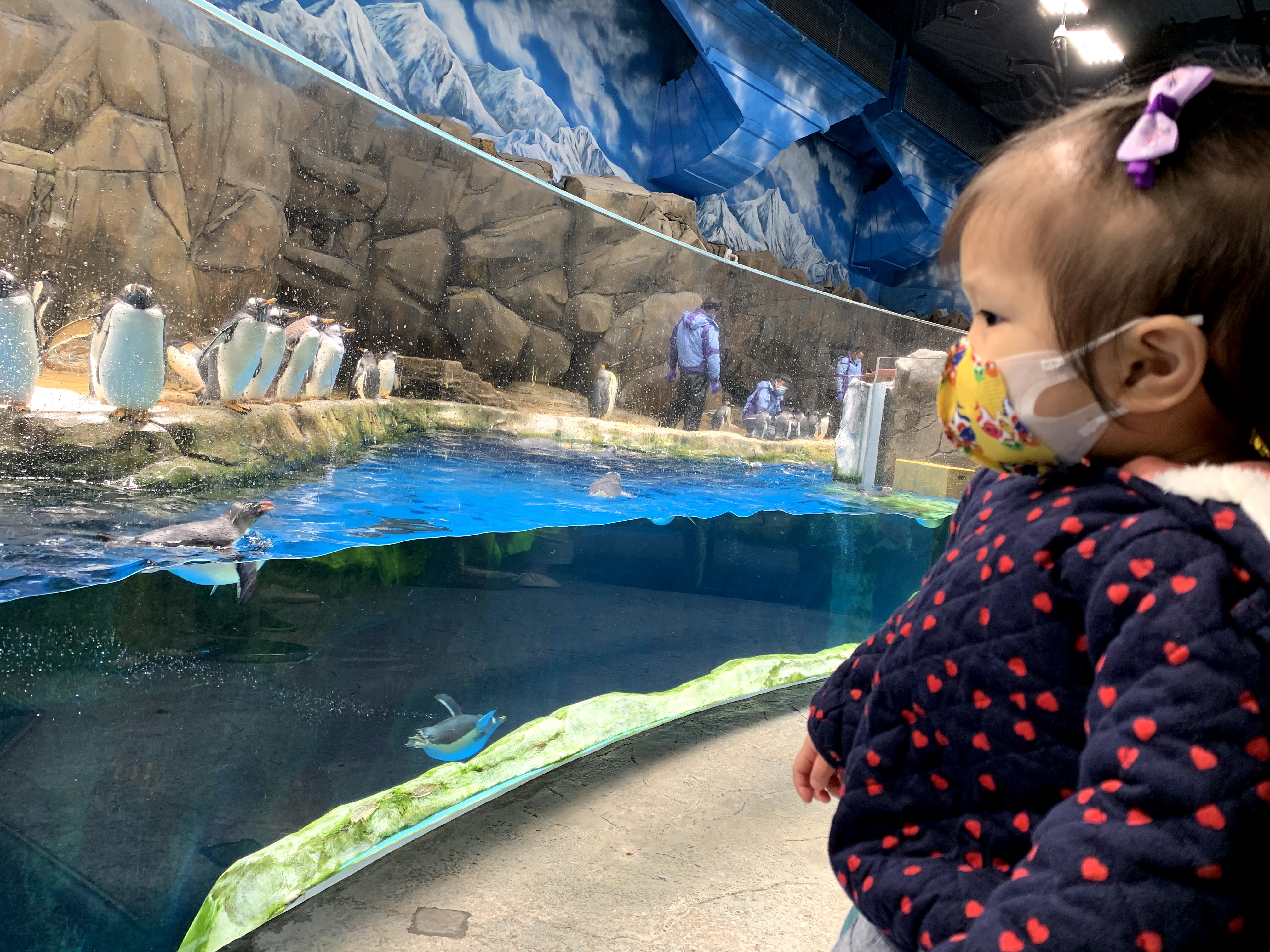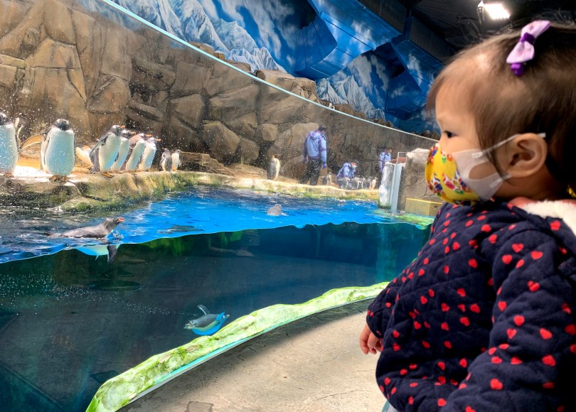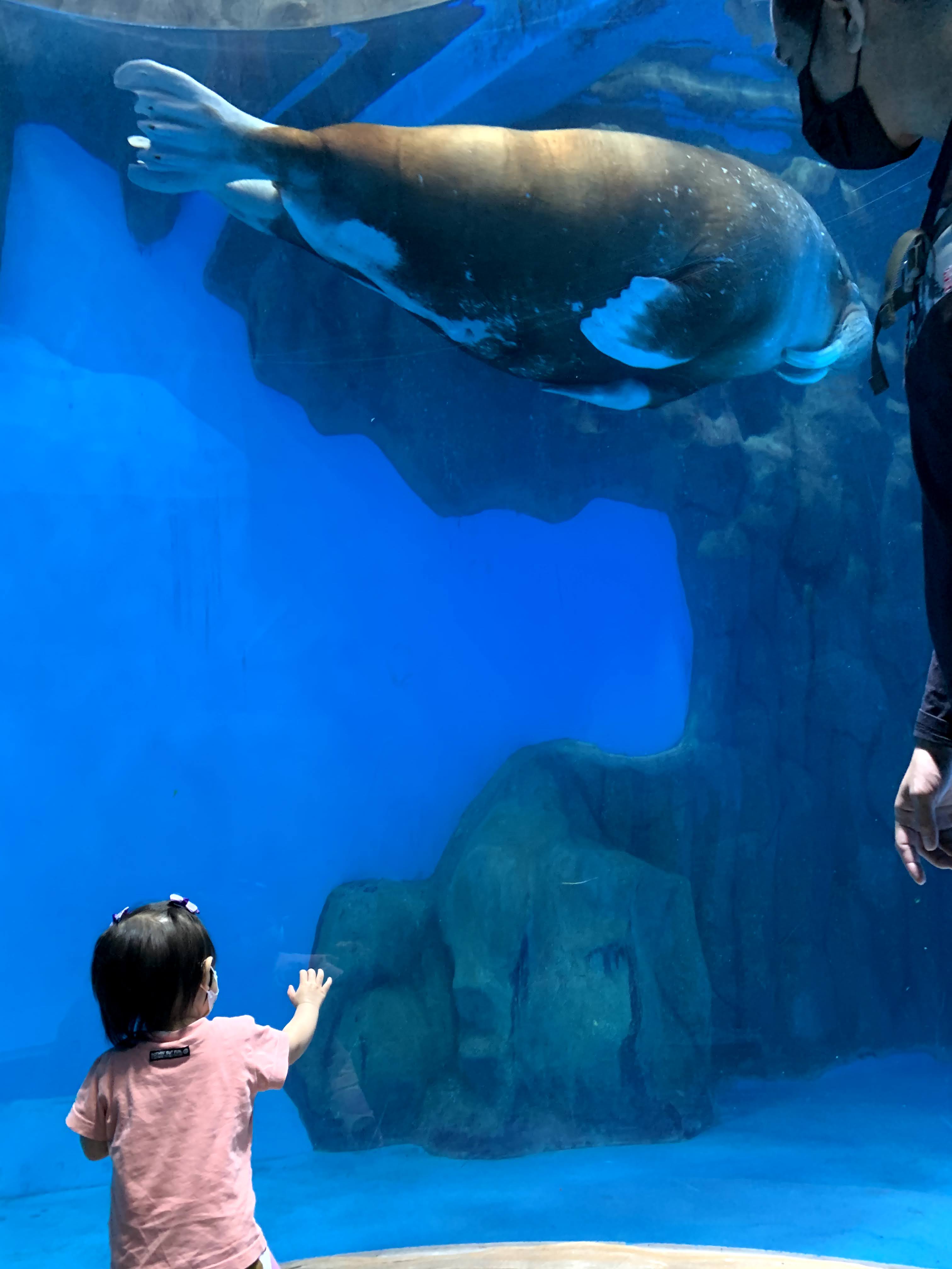 之後就是看了企鵝!上兩次她來海洋公園都是在企鵝館睡著了… 終於能親眼見到了!(溫馨提示:企鵝館是特別低溫,所以進館前有外套都穿一下比較好)最後看了海象,雪孤等等就回程了。