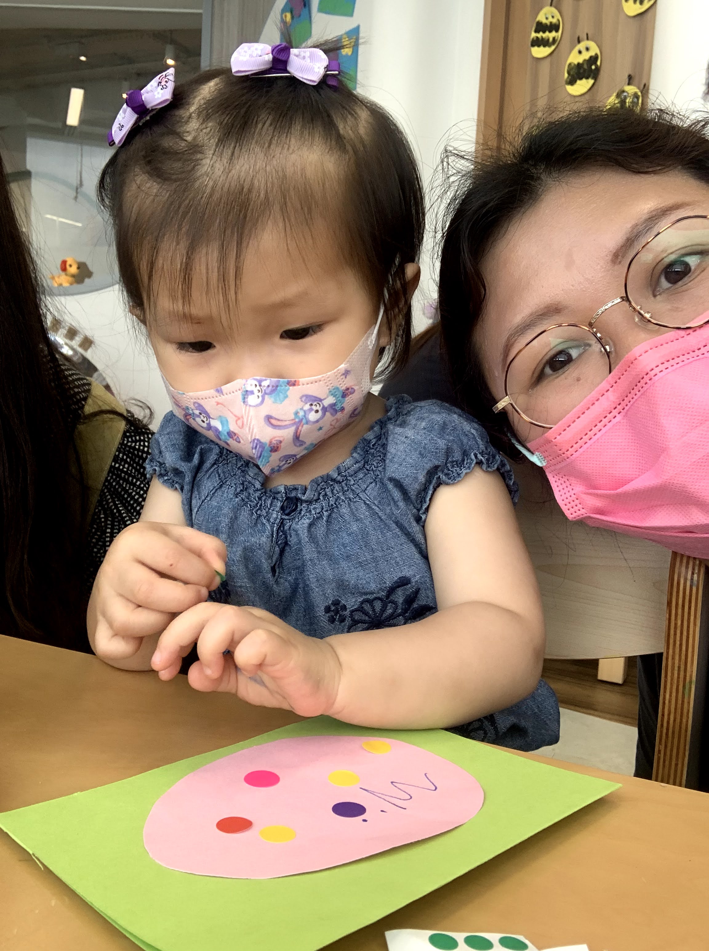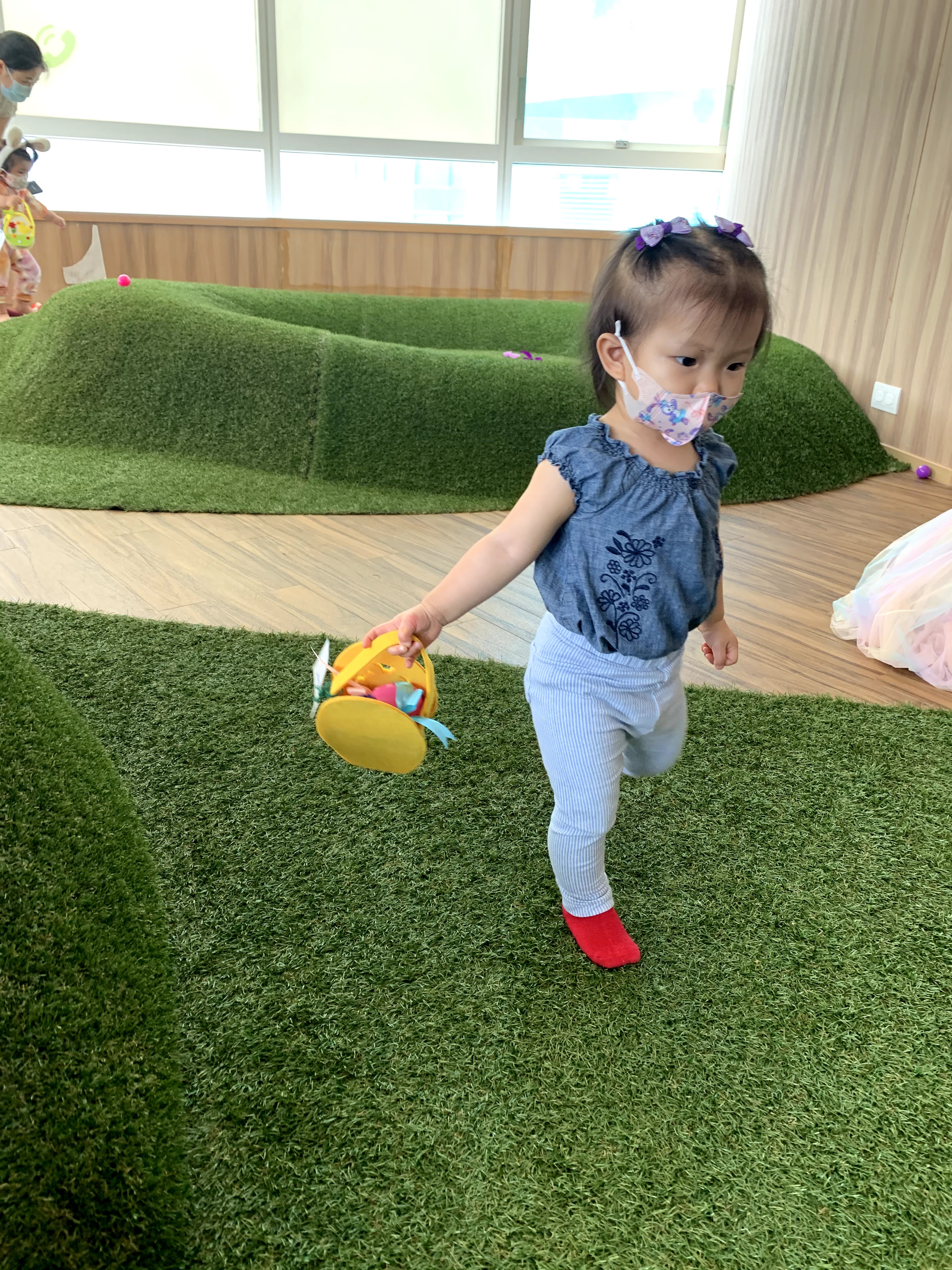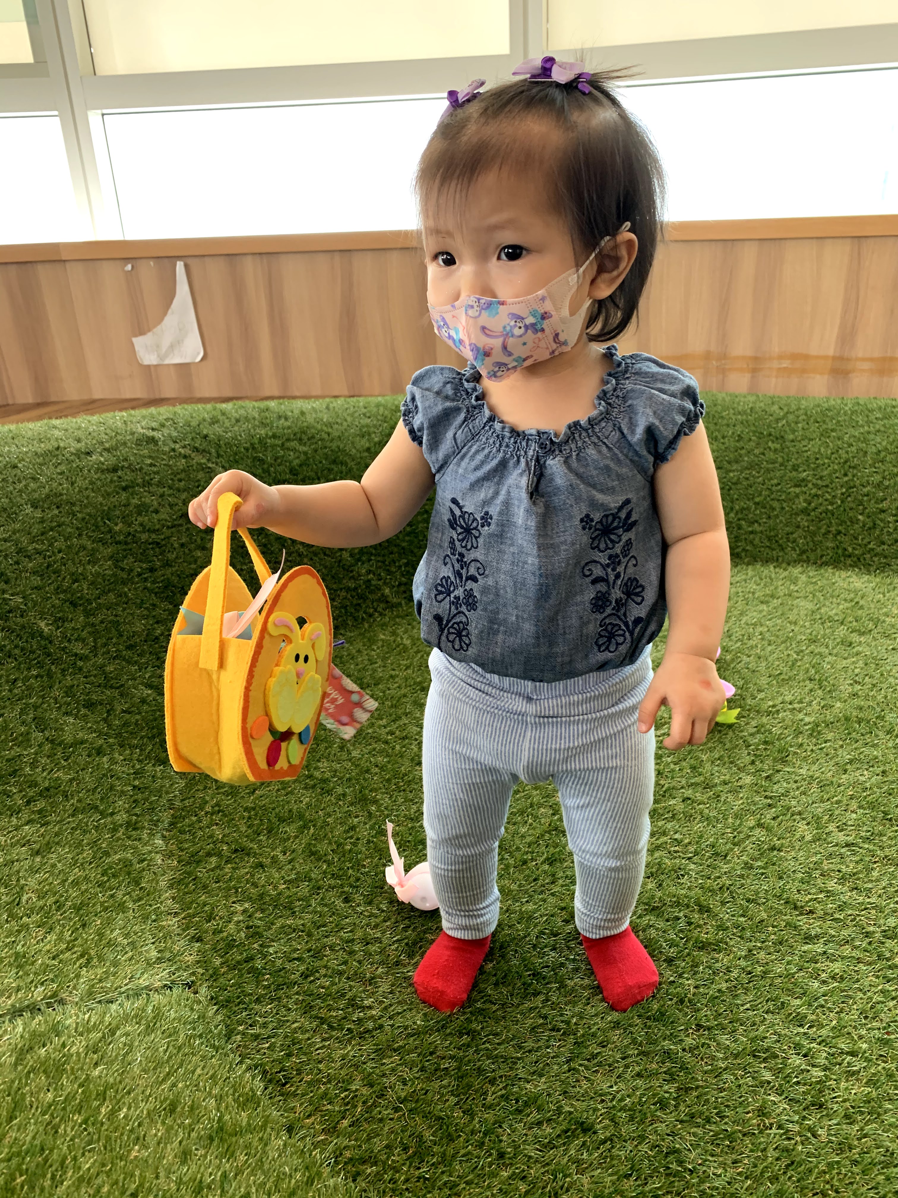 今天 playgroup 因為有特別節目,也讓我們體驗了最多人上課的一次。有十個小朋友啊!當中有部份小朋友會戴上兔耳朵或打扮成小兔… 好可愛呢!我沒有買裝飾給啦啦啊,但也選了 bunny 的口罩哈哈。班上有家長送了 Kinder 出奇蛋和寫了名字送禮物給大家,好有愛啊!