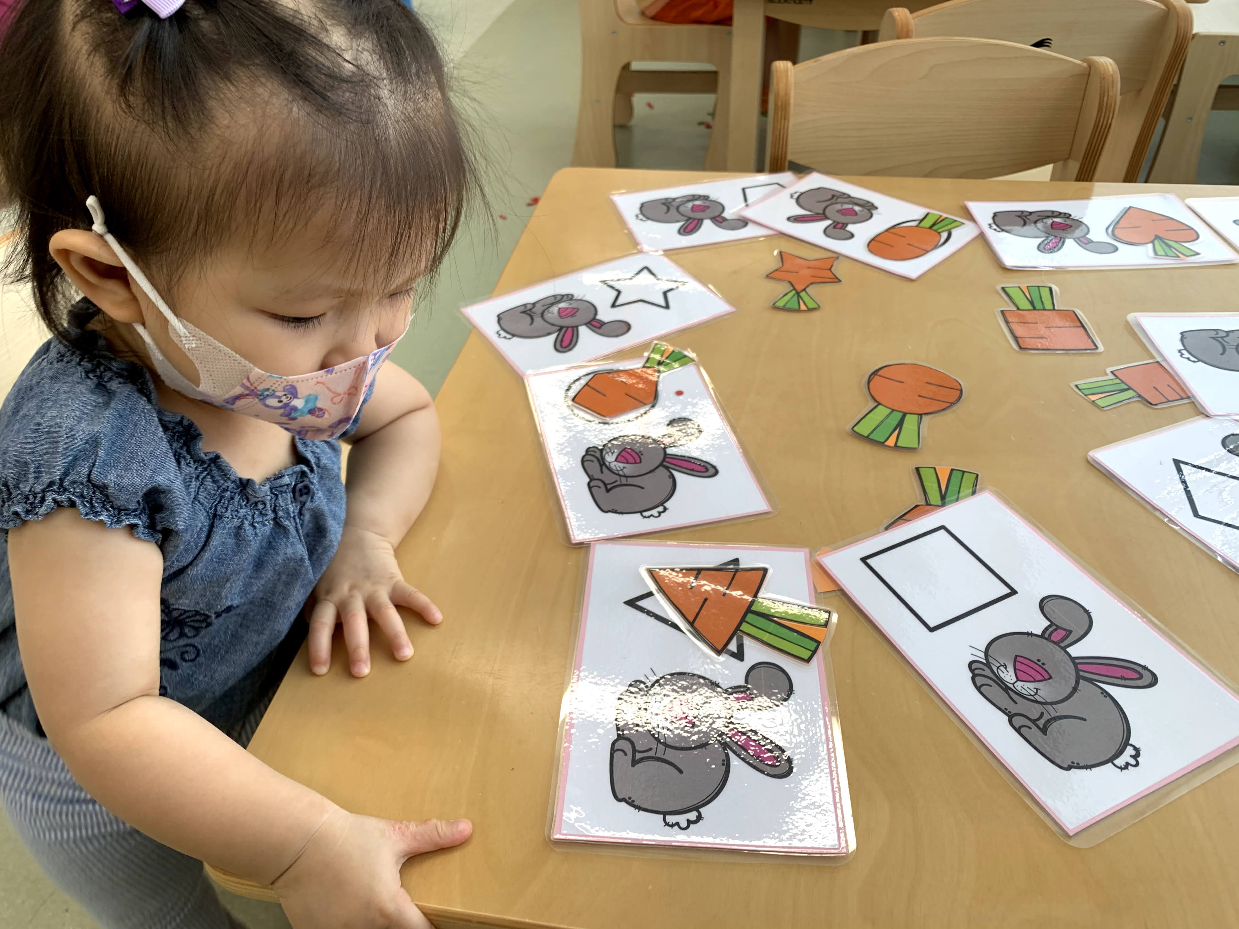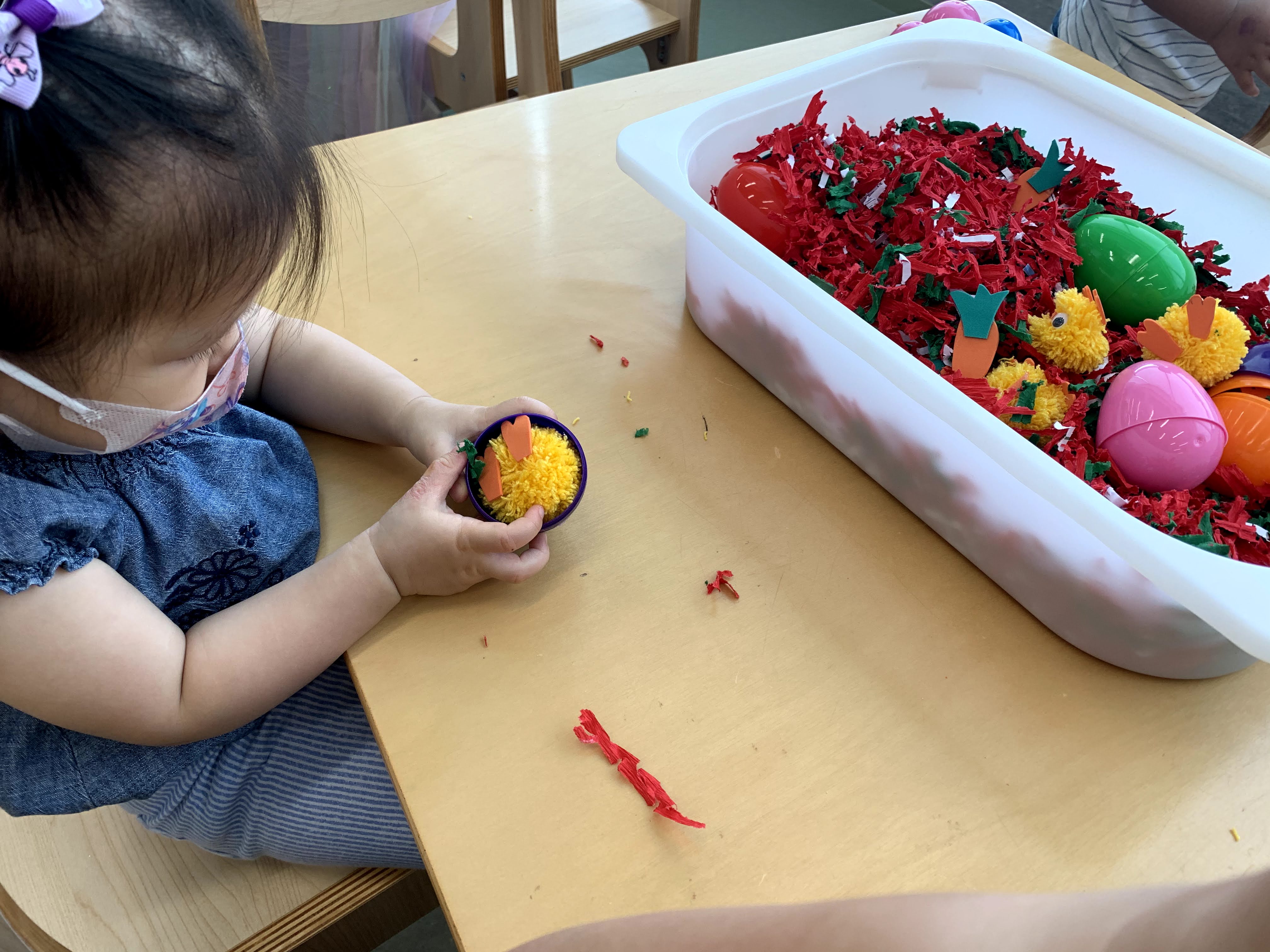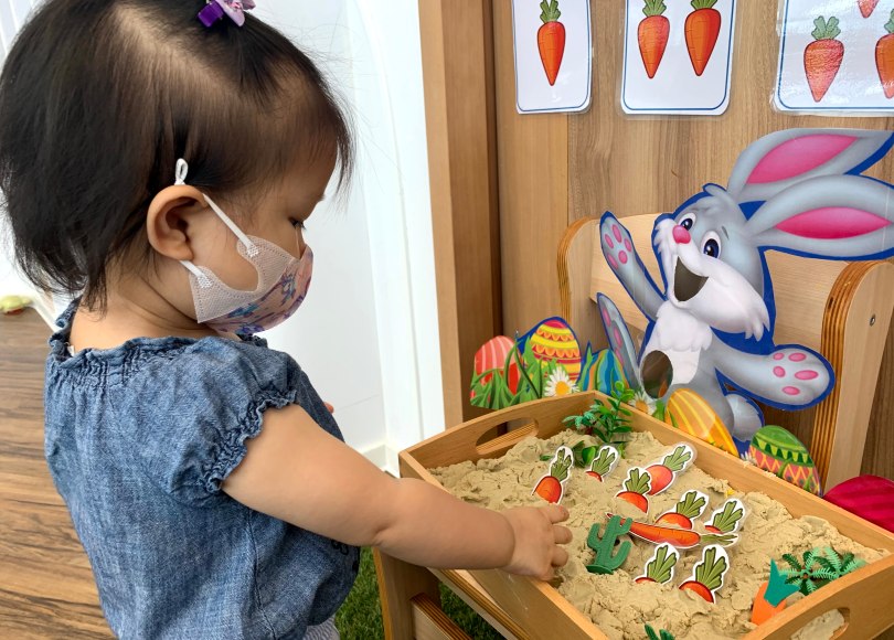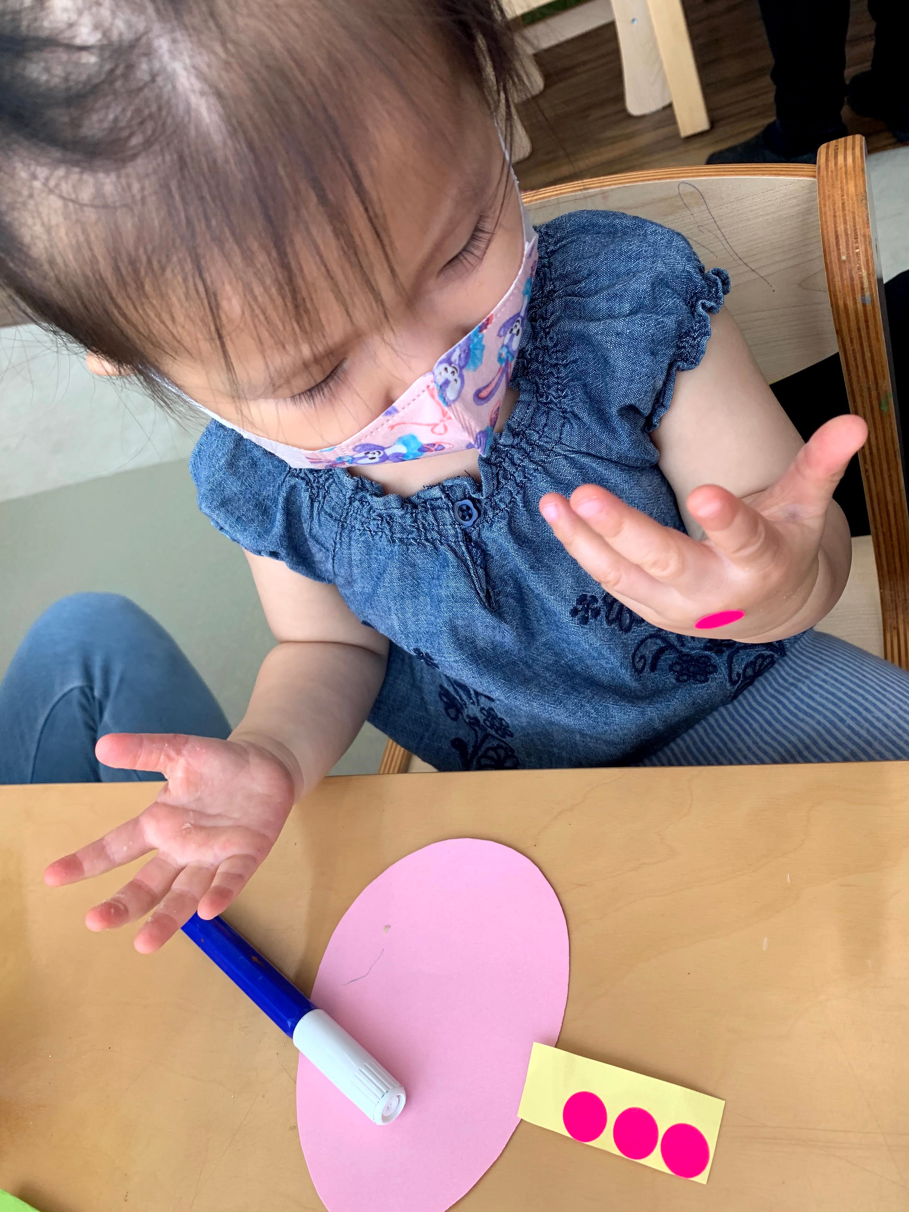 今天 playgroup 因為有特別節目,也讓我們體驗了最多人上課的一次。有十個小朋友啊!當中有部份小朋友會戴上兔耳朵或打扮成小兔… 好可愛呢!我沒有買裝飾給啦啦啊,但也選了 bunny 的口罩哈哈。班上有家長送了 Kinder 出奇蛋和寫了名字送禮物給大家,好有愛啊!