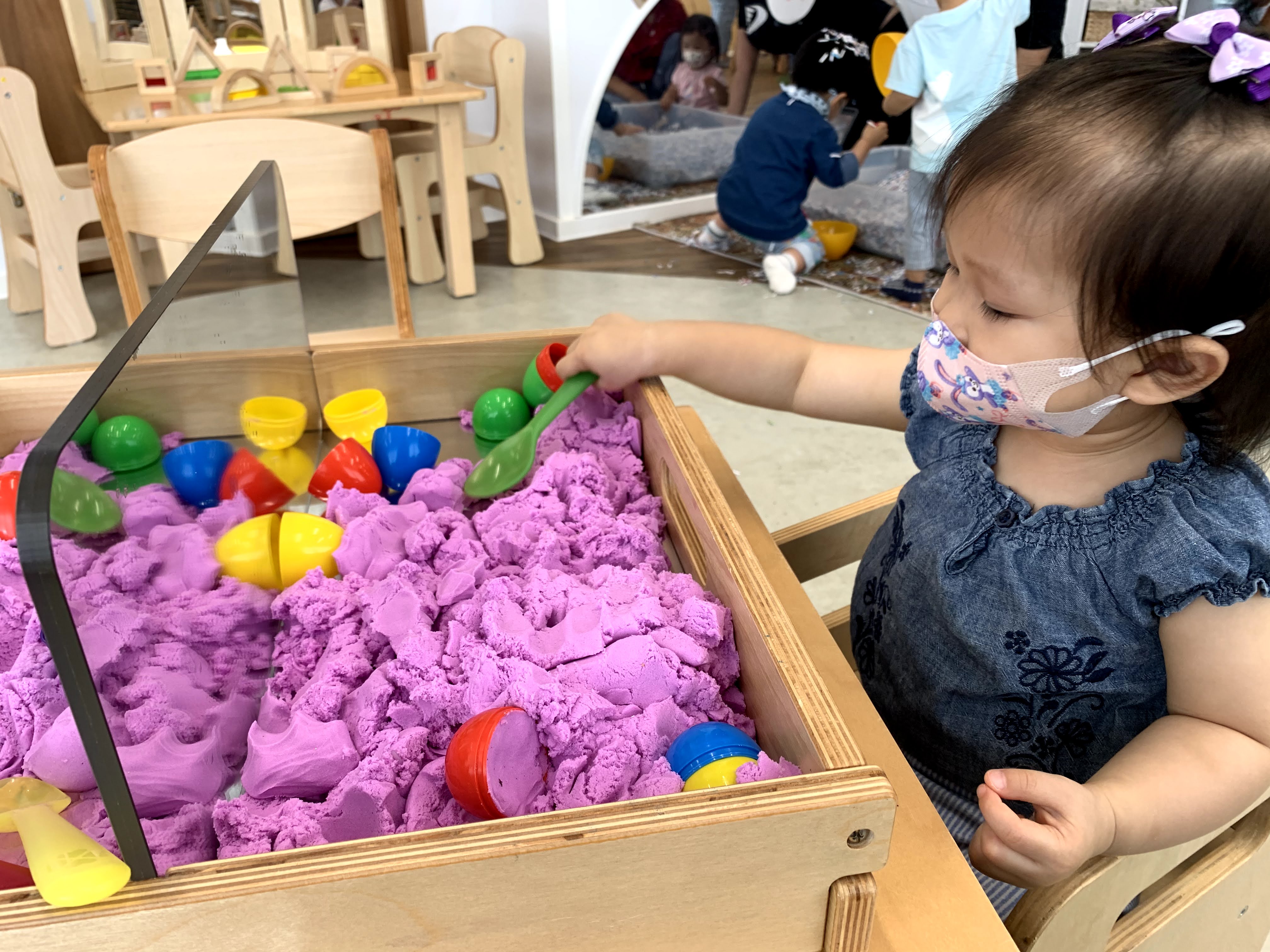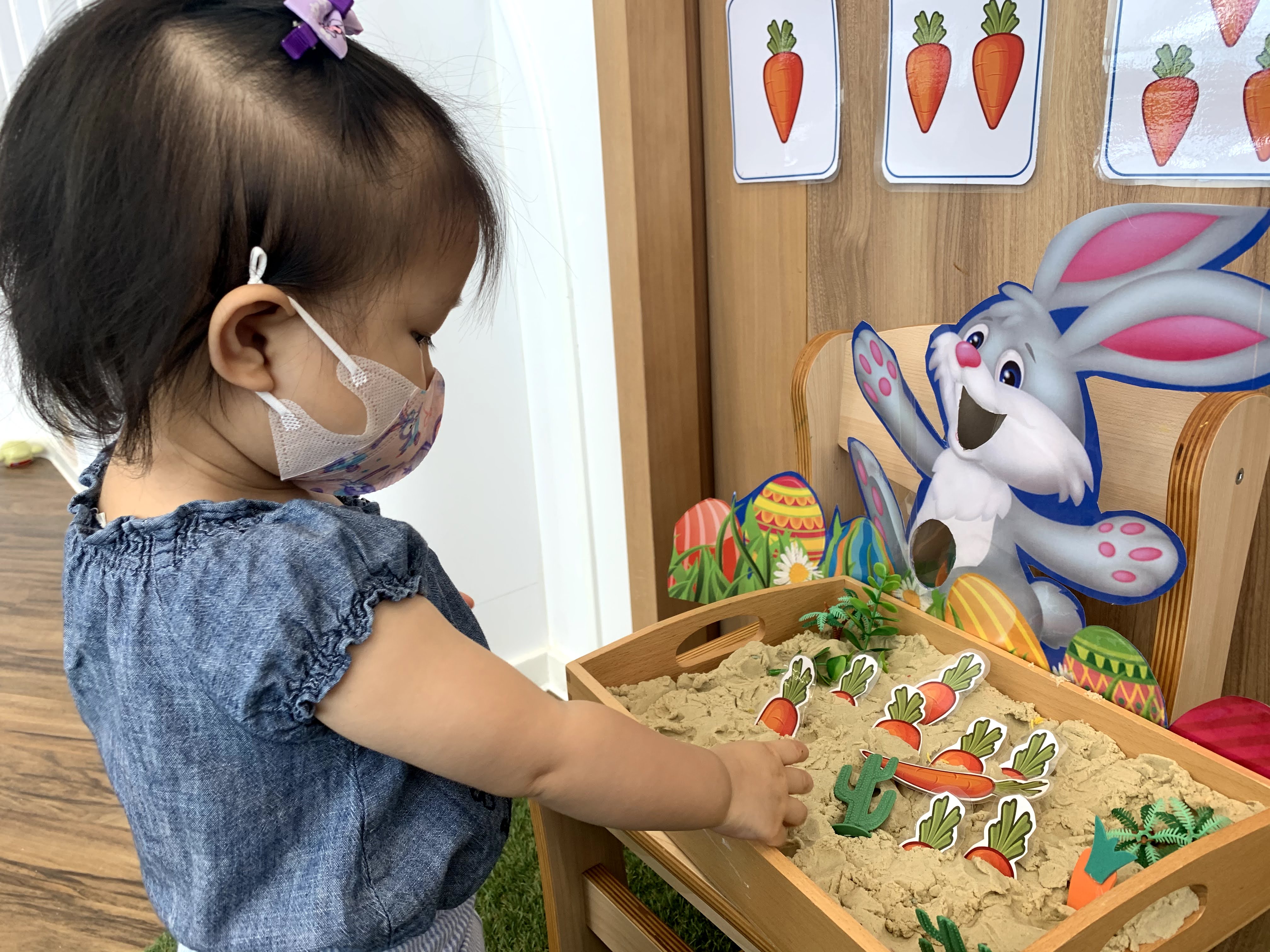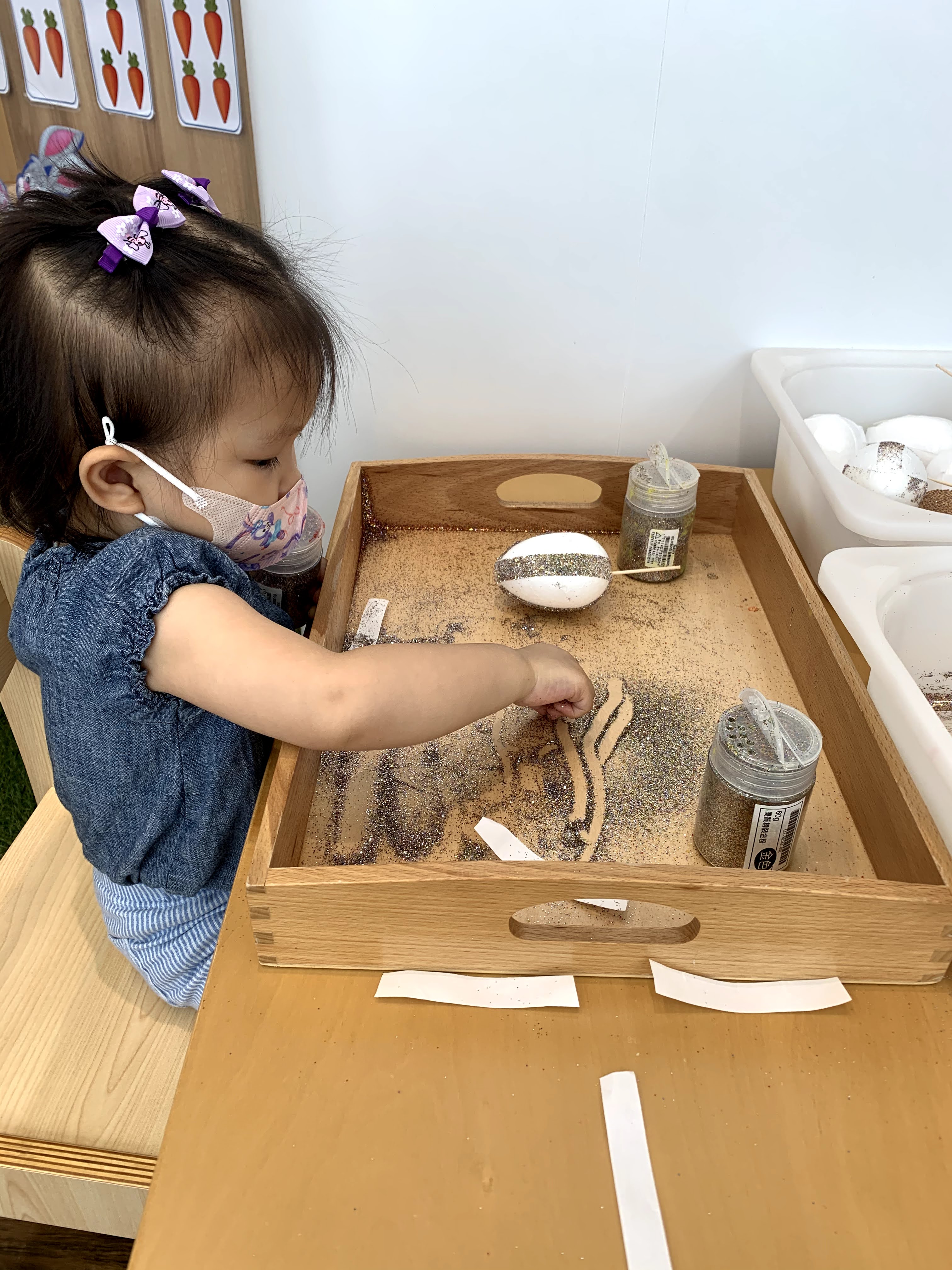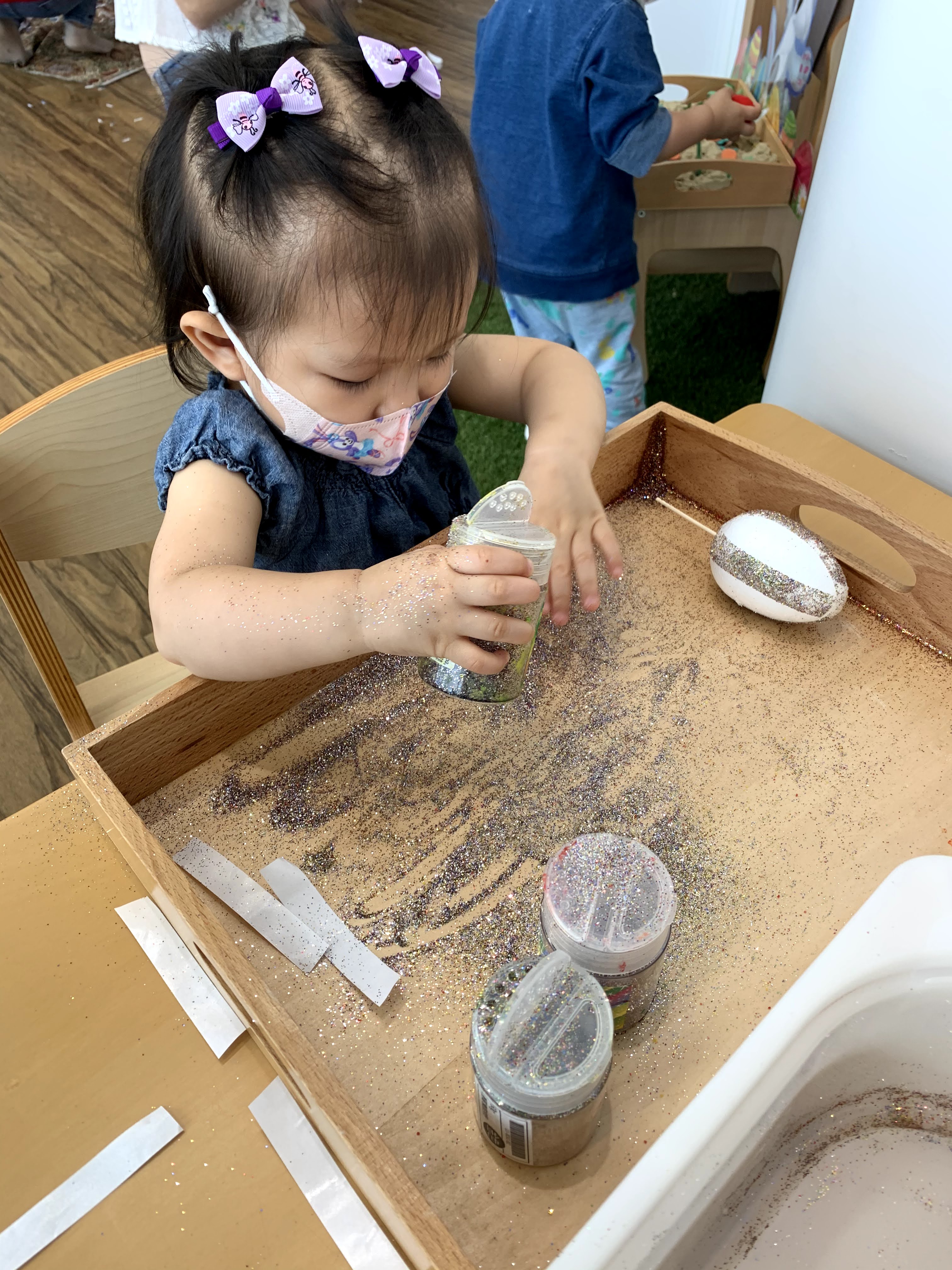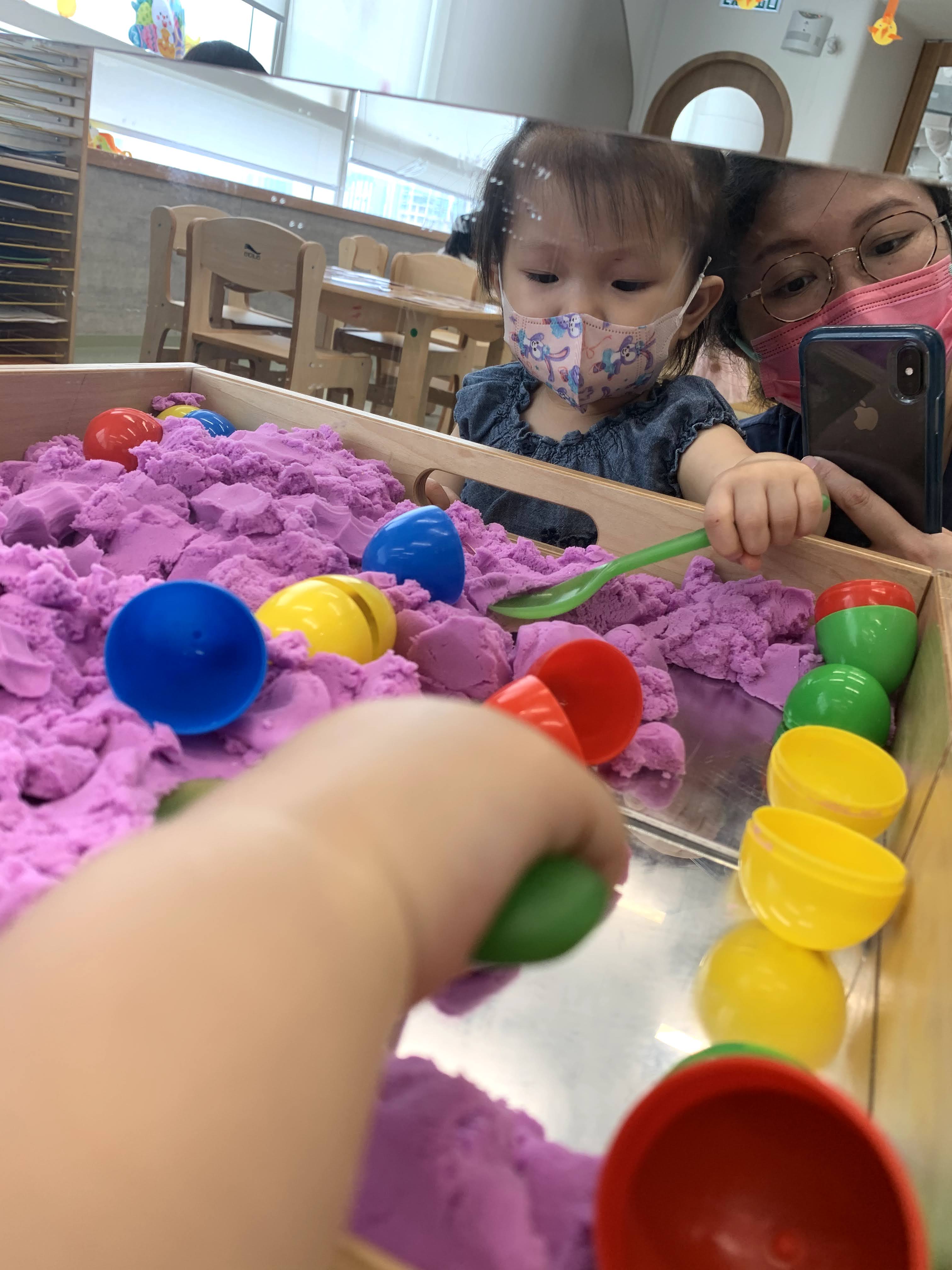進課室後,學校除了放好了平日的玩具,還有復活節主題的玩意,例如找蛋找紅蘿蔔,復活蛋手工,形狀配對等等。啦啦和媽媽都是第一次玩「玩具沙」(上網搜尋後見到名字叫「動力沙」),是不會弄髒的沙。而其中一個設計復活蛋是用了閃粉,啦啦也是第一次玩,我和她的小手都黏了閃閃的粉末(容易清洗走)。