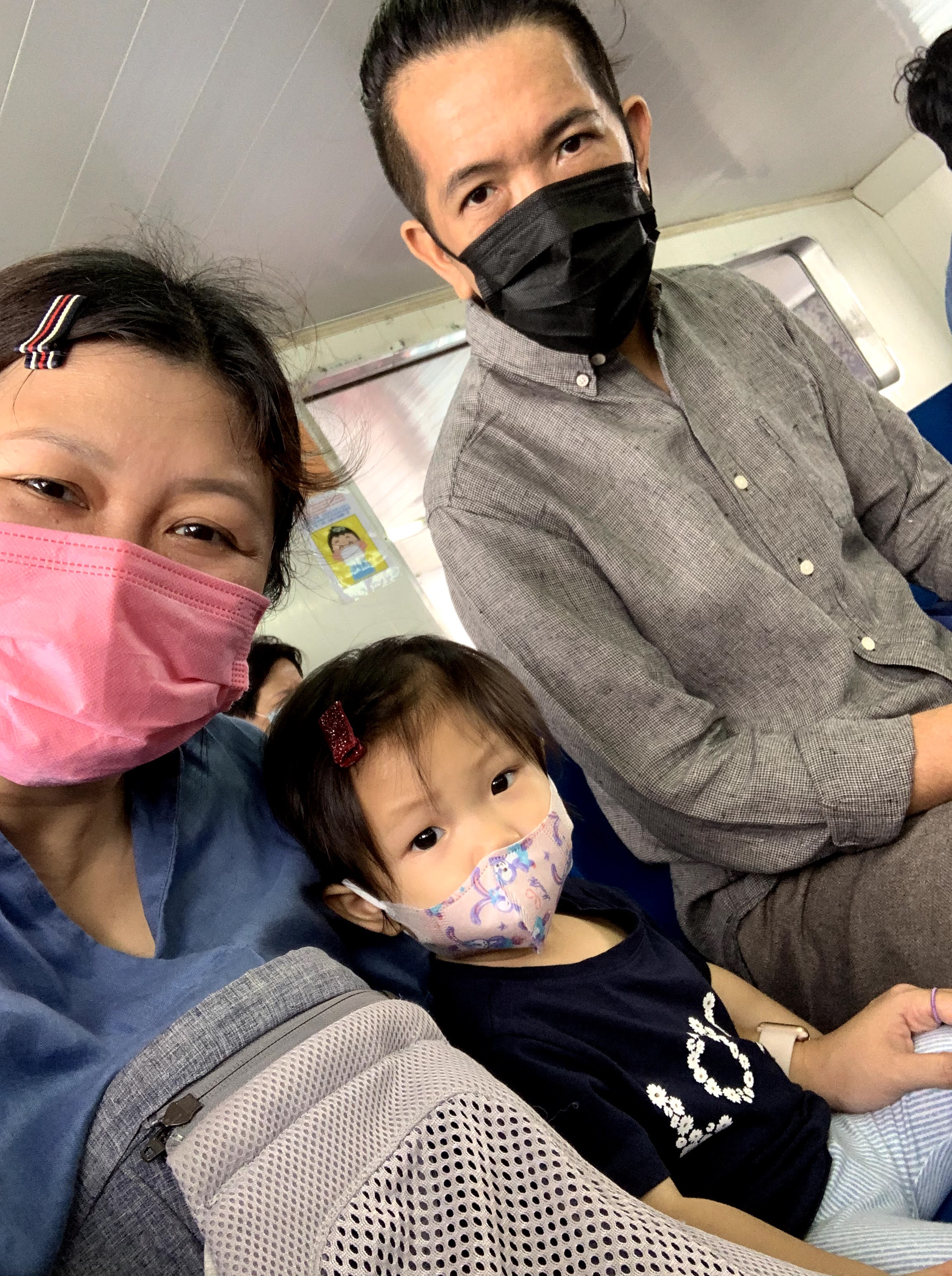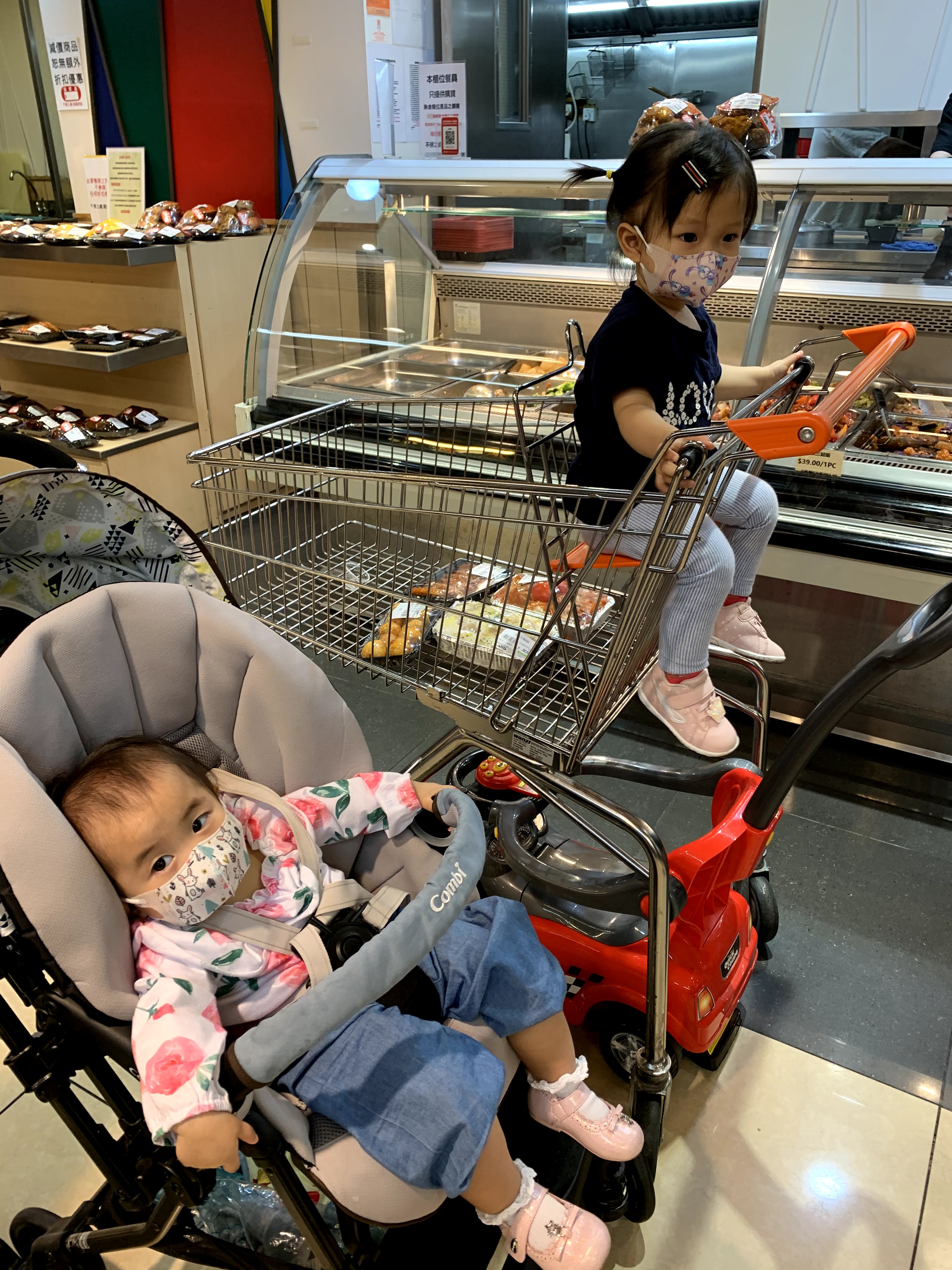 玩完後便一起去超級市場買外賣晚飯。啦啦第一次坐超級市場這麼高的推車!隔著口罩也感覺到她開心呢!