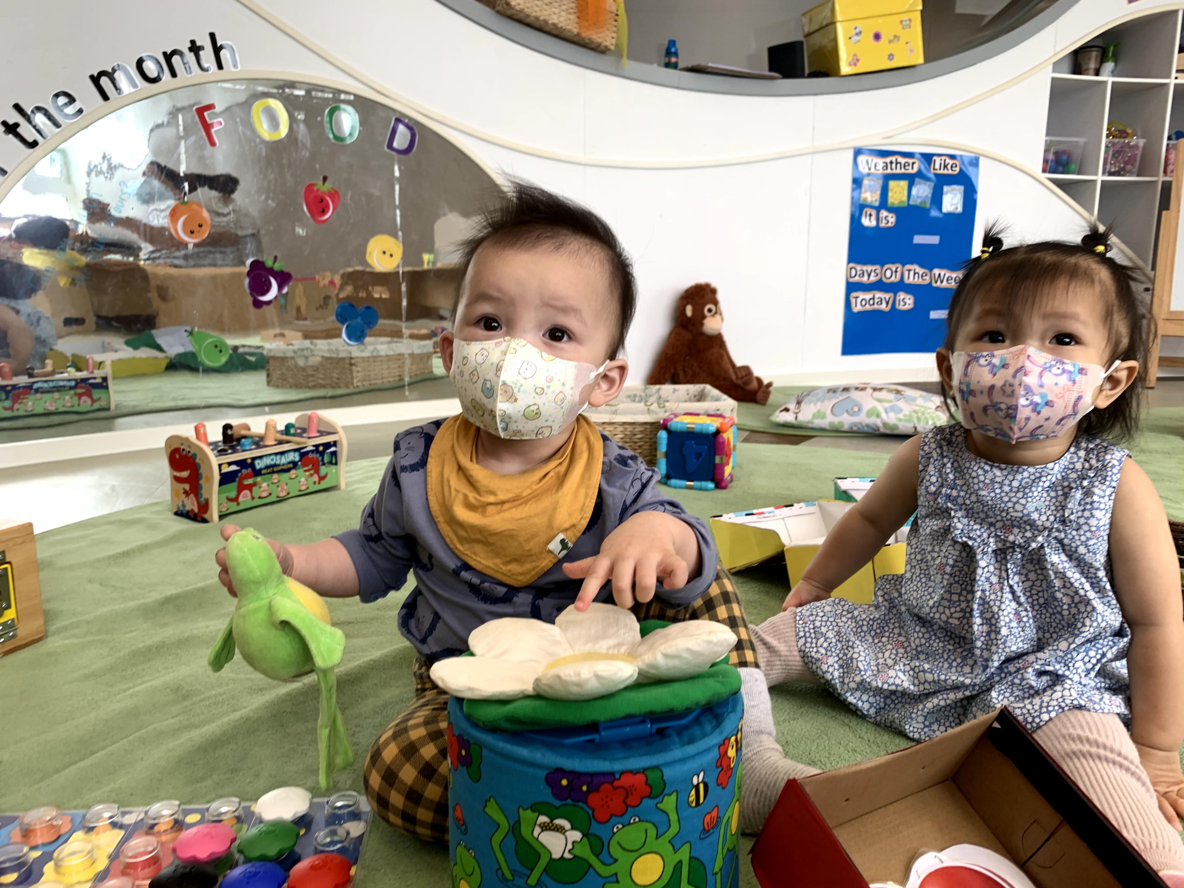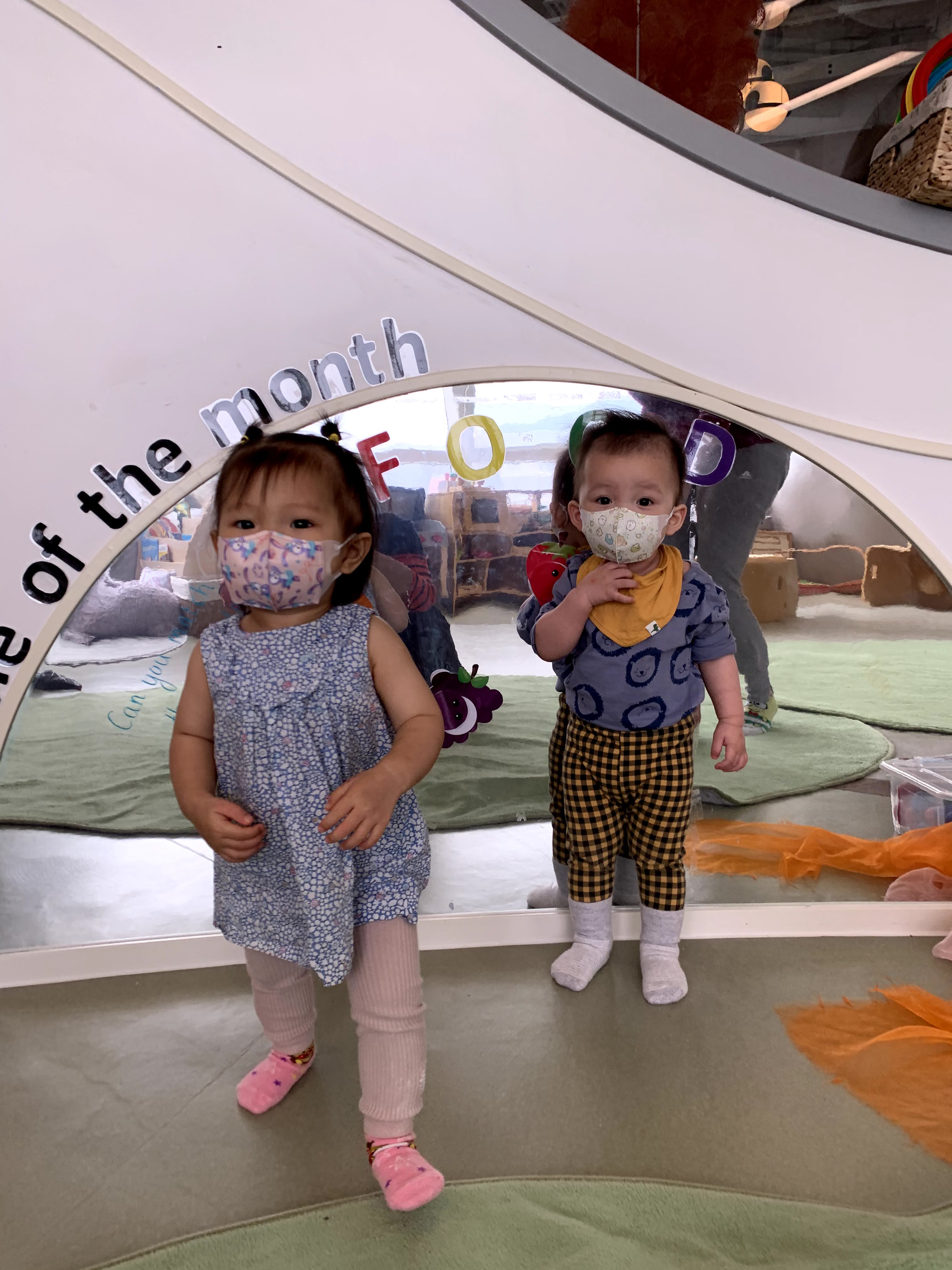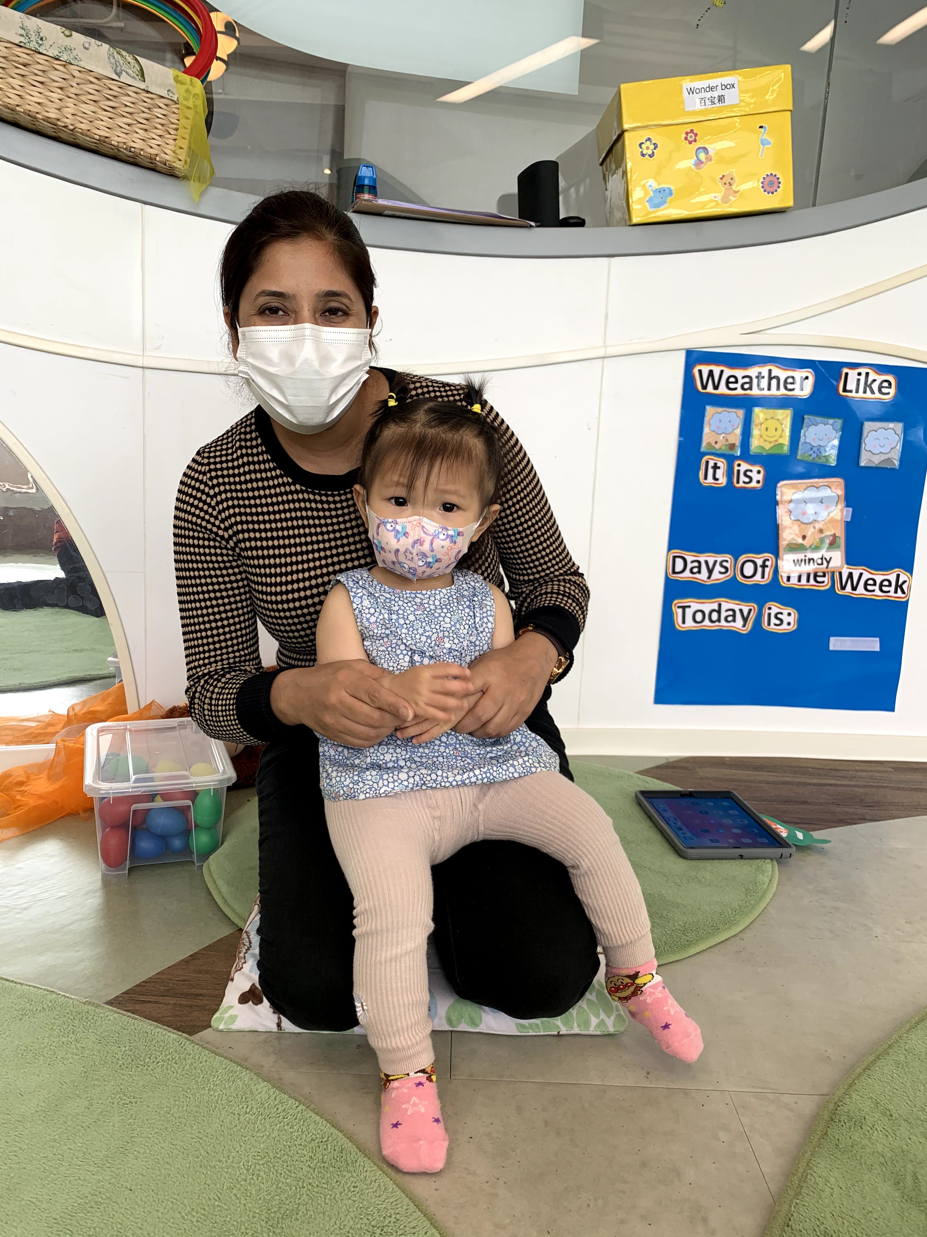 課結束了,啦啦跟 Miss Sonia 拍照,她雖然只有十五個月大,但我知道她很喜歡 Miss Sonia,老師也很掛念她。其實今天才是老師第一次看到啦啦的樣子(拉下口罩讓她看了一下),她說啦啦很美,啦啦離開學校時走去抱了 Miss Sonia 還有主動給 Fly Kiss。老師也有再抱抱啦啦,說會掛念 Skylar。
