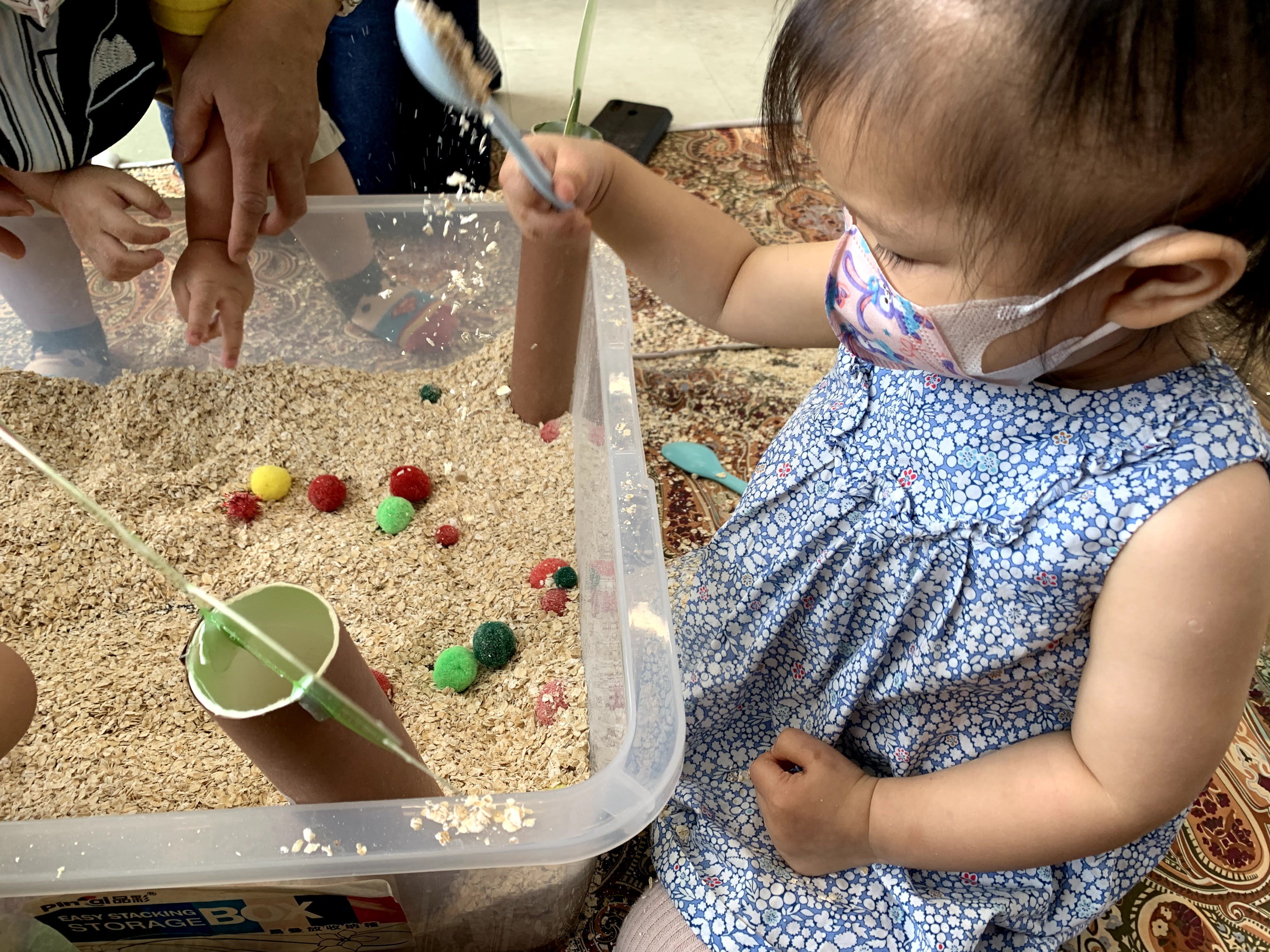 Dibber 的 Messy play 很有心思,我們經常也見到有新的玩意,很少重覆。今天是玩麥皮!(每次一進入課室時,啦啦媽就會期待一下蓋著布下的大盒子是裝了甚麼)