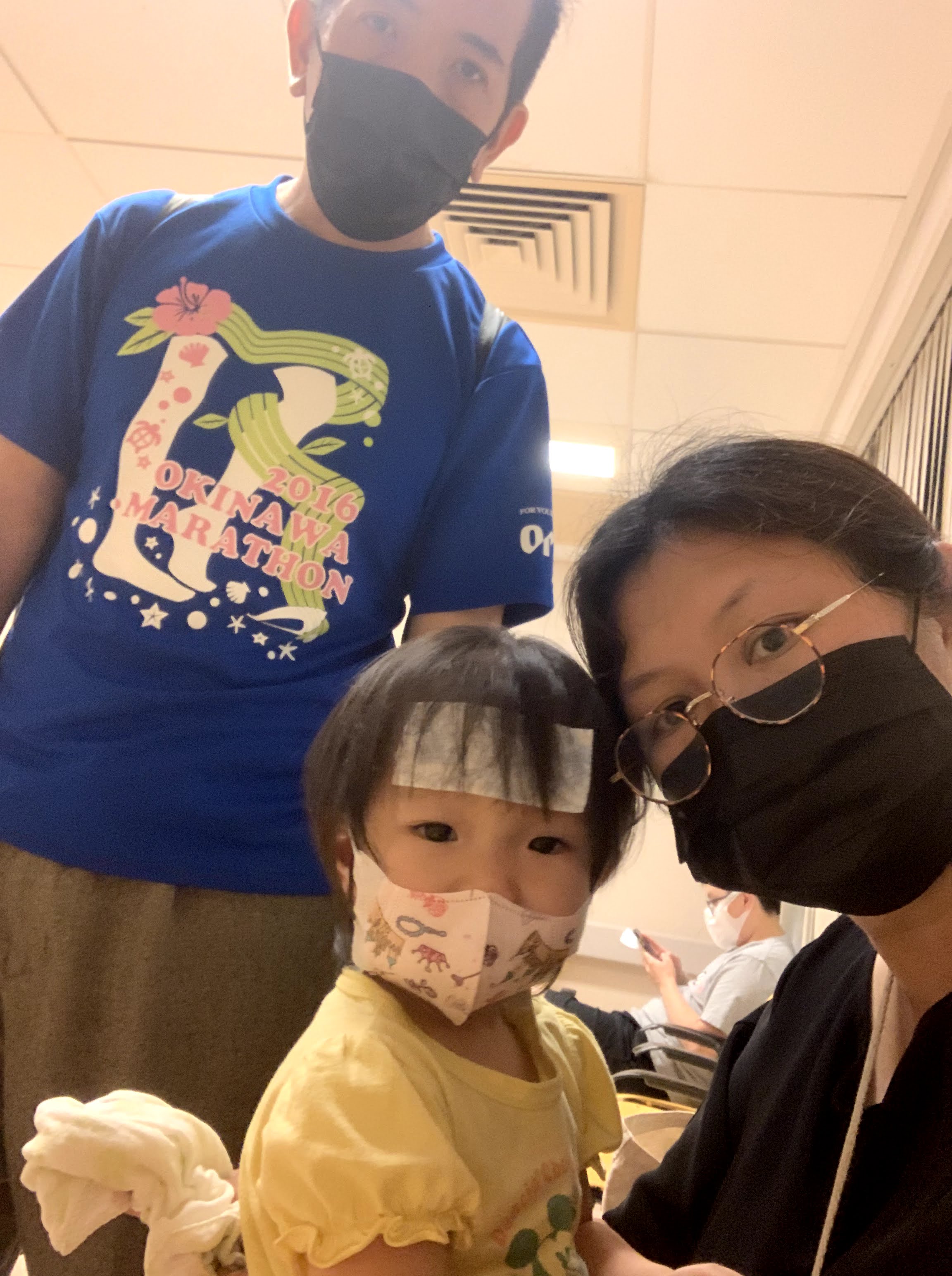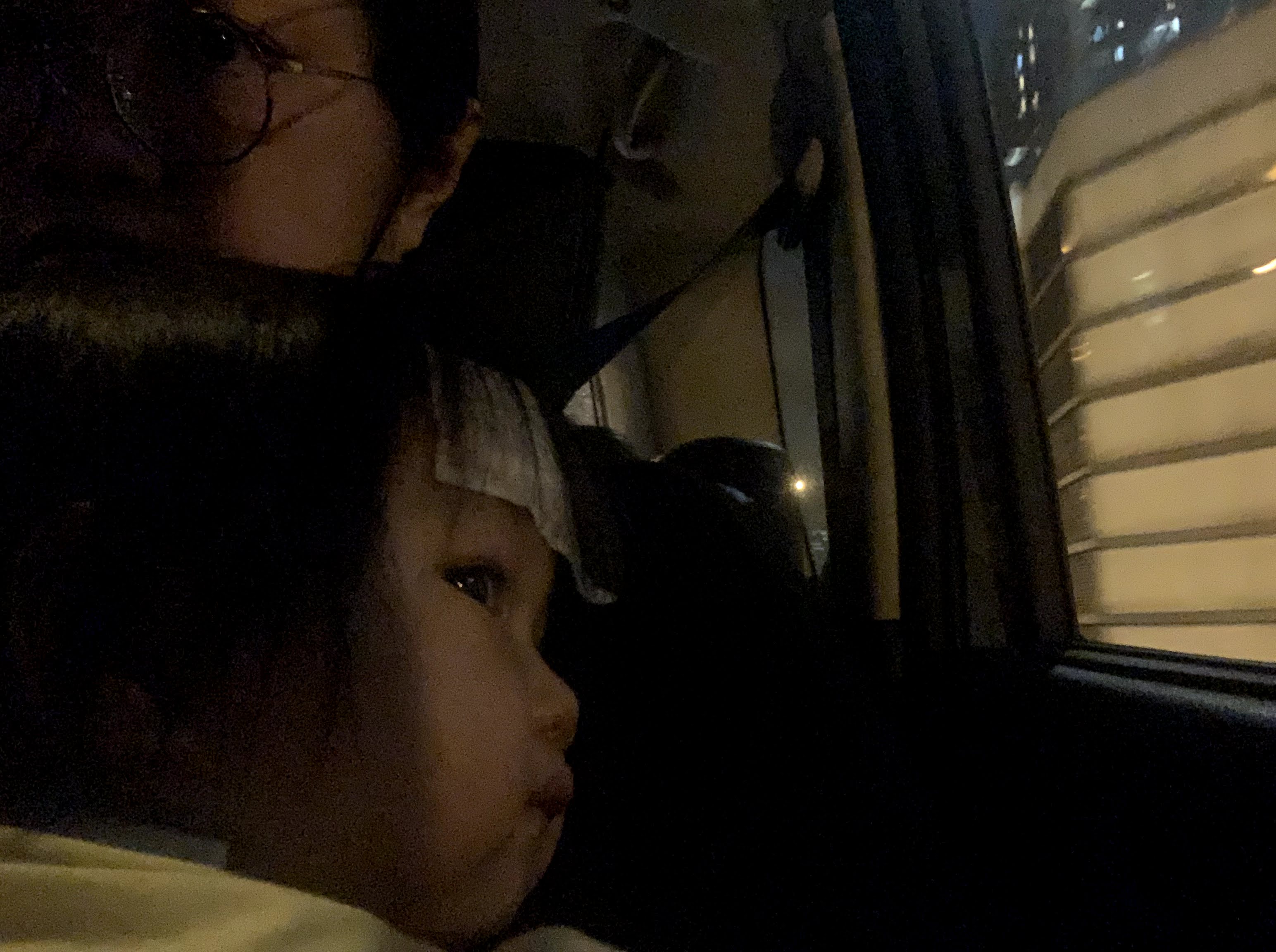 我和爸爸給了她退熱貼後,就趕快帶她去醫院了。若要到政府急症室,應該要等到天亮… 所以我們便去離家最近的法國醫院,那裡有二十四小時門診部(並非急症室)。