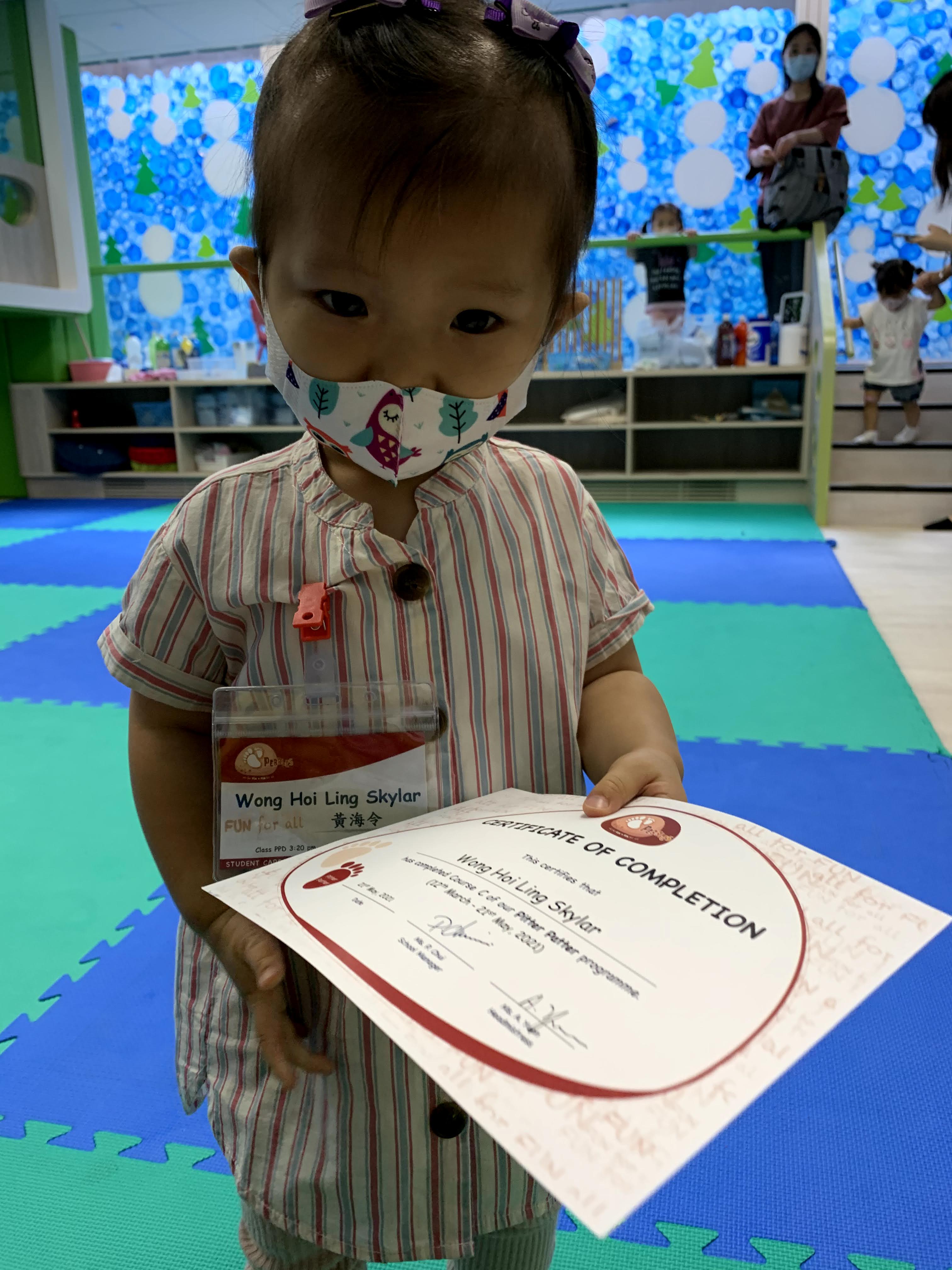 第一次見證女兒親手接過證書,心裡真的很感動。雖然不是甚麼厲害的畢業證書,但這一張紙就見證著我們一起共同做到的。而且每星期上討看著她進步,兒童學習的過程很奇妙呢。連同班上其它的小朋友,我也看到他們在成長。