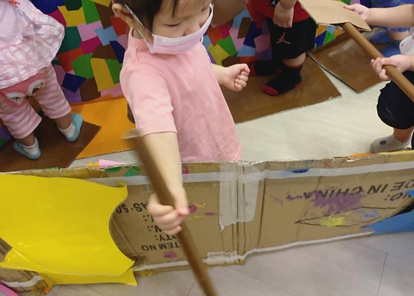 然後,每個小朋友都有一枝以紙皮造的船槳,家長們一起和小朋友聽鼓聲學習划船的動作。其實我也沒有試過「扒龍舟」,和啦啦一起樂在其中呢。