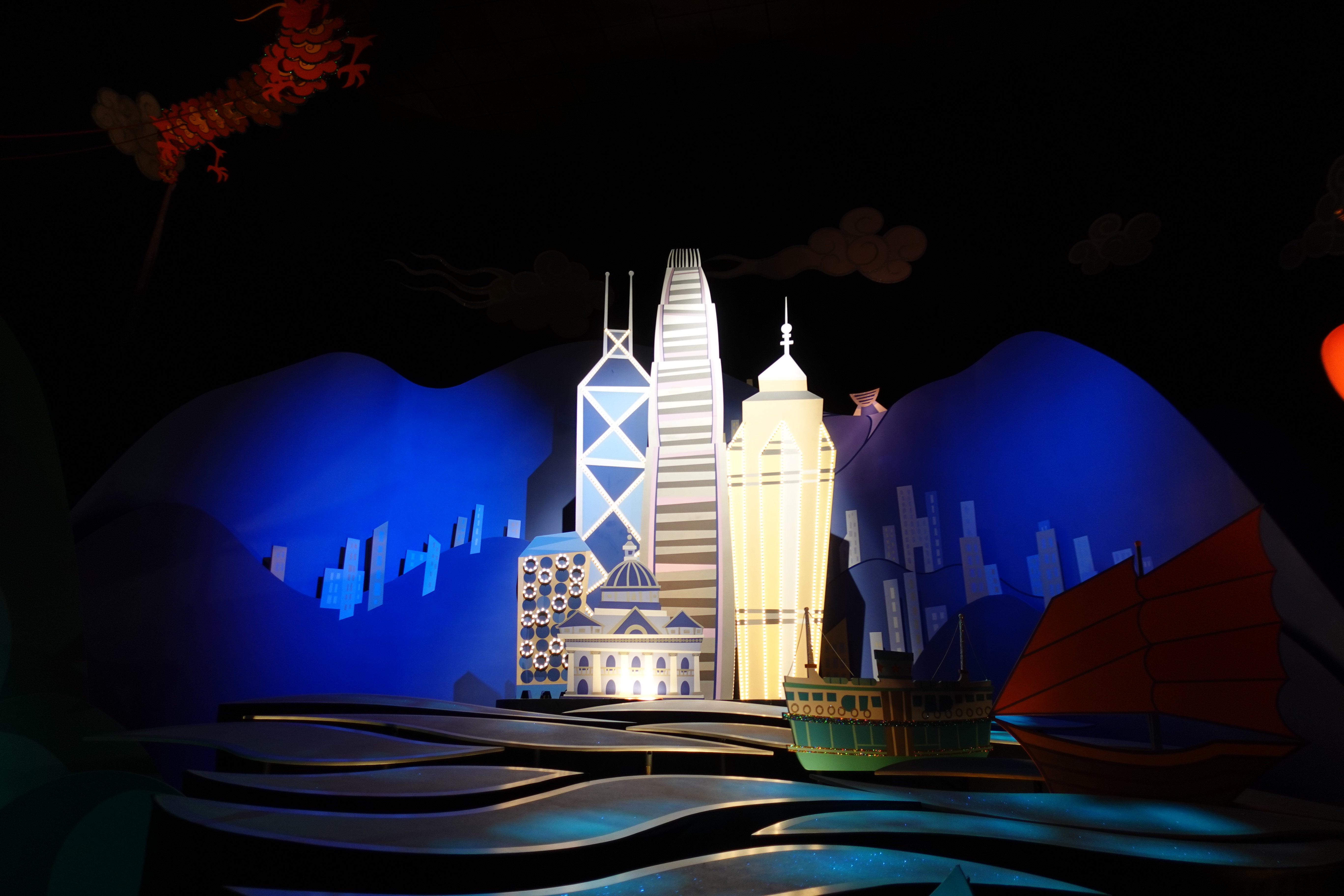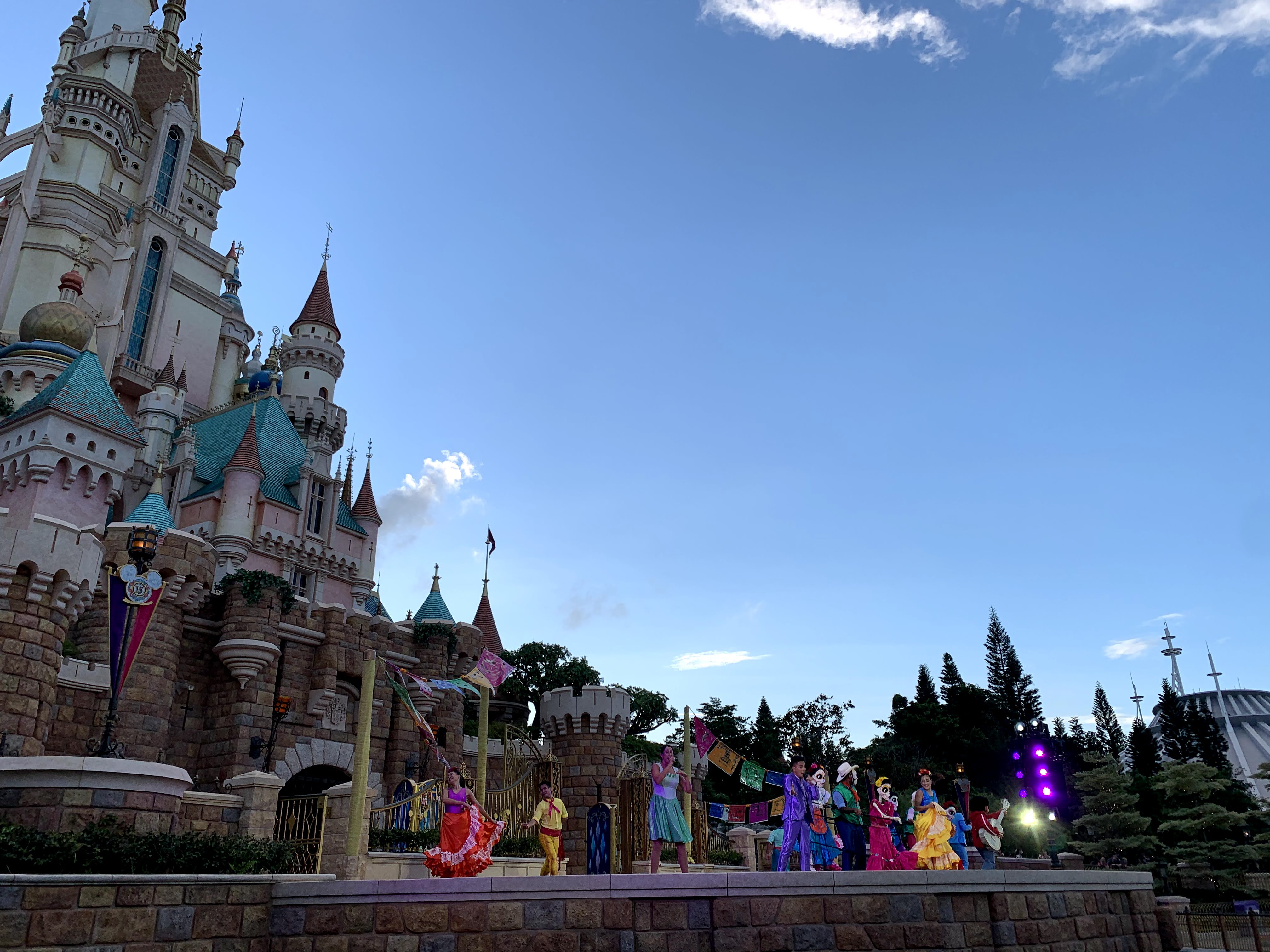 歌舞演出很熱鬧,有很多人物登場,連「玩轉極樂園」COCO 也有,還有噴泉配合!香港廸士尼雖然比世界各地其它的廸士尼小,但是在樂園裡聽到人物說的對白是廣東話,都覺得特別親切!
