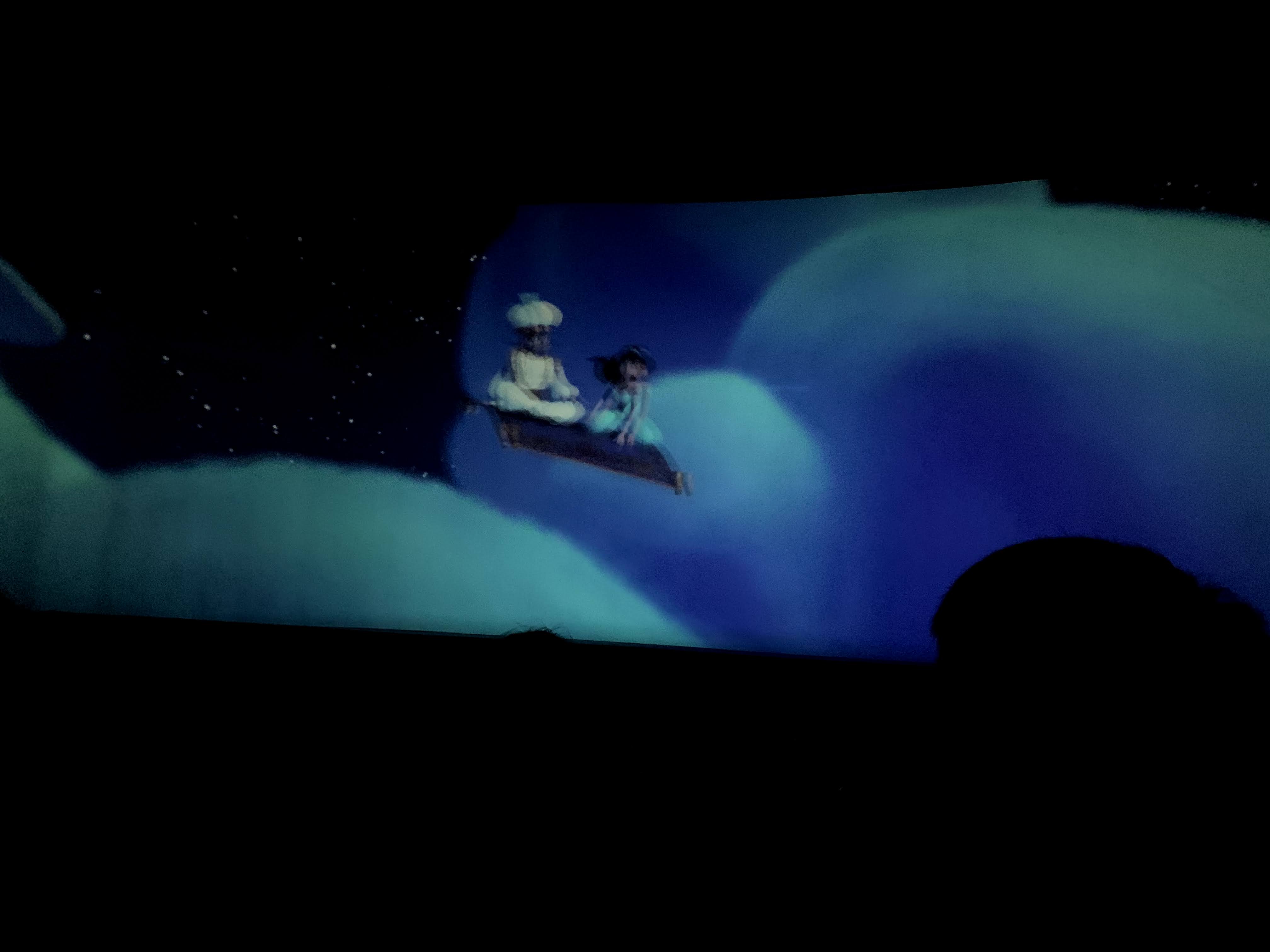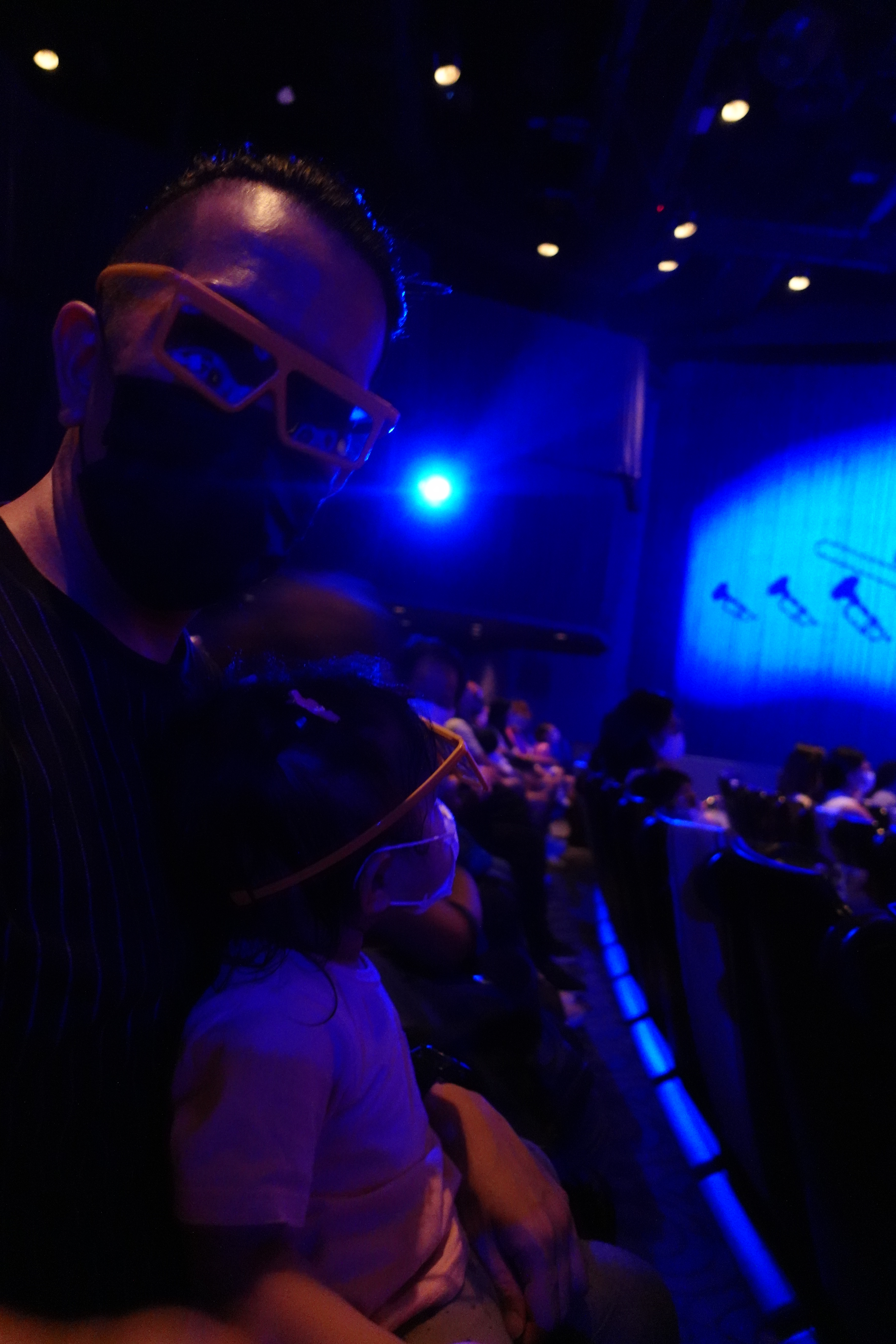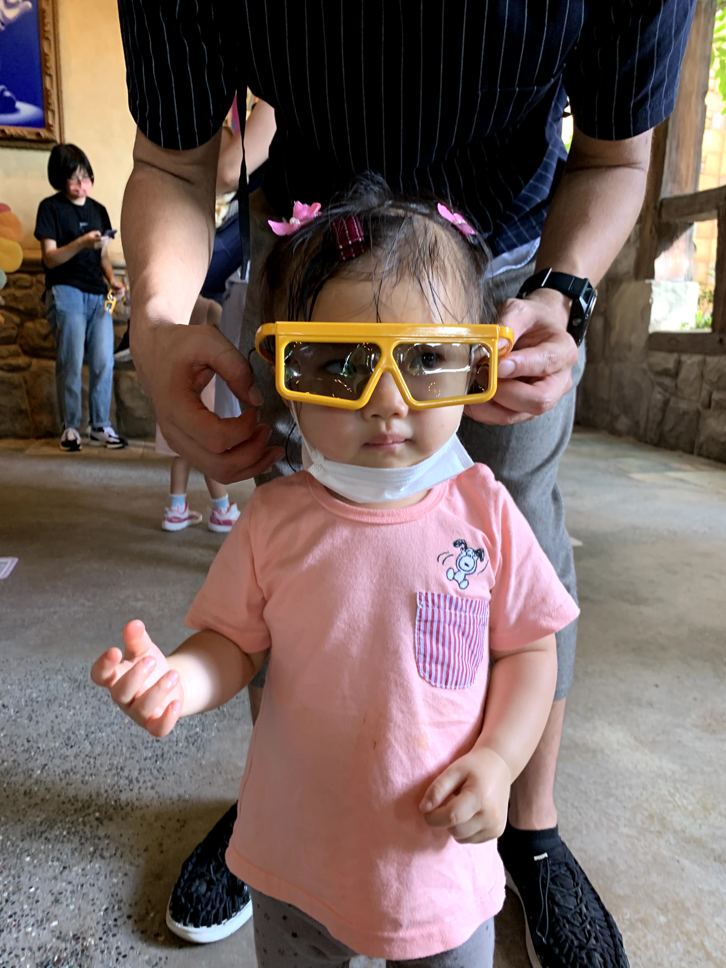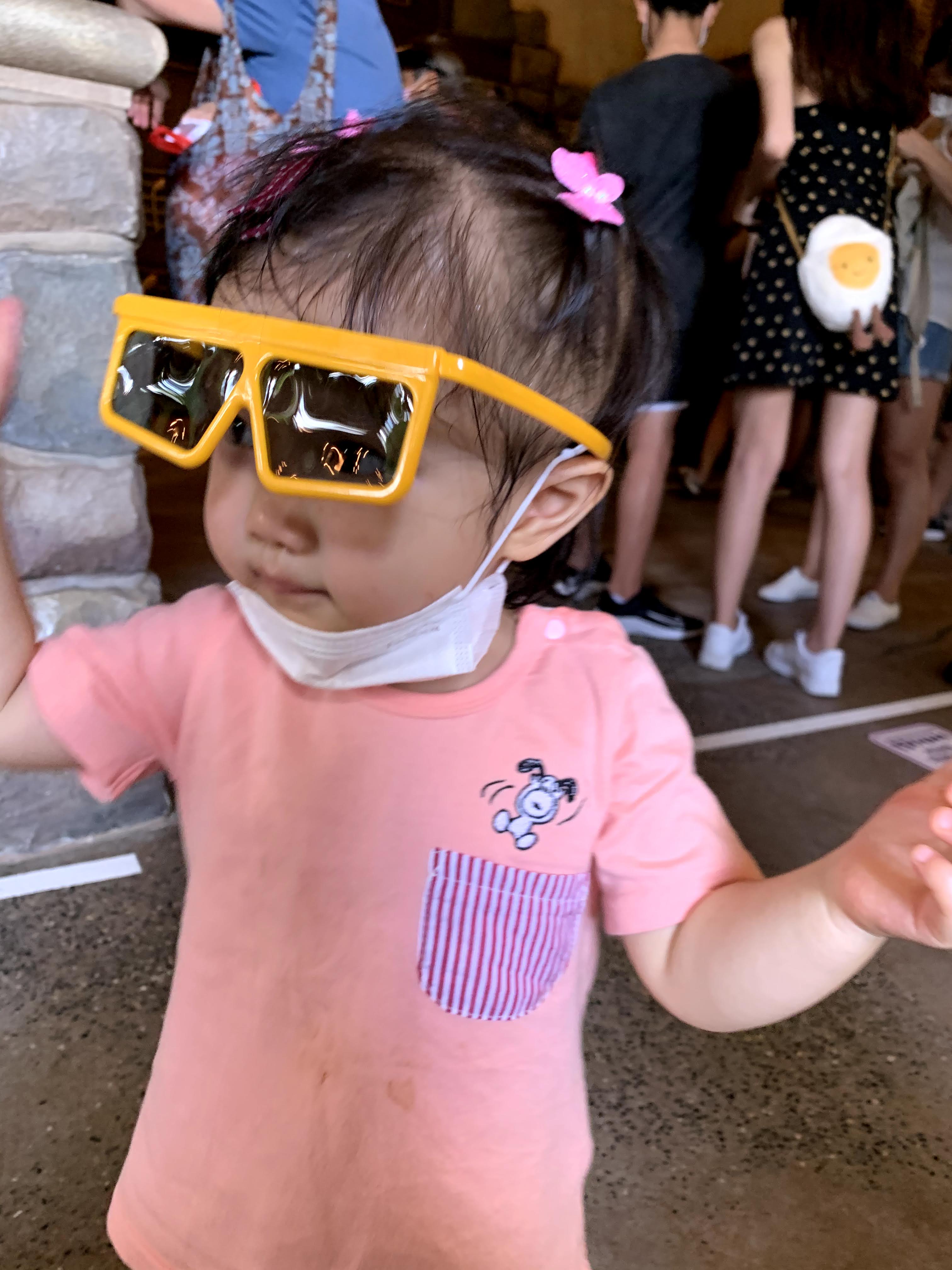 休息完再排隊看秀,是在幻想世界的「米奇幻想曲」,我小時候很喜歡看的 Fantasia 卡通片!演出是 3D 立體音樂劇場。在等待入場的時候,已經派發了眼鏡,對啦啦來說眼鏡是有點大哈哈。寫blog 時再重看我們拍的照片,還是深深感受到當時的熱浪…。