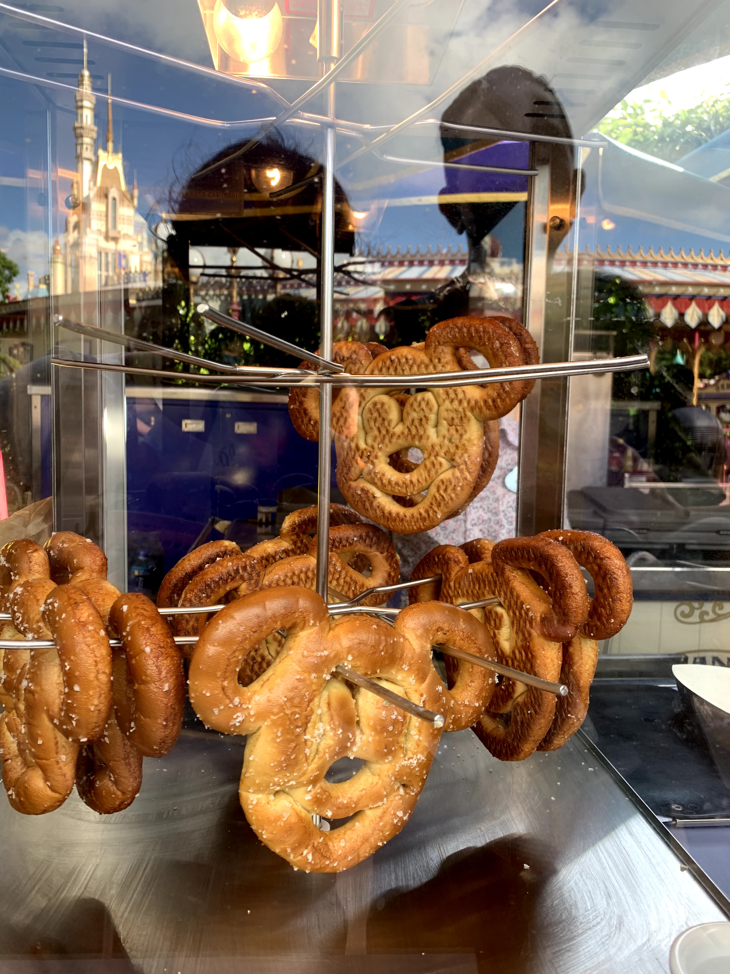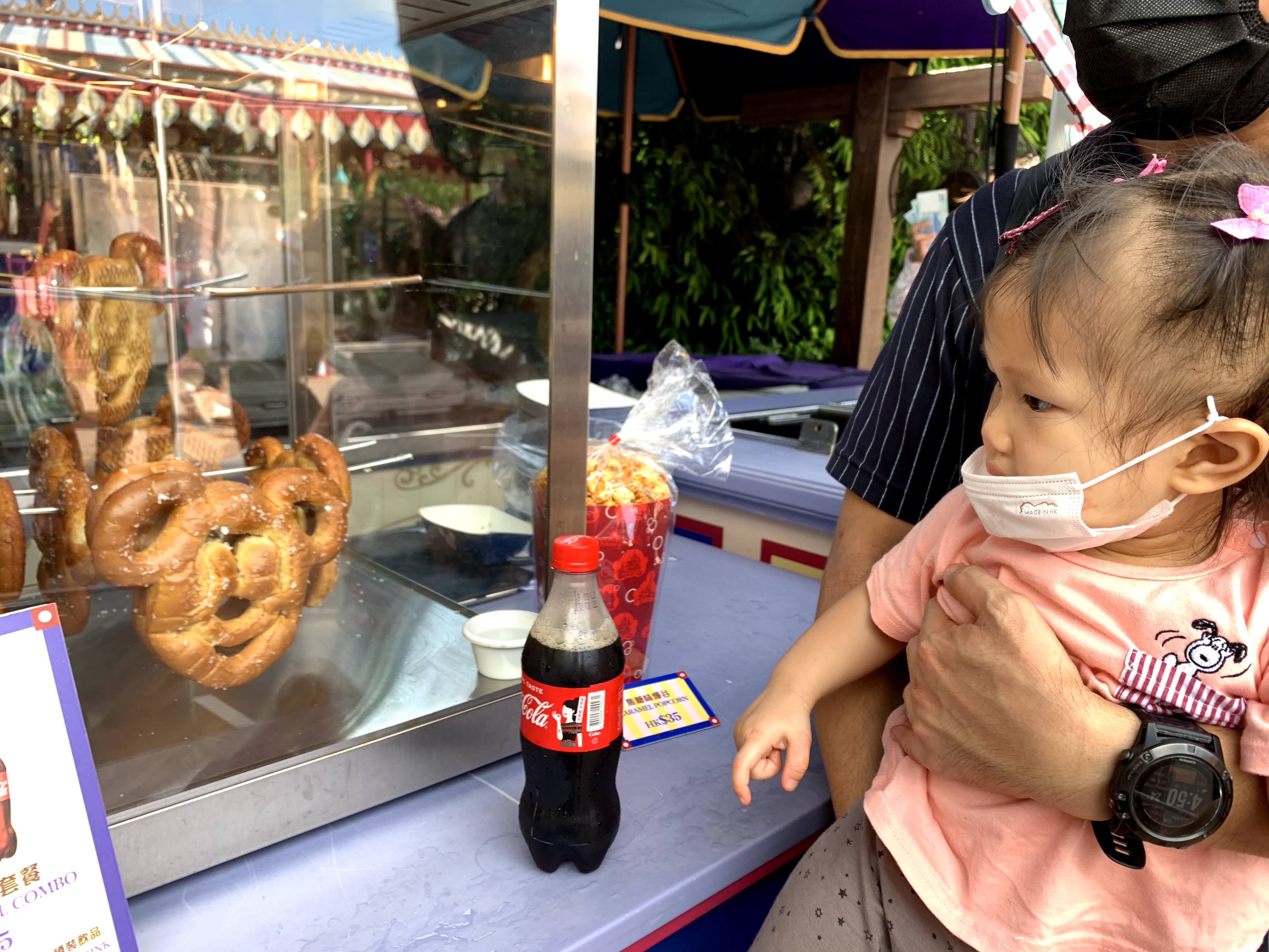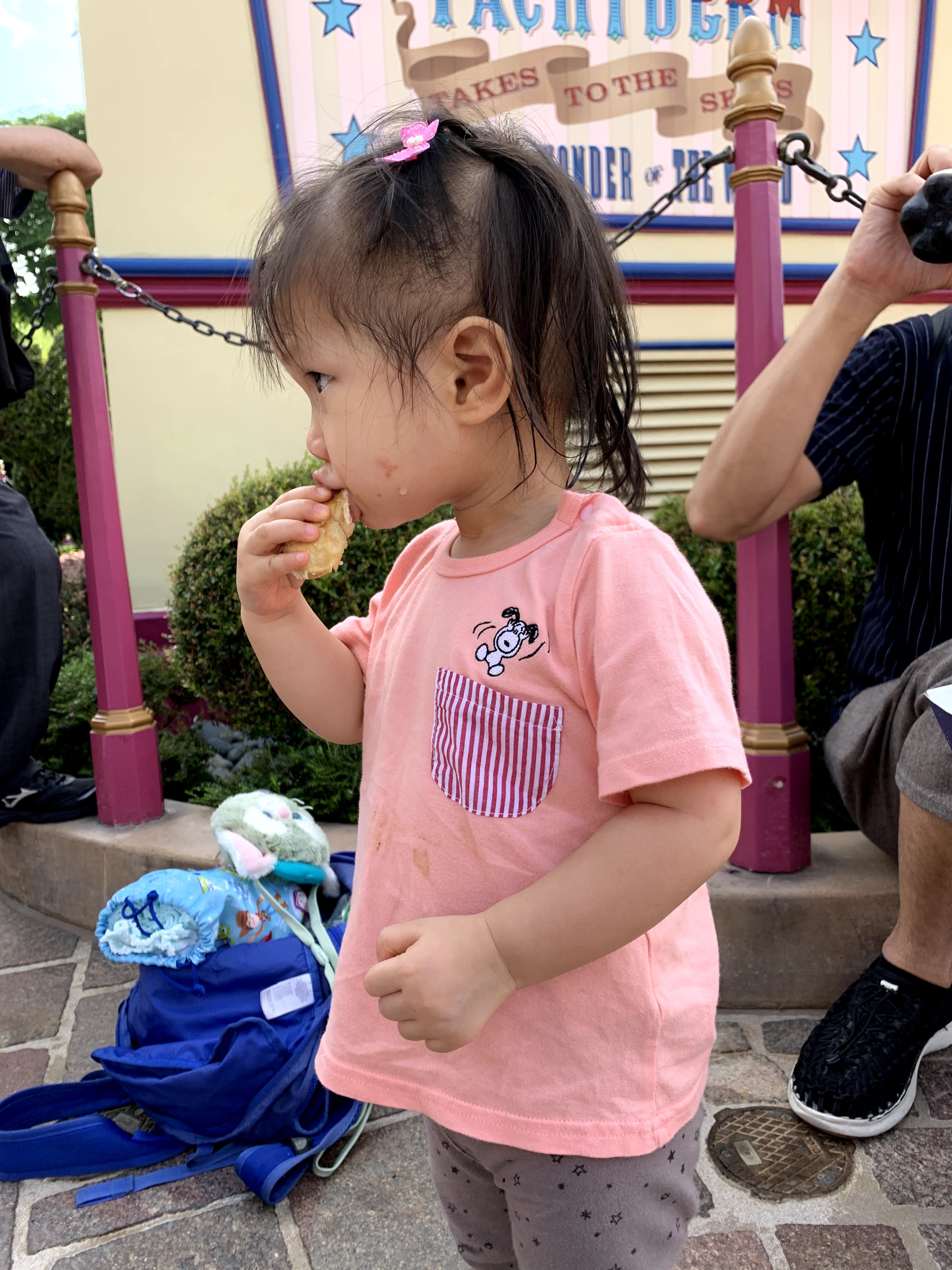 走著走著,又熱又口渴… 天氣酷熱,真的連肚餓的感覺也來得快了。買了小食,是米奇老鼠頭形的麵包,啦啦吃得津津樂道。