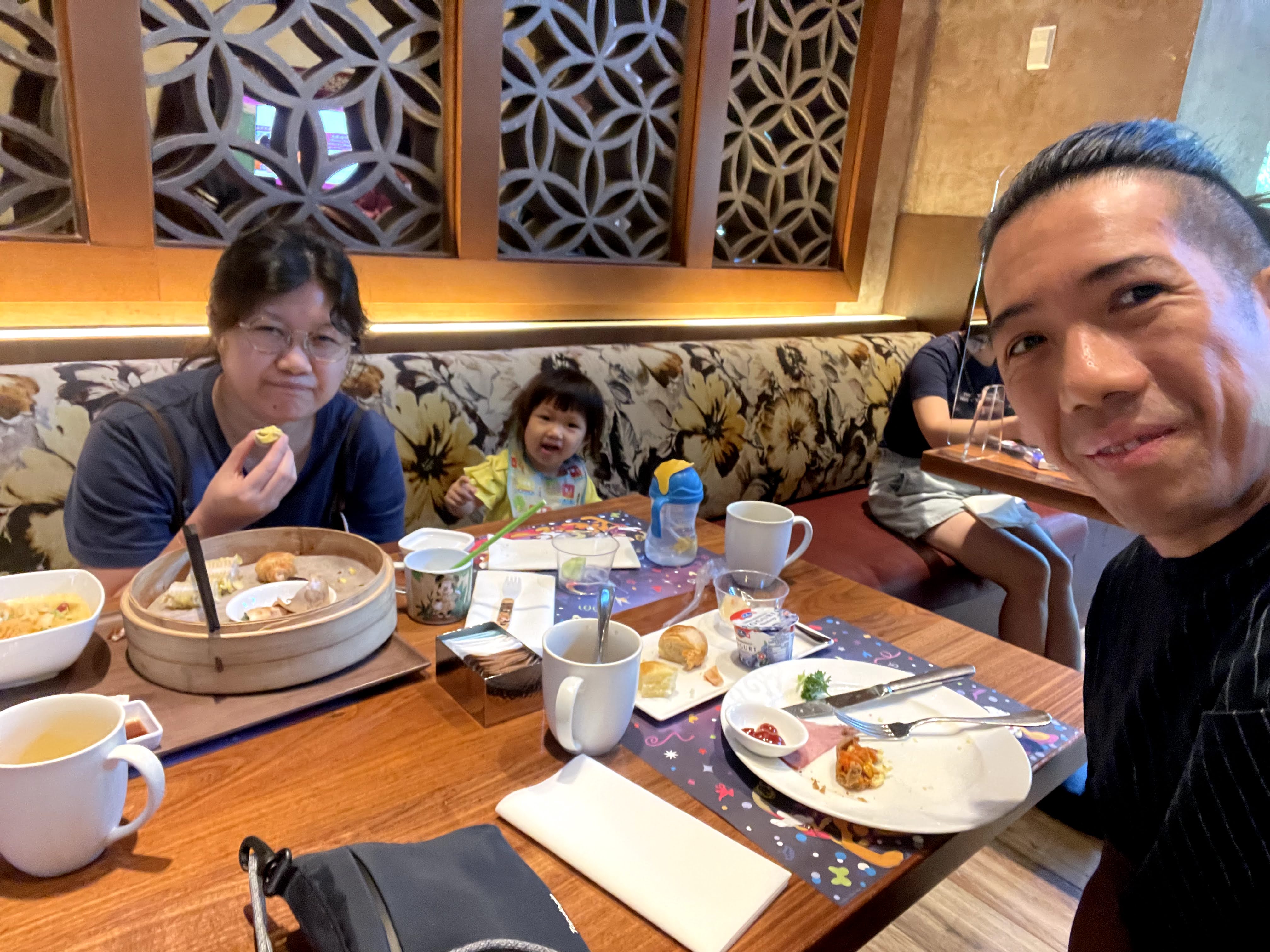 我們的酒店套票包含兩位成人早餐,有中日西式選擇。現在的我點菜都是在想可以分配甚麼給啦啦吃… 我和爸爸要了一份西式和中式早餐。啦啦喜歡吃粟米,那個小豬包也整個被吃掉,還有西式的蛋,生果,乳酪等等她也可以吃。