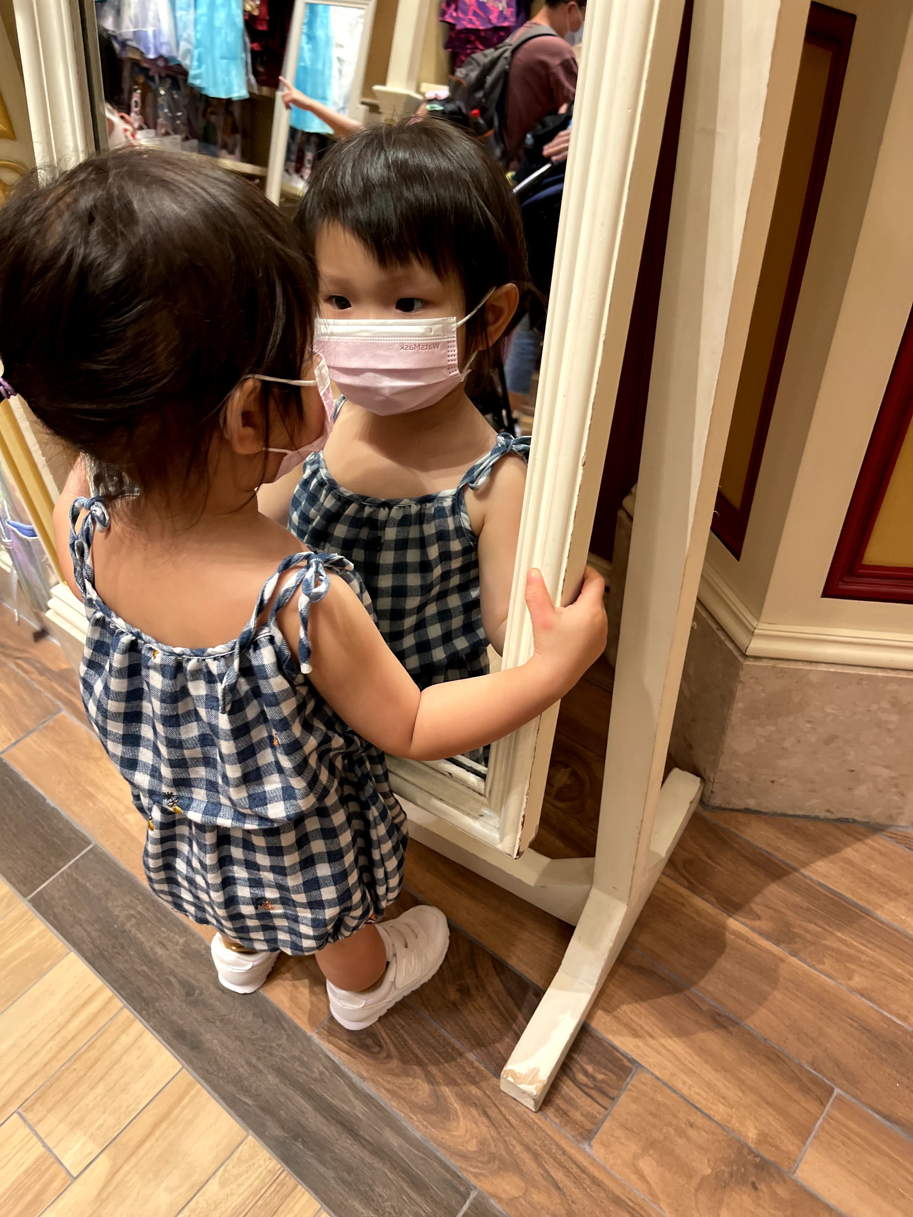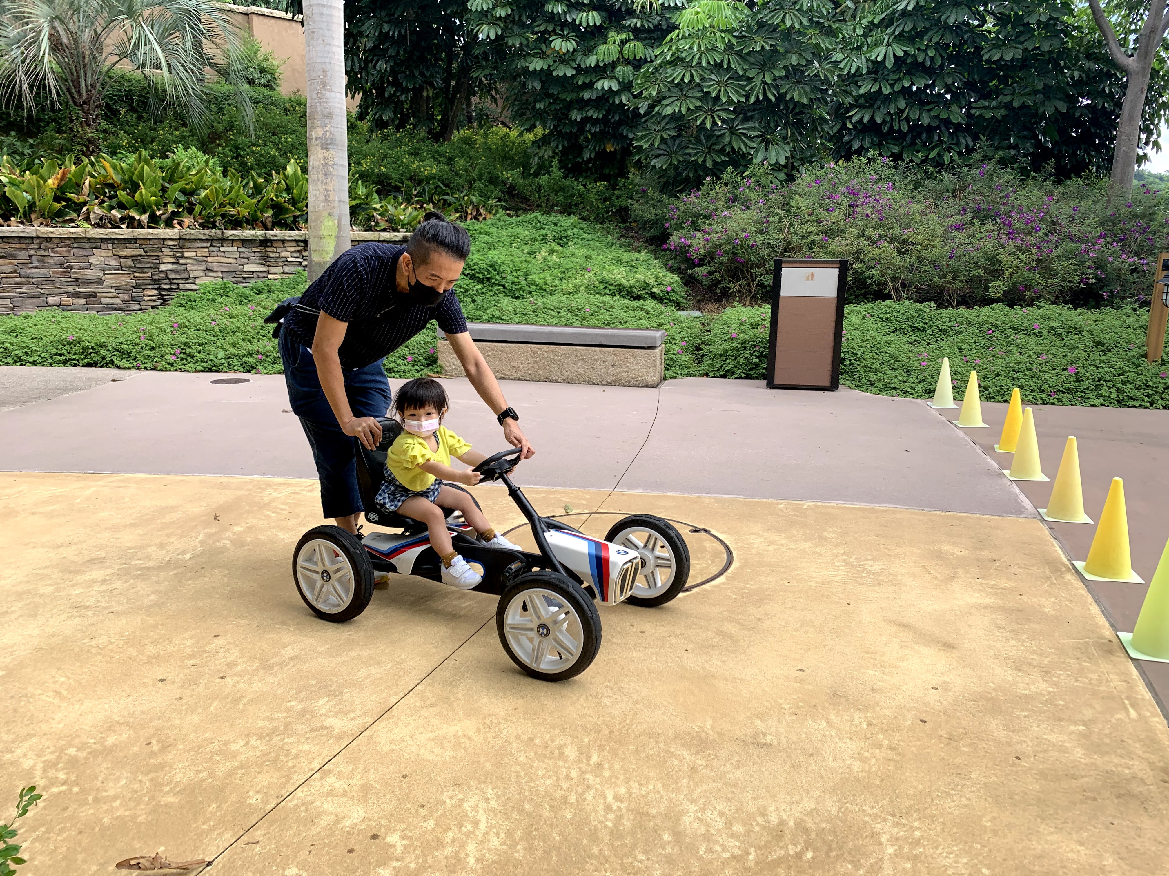 輪到我們了!啦啦的腳其實不夠長踩著踏板,所以由爸爸推著她繞行一圈。她的小手沒離開過軚盤呢!好像會開車的樣子… 玩完後,廸士尼的姐姐問我們要不要玩小 size 的嬰兒車,反正沒有人排隊。我們讓啦啦玩但她完全不感興趣… 長大了!要坐大人的車才滿足!