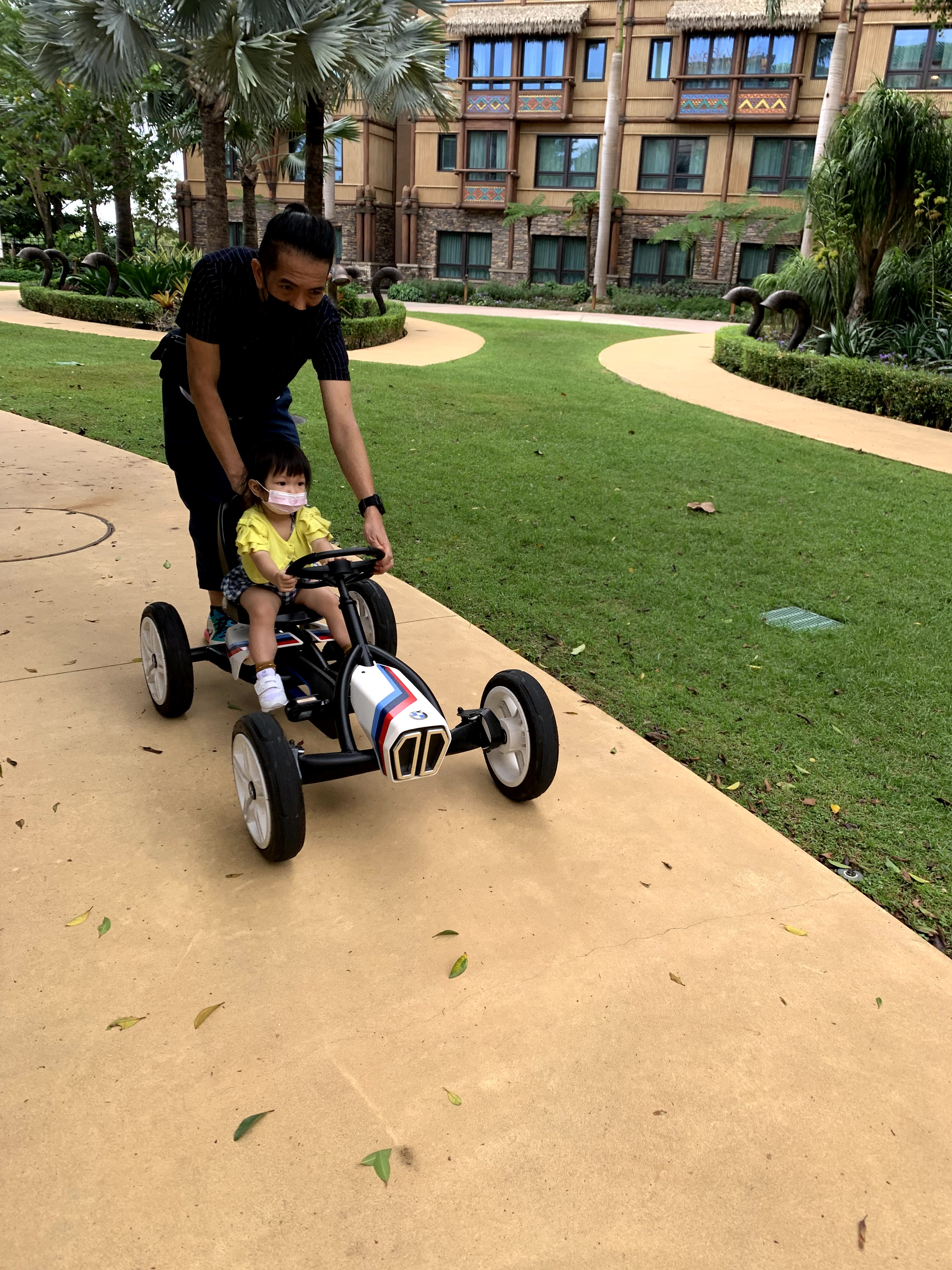 玩了不久後,爸爸說原來到酒店是必要玩高卡車!啦啦也可以玩嗎?20 個月大的 baby… 我們即管去看一看。到達是有條小人龍,幸好天氣還不算太熱,也可以一邊等邊看別人玩。高卡車場除了有下圖見到的車,還有小碼一點的嬰兒玩具車提供。排隊的人當然都是玩大 size 的。